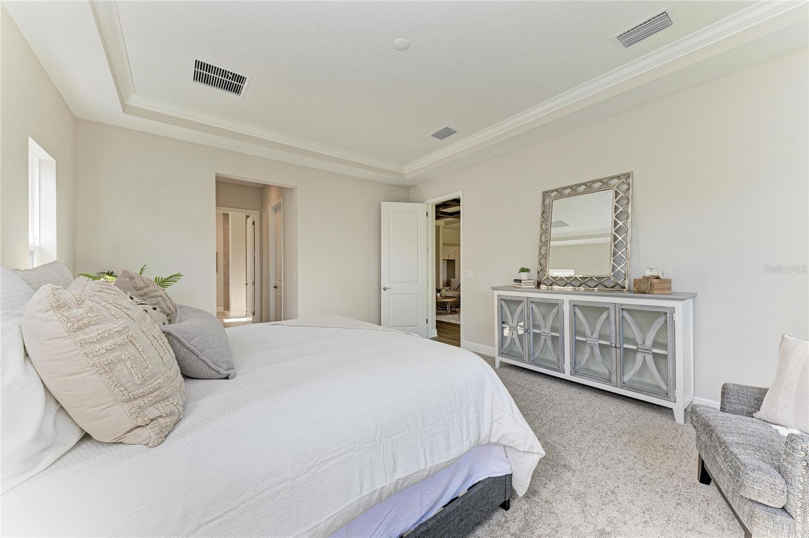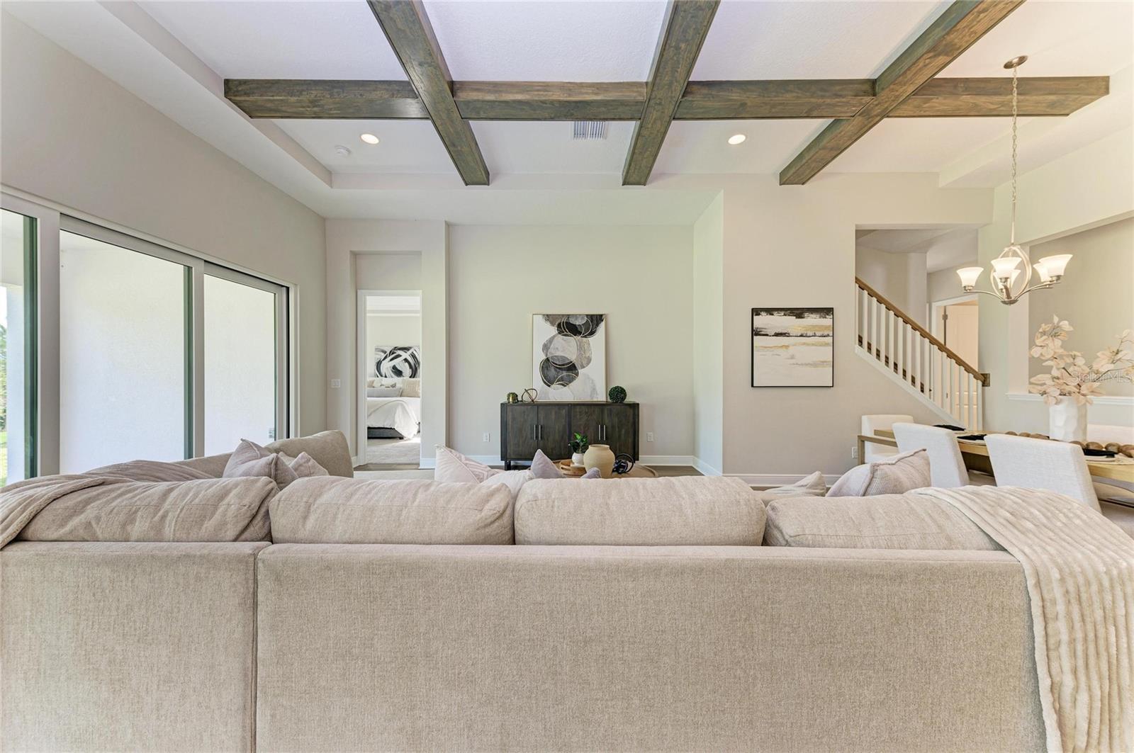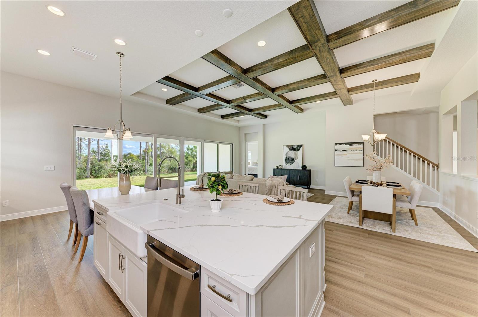 One or more photo(s) has been virtually staged. Biscayne II - Imagine settling into your brand new home right away—the Biscayne II is waiting for you. This two story beauty offers a layout that just makes sense, giving you wide open spaces for gathering while keeping the bedrooms private and quiet. The heart of the home is absolutely stunning: a seamlessly combined grand room, incredible kitchen, and casual dining area, all flowing perfectly out to a large covered lanai for easy outdoor living. You'll love the airy, expansive feeling created by the impressive 12 foot ceilings that soar over the foyer, grand room, and kitchen. When it's time to relax, the owner's retreat is a true sanctuary, boasting huge walk in closets and a luxurious master bath complete with a soothing garden tub and walk in shower. Upstairs, you'll find even more flexibility with a versatile bonus room, a fifth bedroom, and an additional bathroom. Plus, this home is loaded with incredible style, featuring premium selections like Maddox Premium Finish cabinets, sleek New Calacatta MSI Quartz countertops, and warm Nutmeg Luxury Vinyl Plank flooring. And because it comes with built in upgrades like an optional den, an enhanced owner's closet, and an extended lanai, you're getting a home that's truly maximized for comfort and a welcoming atmosphere. This is more than a house; it's the perfect place to start your next chapter. Listing Price amount for this Pending Sale includes Design and Structural Options. Please note: This home is professionally staged.