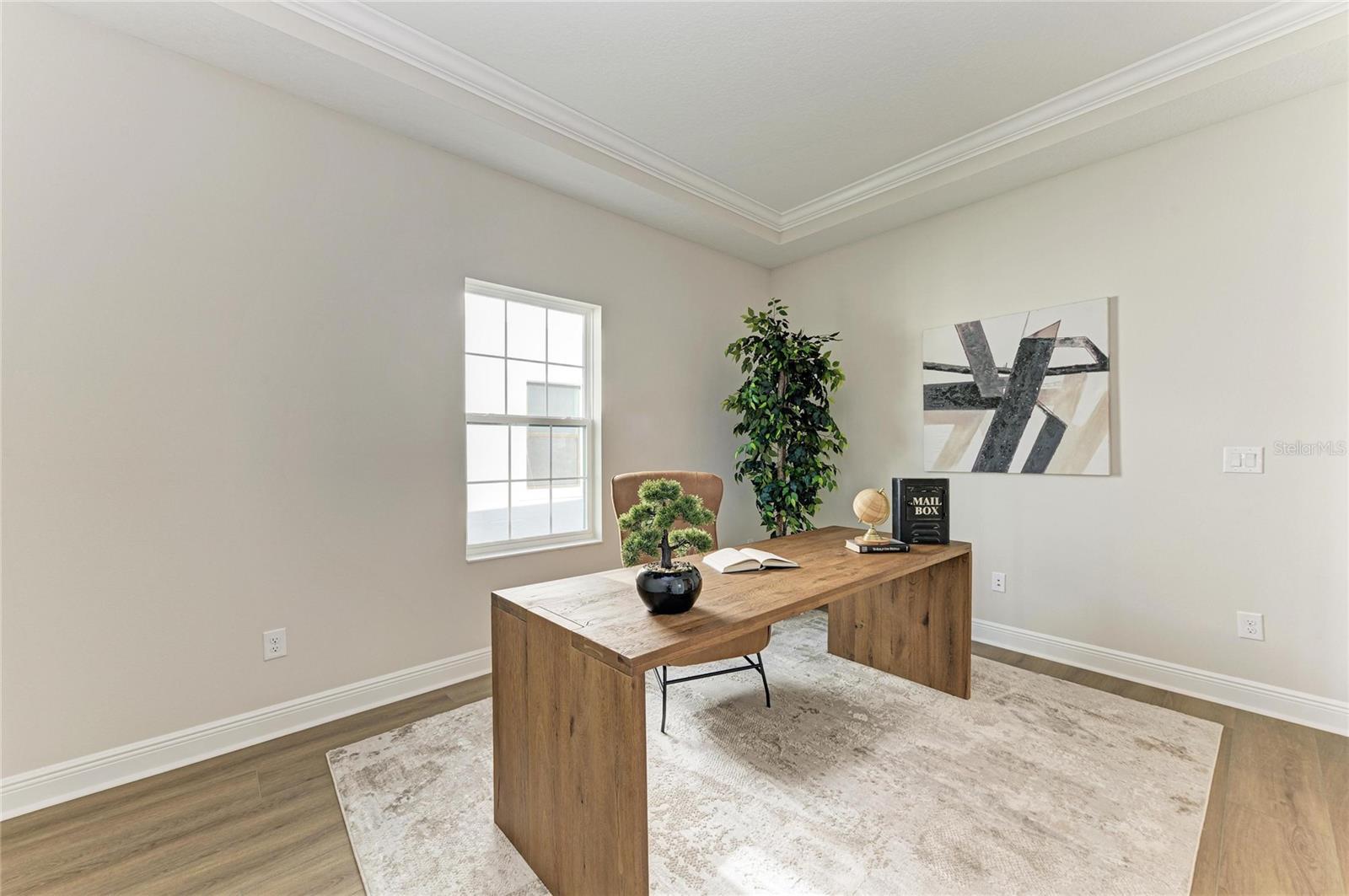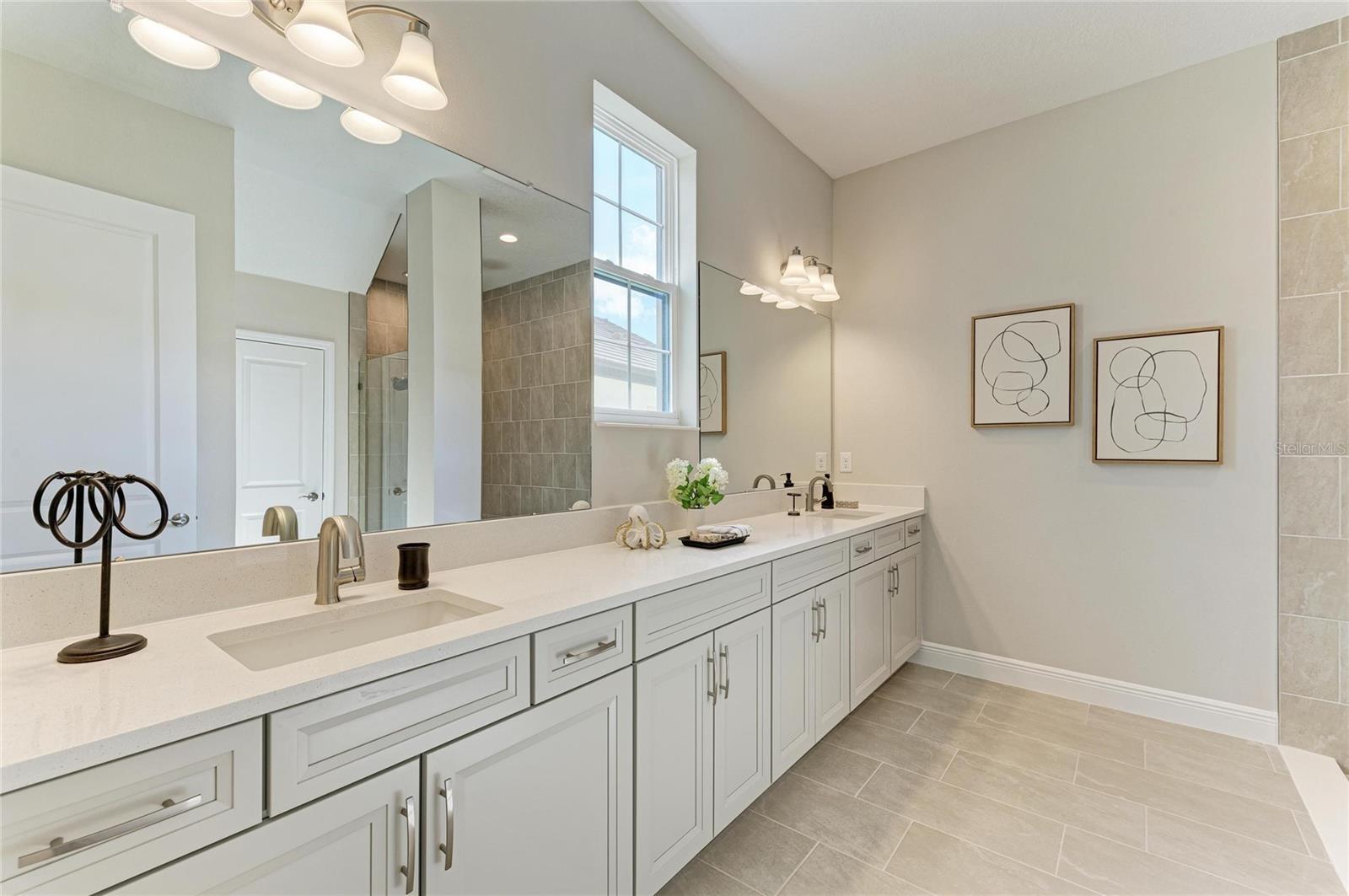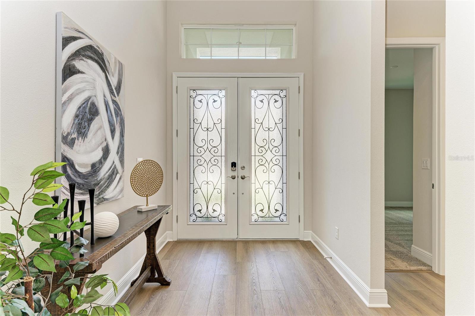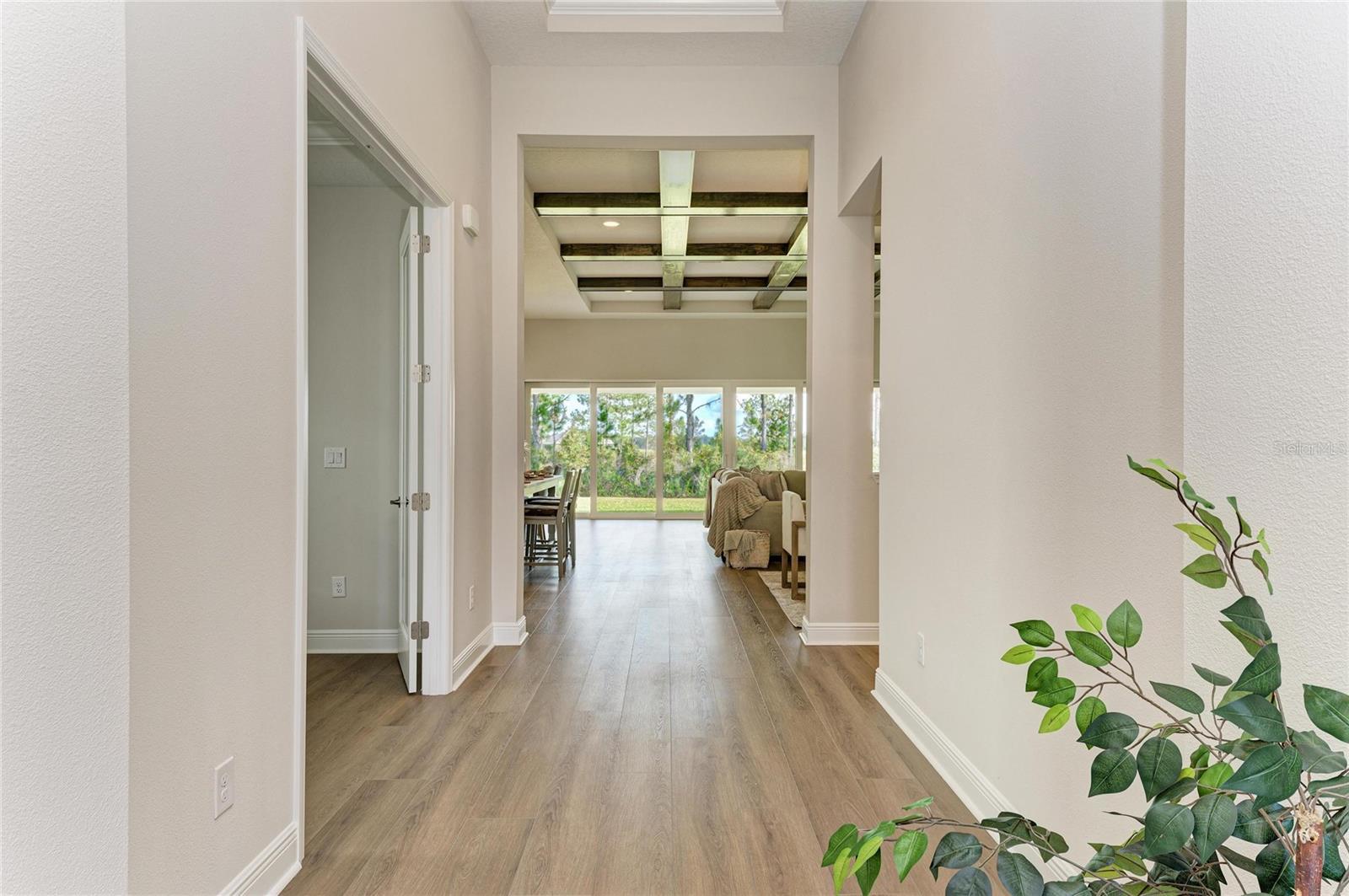 One or more photo(s) has been virtually staged. Biscayne II - Imagine settling into your brand new home right away—the Biscayne II is waiting for you. This two story beauty offers a layout that just makes sense, giving you wide open spaces for gathering while keeping the bedrooms private and quiet. The heart of the home is absolutely stunning: a seamlessly combined grand room, incredible kitchen, and casual dining area, all flowing perfectly out to a large covered lanai for easy outdoor living. You'll love the airy, expansive feeling created by the impressive 12 foot ceilings that soar over the foyer, grand room, and kitchen. When it's time to relax, the owner's retreat is a true sanctuary, boasting huge walk in closets and a luxurious master bath complete with a soothing garden tub and walk in shower. Upstairs, you'll find even more flexibility with a versatile bonus room, a fifth bedroom, and an additional bathroom. Plus, this home is loaded with incredible style, featuring premium selections like Maddox Premium Finish cabinets, sleek New Calacatta MSI Quartz countertops, and warm Nutmeg Luxury Vinyl Plank flooring. And because it comes with built in upgrades like an optional den, an enhanced owner's closet, and an extended lanai, you're getting a home that's truly maximized for comfort and a welcoming atmosphere. This is more than a house; it's the perfect place to start your next chapter. Listing Price amount for this Pending Sale includes Design and Structural Options. Please note: This home is professionally staged.
