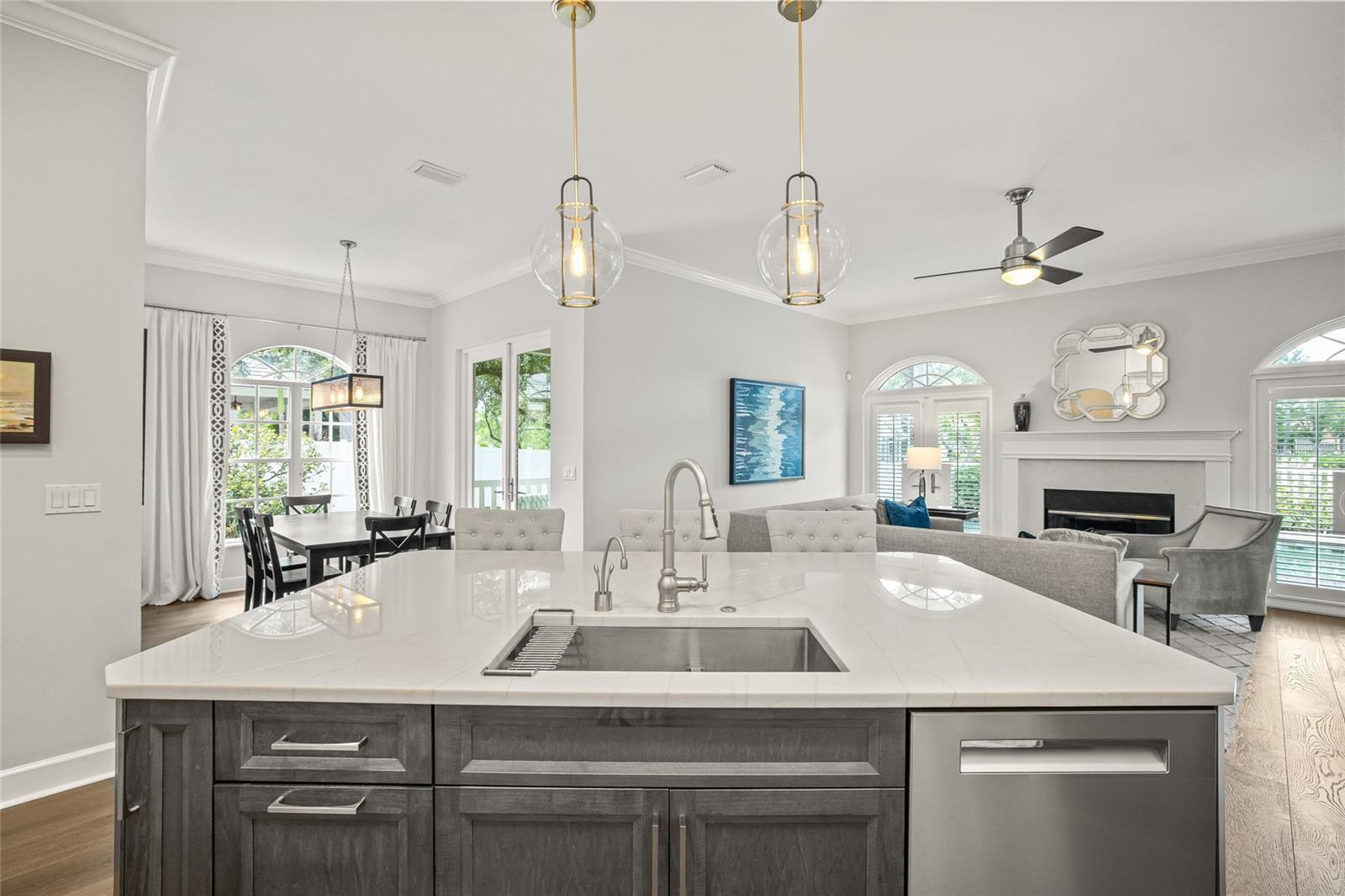 - Cathedral Ceiling(s), Ceiling Fans(s), Eat-in Kitchen, High Ceilings, Kitchen/Family Room Combo, Living Room/Dining Room Combo, PrimaryBedroom Upstairs, Solid Wood Cabinets, Stone Counters, Tray Ceiling(s), Vaulted Ceiling(s), Walk-In Closet(s), Window Treatments