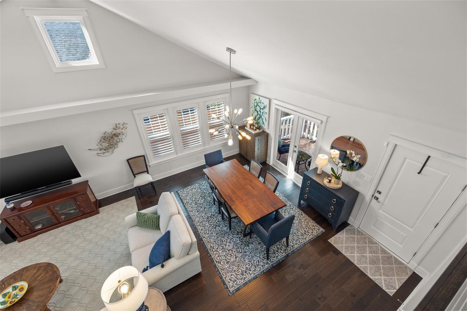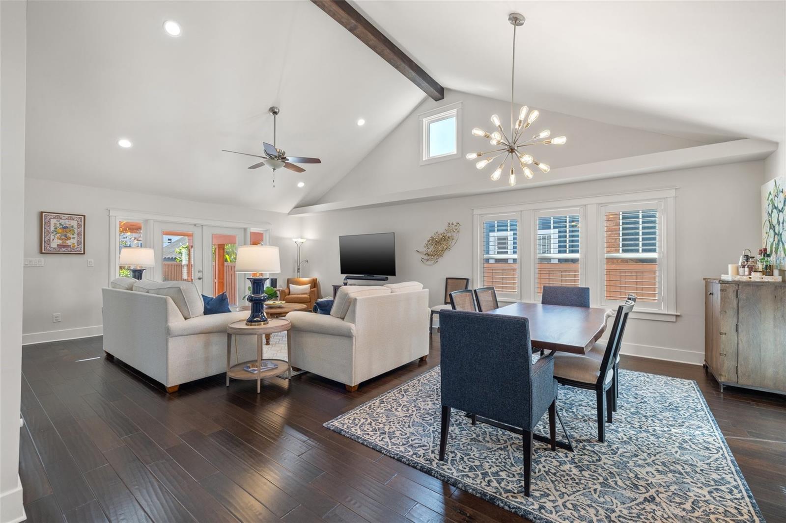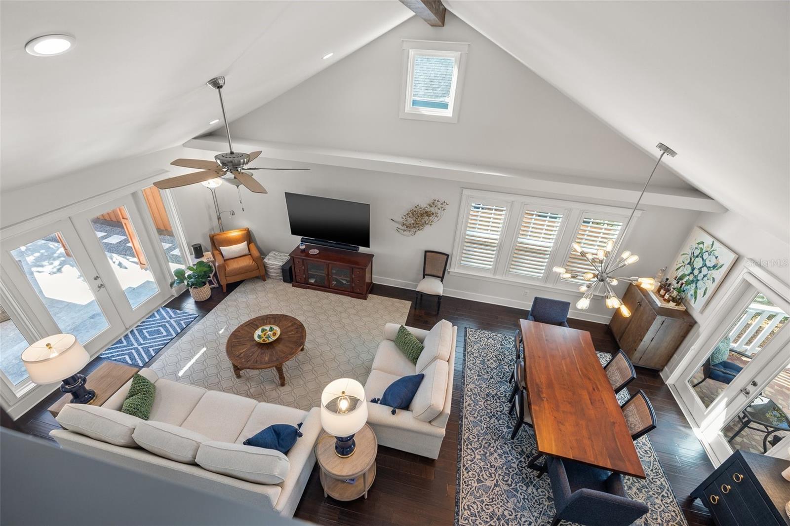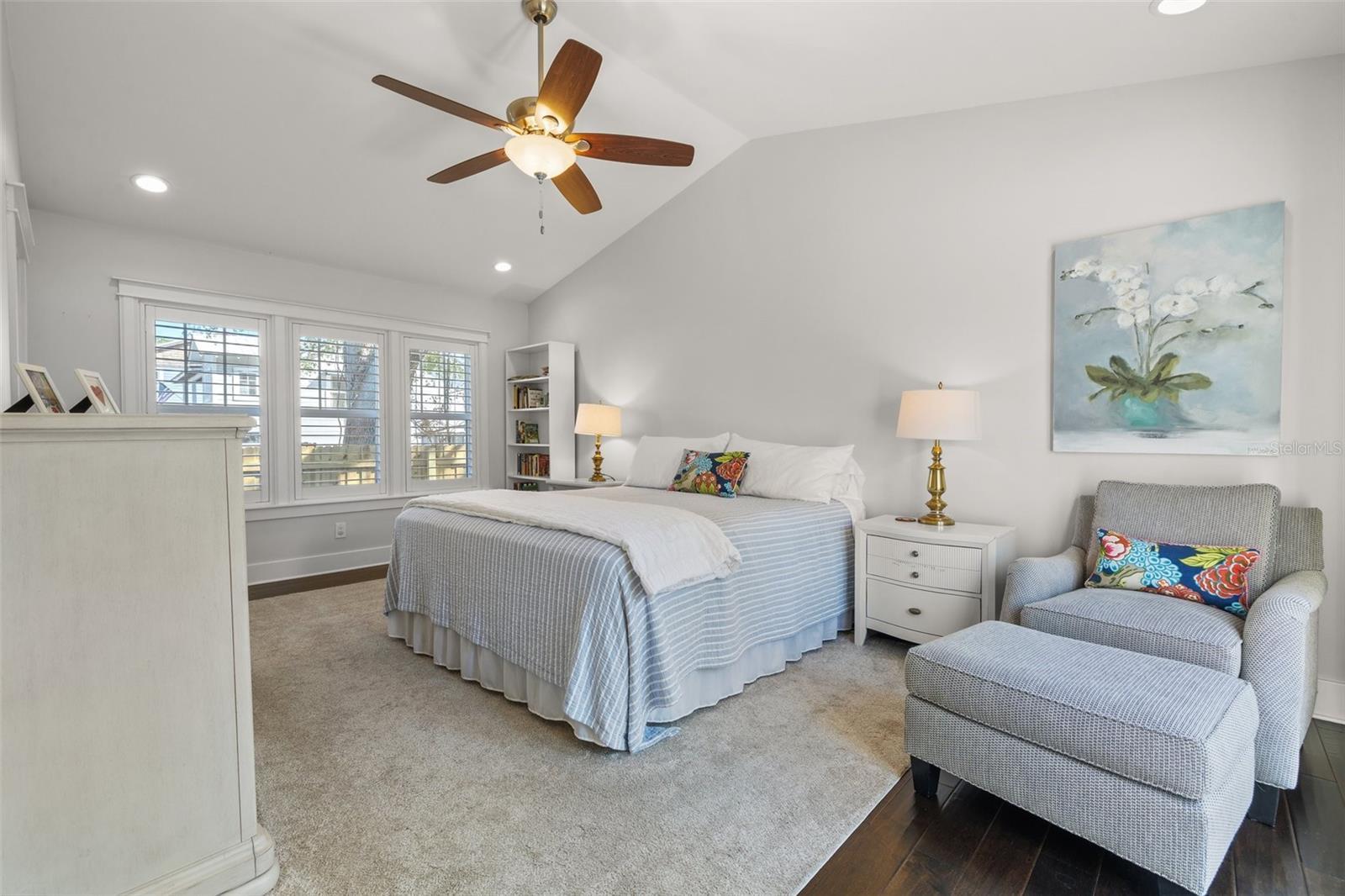 - Ceiling Fans(s), Eat-in Kitchen, High Ceilings, Kitchen/Family Room Combo, Living Room/Dining Room Combo, Open Floorplan, Primary Bedroom Main Floor, Solid Wood Cabinets, Stone Counters, Thermostat, Vaulted Ceiling(s), Walk-In Closet(s), Window Treatments
