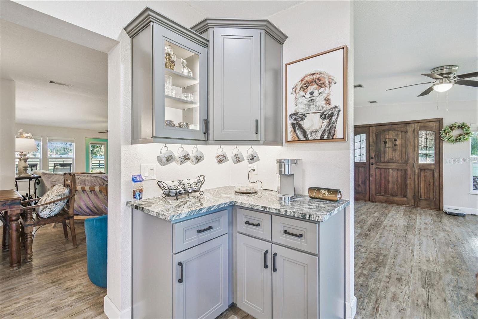 - Ceiling Fans(s), Dry Bar, Eat-in Kitchen, High Ceilings, Open Floorplan, Primary Bedroom Main Floor, Solid Surface Counters, Solid Wood Cabinets, Split Bedroom, Thermostat, Vaulted Ceiling(s), Walk-In Closet(s), Window Treatments