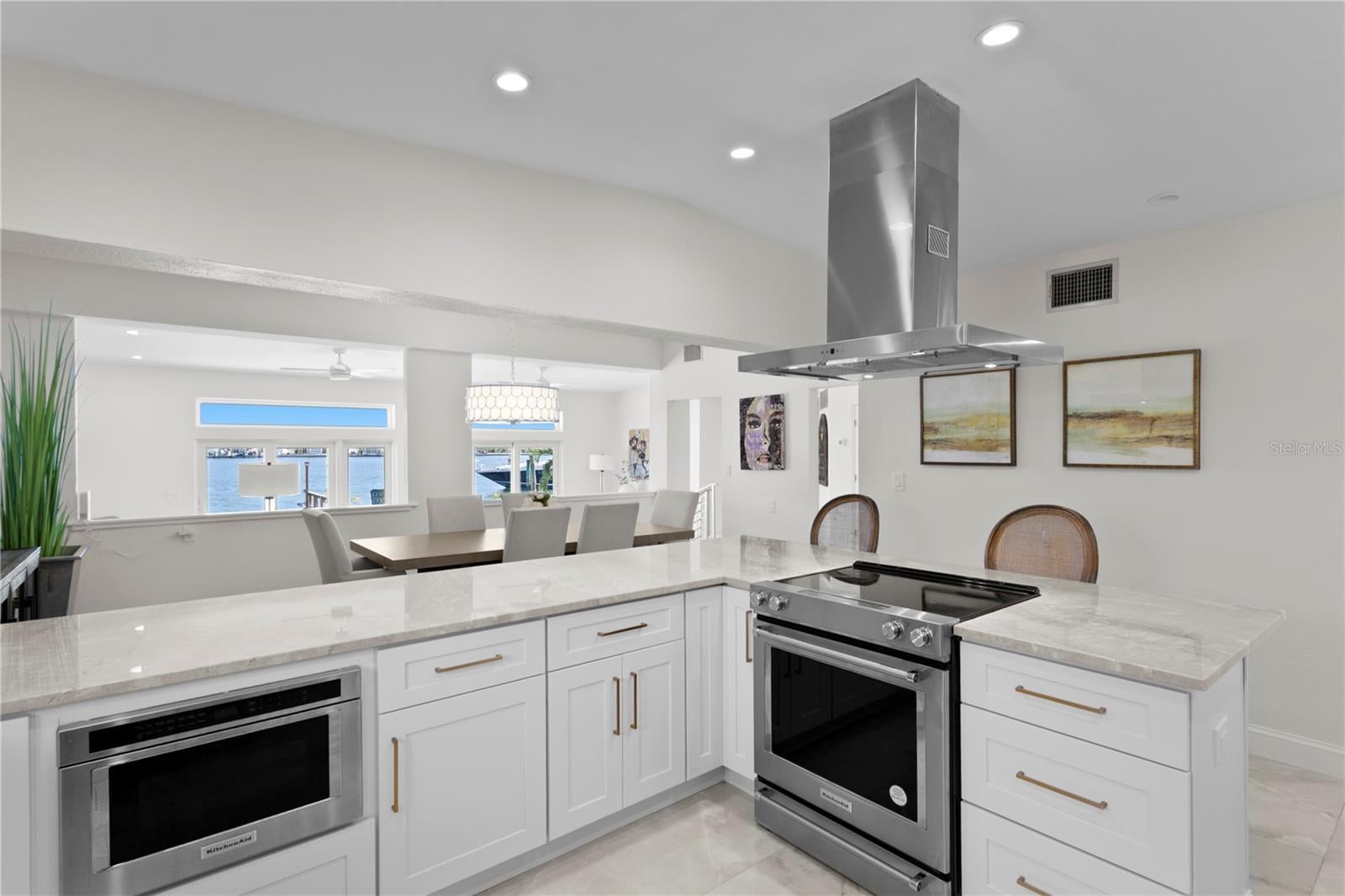 St. Pete Beach Bahia Shores Waterfront. Fully updated contemporary waterfront retreat just a few blocks from the Gulf of Mexico, offering wide-open Boca Ciega Bay views and an unbeatable St. Pete Beach location. This solid concrete-block residence spans just over 3,000 square feet, featuring 3 bedrooms, 3.5 baths, office, high ceilings, and an airy open-concept layout with panoramic water views from nearly every room. All bedrooms have in suite bathrooms. Walls of Andersen hurricane-impact windows and doors fill the home with natural light and frame the sparkling bay and pool beyond. Enjoy modern coastal living with a wood-burning fireplace, 75 feet of waterfront, and a private dock just minutes to the Intracoastal and Gulf. Major 2025 renovations include: Fully remediated and renovated (non-substantial damage permit closed.) Brand-new kitchen with KitchenAid stainless appliances and quartzite countertops and backsplash. Remodeled all bathrooms New interior and exterior paint. New HVAC systems (2) New washer & dryer. New carpet, trim, and interior doors. New pool pump and drainage system (front & rear yards.) New landscaping and lighting. Solar-heated pool (owned solar panels.) Durable metal and membrane roofs (2010) add peace of mind, while the spacious waterfront patio invites effortless indoor-outdoor living. Move-in ready, stylish, and priced right. This is the perfect opportunity to own a fully refreshed coastal home in one of St. Pete Beach’s most desirable neighborhoods.