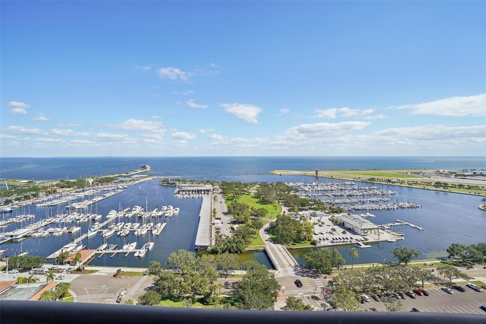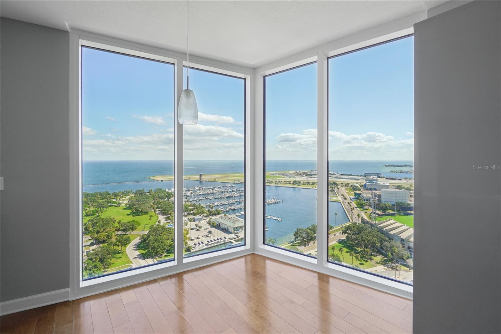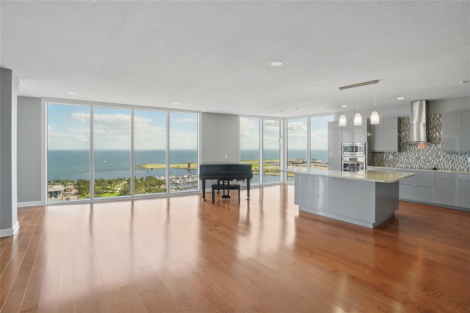 Bayfront Tower - Exceptional Water frontage of Tampa Bay in the heart of Downtown St. Petersburg, open water view 180 degrees. Updated 2 bedroom 2 bathroom with a Den. 1930 sf. Open floor plan with Kitchen moved forward to allow due exceptional view and large island. Split bedrooms, inside laundry room, two full massive bathrooms ensuite. Large walk in closets and dressing areas. New windows, triple-pane, high-efficiency impact-rated windows, newly installed Sprinkler system, manufactured wood floors throughout, Tile baths and carpet in primary. The kitchen is the modern European grey custom cabinetry, lots of counter space and storage, steel appliances, good size balcony that faces East on waterside plenty room for a table and chairs or patio type comfy entertaining. The entire building was updated and is in the process of complying with the required Engineer report. When this building was built unlike many today where there are only penthouses that get to enjoy the panoramic views, on this one all the amenities, a rooftop breathtaking views, head pool, a state-of-the-art fitness center, exercise and massage rooms, a game room, library, full restaurant size party kitchen and dance floor, bar area and running track and walking track on two different floors. With four elevators, one for deliveries, pets with outside access. Covered parking, valet parking, 24 hour security, concierge and wonderful maintenance men. St Petersburg has side walk cafe’s, a gastronomic access to world class dining. Waterfront parks, museums, orchestra, opera, live theater and more. Treat yourself to luxury at its finest at an amazing affordable price.