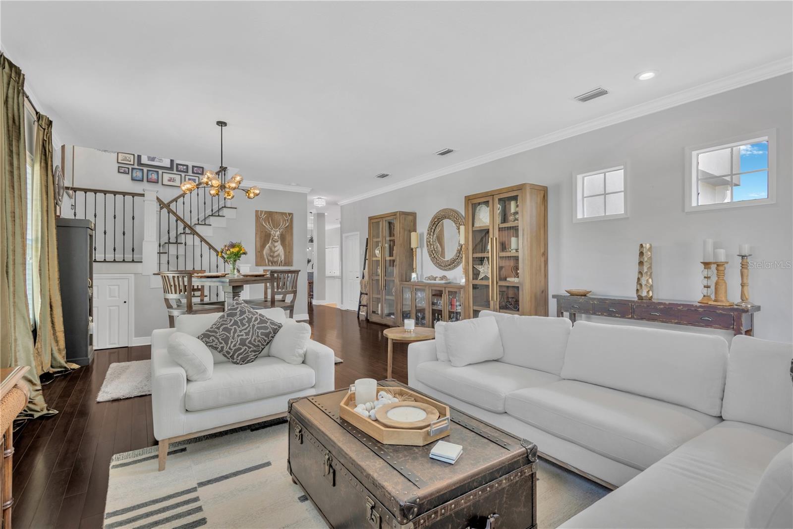 - Built-in Features, Ceiling Fans(s), Coffered Ceiling(s), Crown Molding, Eat-in Kitchen, High Ceilings, Kitchen/Family Room Combo, Living Room/Dining Room Combo, Open Floorplan, PrimaryBedroom Upstairs, Solid Surface Counters, Thermostat, Tray Ceiling(s), Walk-In Closet(s)