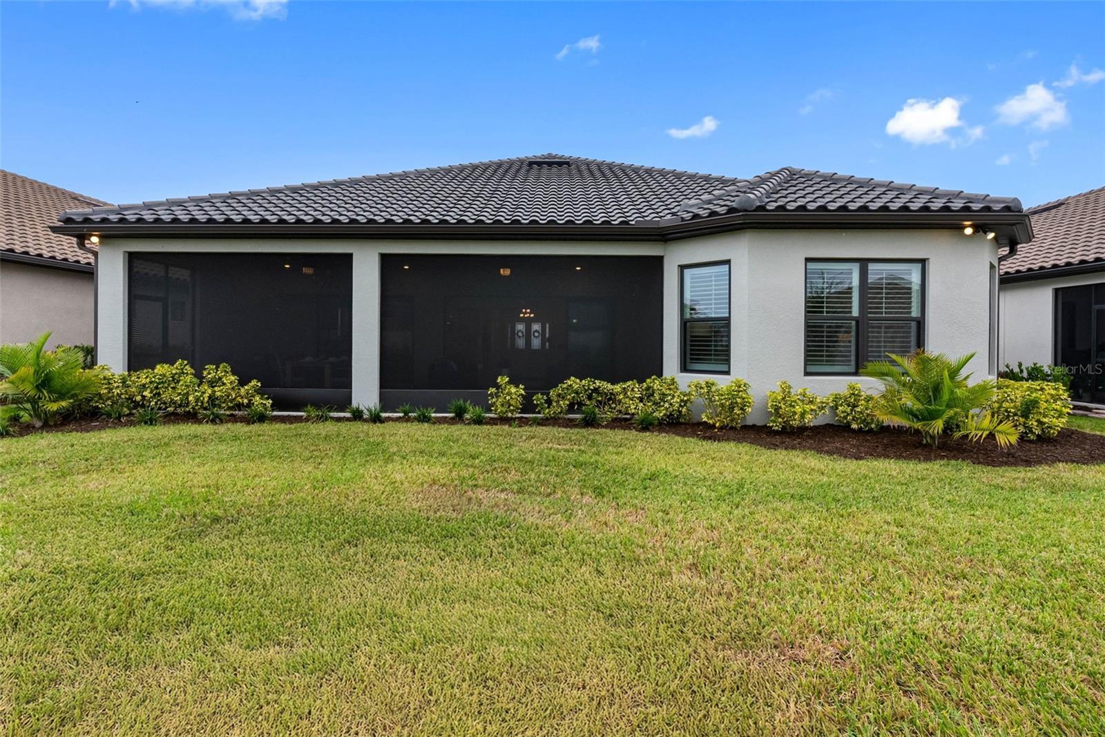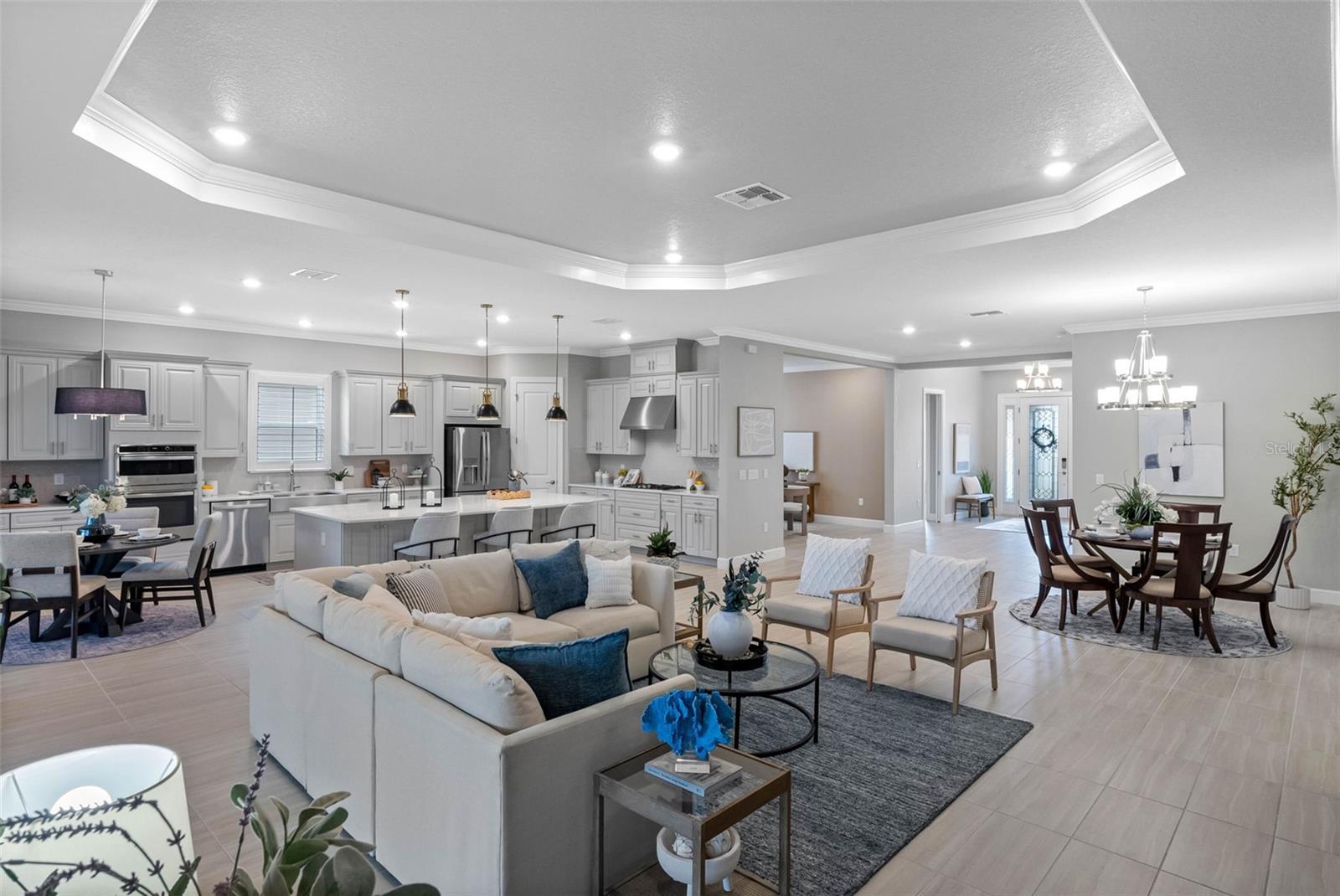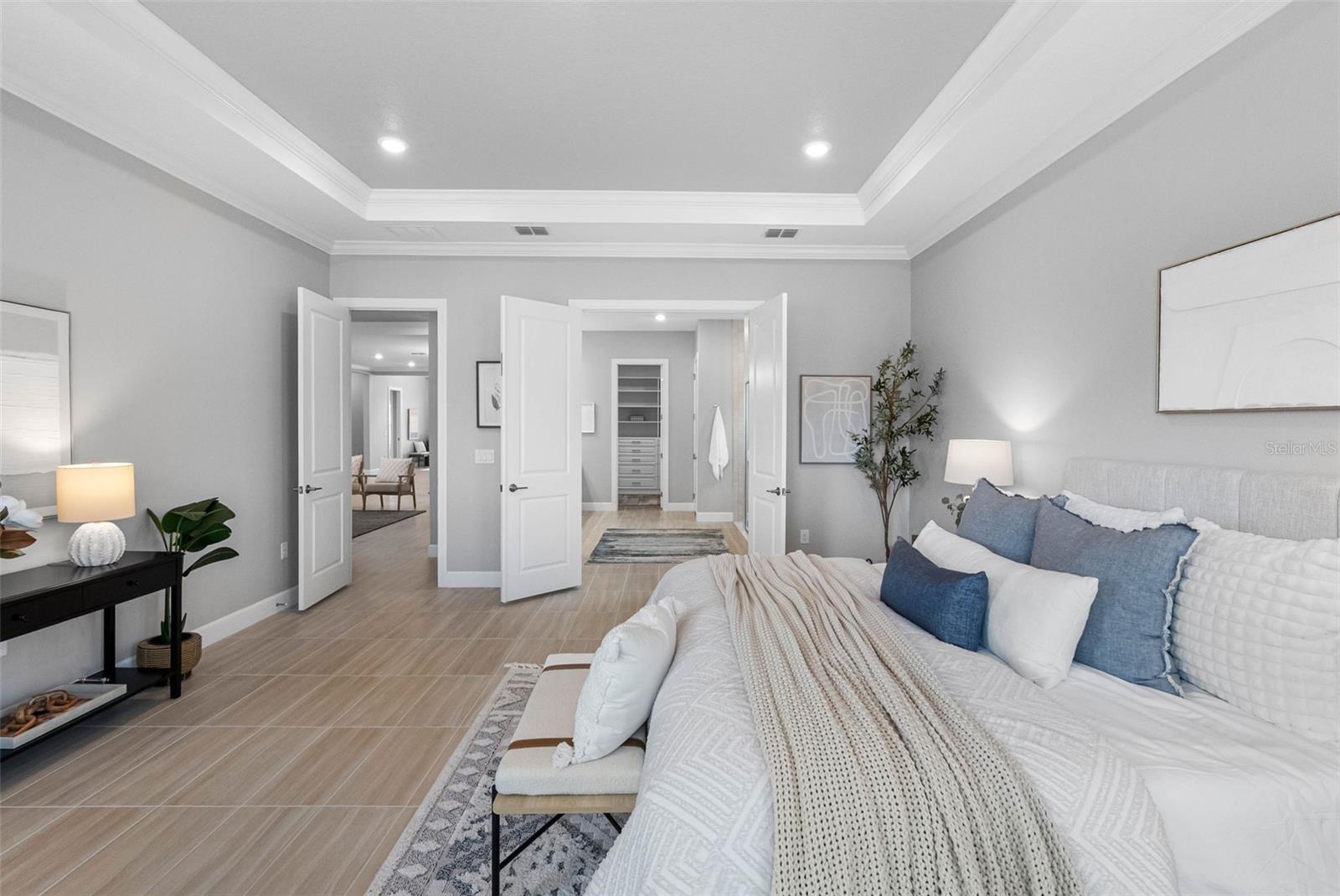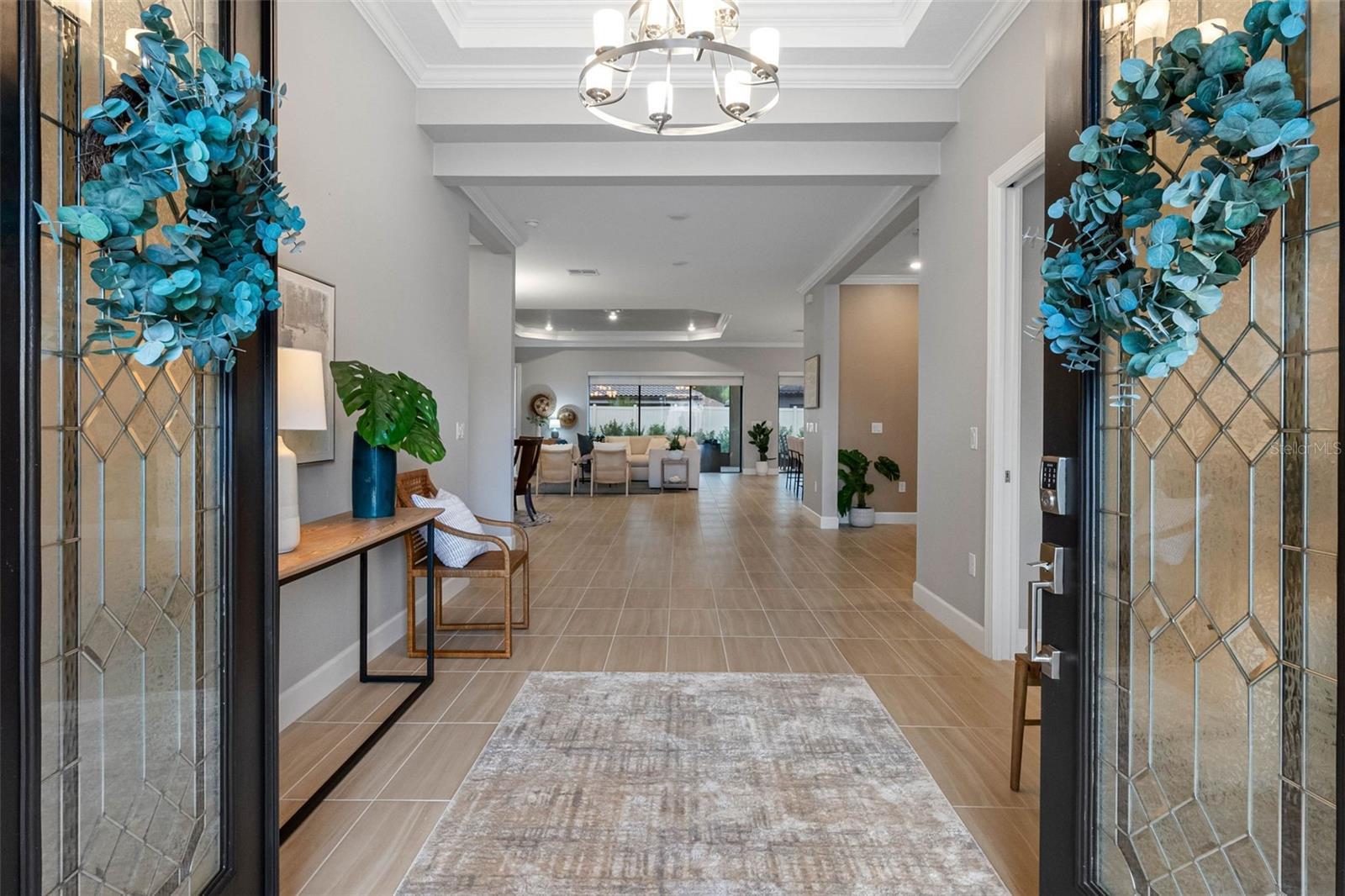 Embrace the luxury of resort-style living in this Taylor Morrison-built Pallazio model located in the gated 55+ community of Esplanade at Wiregrass Ranch. This Mediterranean-inspired home offers 3 bedrooms, 3 bathrooms, and 3,087 square feet of beautifully designed living space. From the moment you enter through the courtyard’s wrought-iron gate and the striking glass double front doors, you’ll be greeted by elegance and attention to detail throughout. Inside, crown molding, 8-foot doors, and tile flooring flow seamlessly across the open-concept layout. The great room features a custom media wall with TV mount and electric fireplace, creating a warm and inviting atmosphere. Electric blinds on the sliding glass doors open to the extended covered patio, offering panoramic screening, ceramic tile flooring, and pre-plumbing for an outdoor kitchen—ideal for entertaining or relaxing outdoors. The gourmet kitchen is a chef’s dream, showcasing top-of-the-line cabinetry, quartz countertops, stainless steel appliances, and a gas cooktop with stainless vent hood. A spacious island with pendant lighting opens to the great room and dining area, perfect for gatherings. The primary suite serves as a private retreat with tray ceilings, a custom closet system, and a spa-inspired bath featuring an oversized glass-enclosed shower and dual vanities. The flex room off the foyer is ideal for an office or reading area. Two guest bedrooms are thoughtfully positioned on opposite sides of the home—one with private bath access and the other an ensuite. All bathrooms continue the luxurious theme with matching quartz surfaces and upscale finishes. Additional highlights include plantation shutters, a large laundry room with built-in cabinets and sink, and a two-car garage. Paver driveway and walkway, paired with lush landscaping, enhance the home’s pristine curb appeal. Residents of Esplanade at Wiregrass Ranch enjoy an exceptional 55+ lifestyle with resort-style amenities, wellness programs, and endless opportunities for recreation and connection. Live every day to the fullest in a community designed to invigorate the mind, body, and spirit.