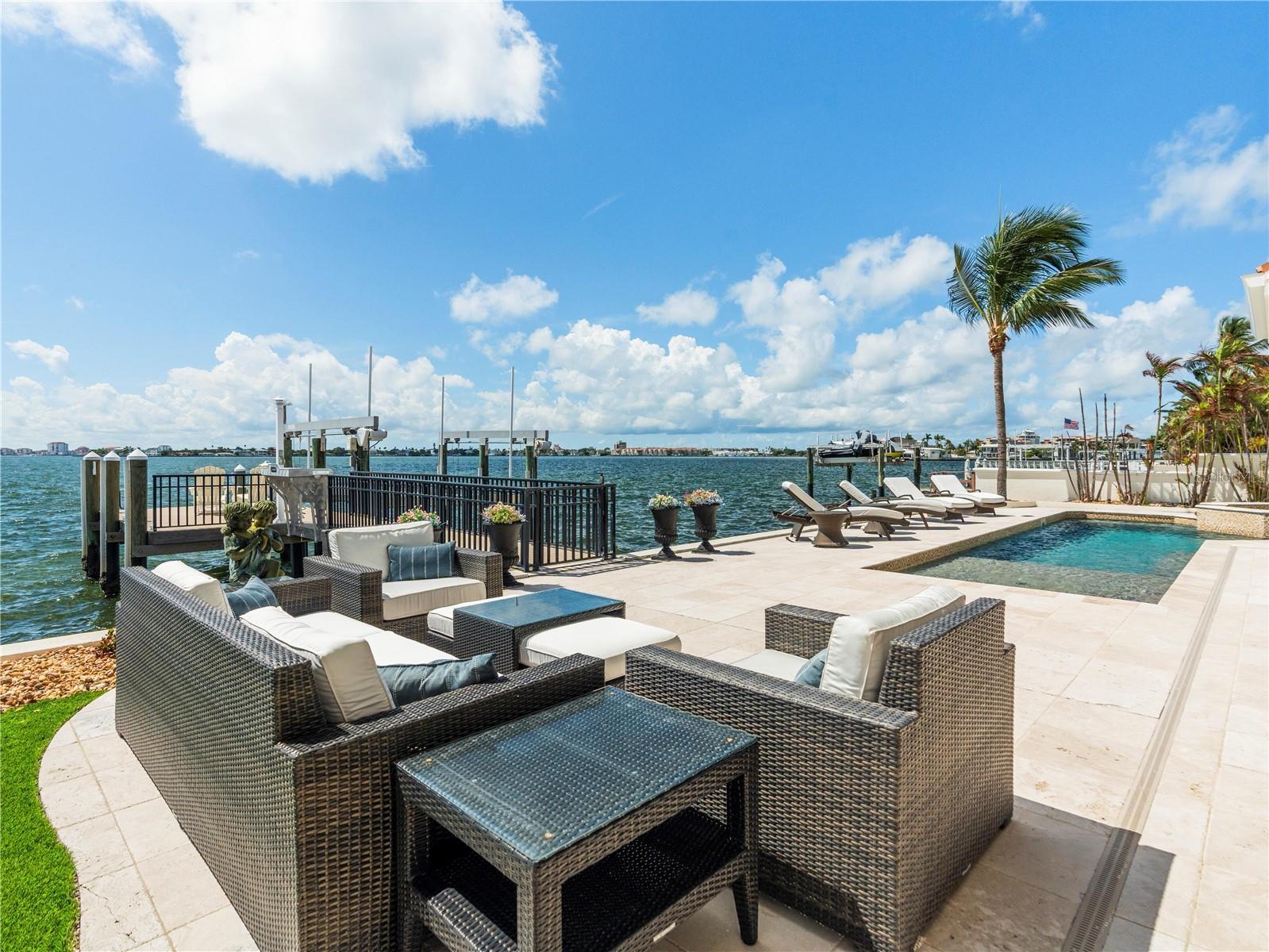 This exceptional waterfront estate in Brightwater Beach Estates offers the ultimate blend of luxury, comfort, and coastal living. Positioned on deep, open water with panoramic views of Boca Ciega Bay and the iconic Don Cesar, this home delivers a true resort-style experience in one of St. Pete Beach’s most desirable neighborhoods. Just steps across the street from the sandy Gulf beaches, you’ll enjoy the rare convenience of both beach and boating lifestyle. Walk to shoreline sunsets, beach cafés, shopping, and entertainment — and you're only a short drive to Downtown St. Pete, known for its arts, dining, waterfront parks, and vibrant culture. Inside, soaring ceilings and expansive windows fill the home with natural light and showcase the stunning water views. The gourmet kitchen is equipped with Sub-Zero, Wolf, and Bosch appliances, including a gas cooktop, custom cabinetry, and elegant stone finishes. The main-level primary suite provides private waterfront views along with a spa-inspired bath and custom walk-in dressing room. The upper level is designed for entertaining — offering a spacious media/game lounge, wet bar, guest suite, and a private balcony overlooking the bay. Step outdoors to your private waterfront oasis featuring a heated PebbleTec saltwater pool & spa, multiple outdoor seating and dining areas, lush tropical landscaping, and a new composite dock with water, electric, and a 20,000 lb boat lift providing quick access to the Gulf. Additional highlights include hurricane impact windows & doors, smart home automation, travertine flooring, plantation shutters, custom lighting, newer roof with hurricane clips, and a 4-car garage with ceiling height ideal for vehicle lifts — perfect for car collectors. This newly refinished estate delivers luxury, lifestyle, and location — all in one spectacular, turn-key waterfront residence. Buyer to verify all dimensions and sf are approximate originally built in 1969 newly reovated and meticulously rebuilt from bottom up in 2018