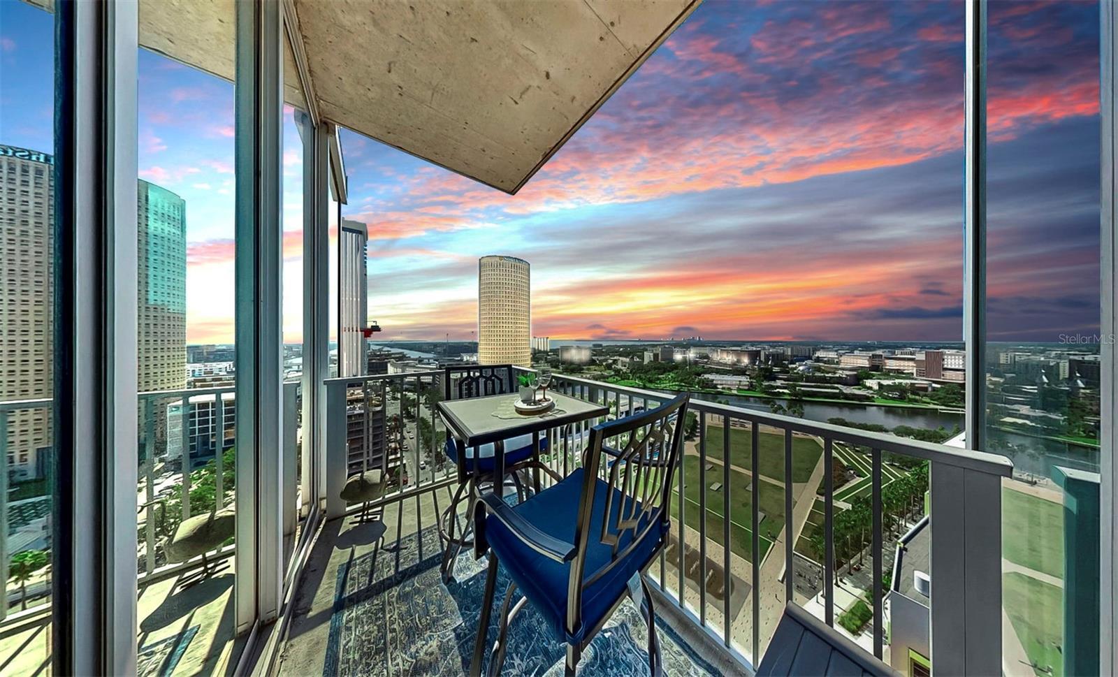 Experience elevated urban living in this corner 2-bedroom, 2-bath residence on the 17th floor of SkyPoint, showcasing a PRIVATE WEST FACING balcony offers daily sunset unobstructed panoramic views through the 14' floor to ceiling IMPACT GLASS to Tampa Bay, the Downtown skyline, Hillsborough River, Curtis Hixon waterfront Park, University of Tampa; one of the most distinctive and upscale condos in the heart of Downtown Tampa! The sophisticated design interior spans at 1110 sf, thoughtfully upgraded with renovated wood plank tile flooring throughout, refined industrial-style concrete ceilings, remote operated Sunshades, fresh interior paint, and a true split-bedroom layout offering privacy and flexible living. Enter through a generous 10'.5" foyer leading to the chef inspired kitchen features GE Profile stainless steel appliances, a waterfall-edge island with extended breakfast bar seating, custom cabinetry with spice pull-out, expanded drawer storage, tile backsplash, pendant and recessed lighting, custom hardware, and a touchless Moen faucet overlooking the perfect entertainment/living room space with optional dining open to the spacious balcony with unobstructed views. This split floorplan offers an oversized Primary suite with a 3-foot architectural kick-out/ledge, expansive tall vanity DUAL sterling Sinks, Private Garden soaking tub, separate walk-in glass encased shower with WALK-IN CLOSET! Both bedrooms feature private en-suite bathrooms/Guest Suite or Ensuite OPTION with Linen Closet! Entire unit offers floor-to-ceiling breathtaking backdrops! Additional features include Hampton Bay ceiling fans, floor outlets for flexible furniture placement, Walk-in Pantry, Laundry Closet including new Maytag Washer/Dryer plus amble storage. SkyPoint provides unmatched amenities including 24-hour concierge, controlled building access, billiards room, theater room, club lounge, grilling stations, fire pits, and multiple indoor and outdoor social spaces. Saltwater hot tub, Pool, Outdoor grilling stations, Outdoor kitchen, and a beautifully landscaped park in the sky. State-of-the-art dual fitness center, a residents' clubhouse with a catering kitchen & bar, lounges, and a private theater room. Embrace the city's best attractions, with easy access to the trolley, water taxi, and Tampa International Airport. This meticulously renovated residence is your gateway to the very best of Tampa, offering a turnkey experience in a world-class location. Two assigned parking spaces in the secured garage are included. Located in the heart of Downtown Tampa, steps from public transit, the Tampa Riverwalk, Curtis Hixon Park, Straz Center, Amalie Arena, Armature Works, Water Street, Channelside, restaurants, and cultural venues. Pet friendly building. Condo fee includes; maintenance, roof, trash, water/sewer and cable! The ground floor is home to a variety of dining options, and the vibrant culture of Downtown Tampa—with its festivals Move-in ready and available for immediate occupancy. Book your exclusive SUNSET showing because this view deserves to be experienced in person.