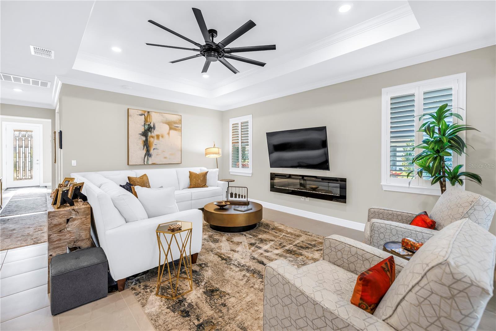 - Built-in Features, Ceiling Fans(s), Crown Molding, High Ceilings, Kitchen/Family Room Combo, Open Floorplan, Pest Guard System, Primary Bedroom Main Floor, Split Bedroom, Stone Counters, Thermostat, Tray Ceiling(s), Walk-In Closet(s), Window Treatments