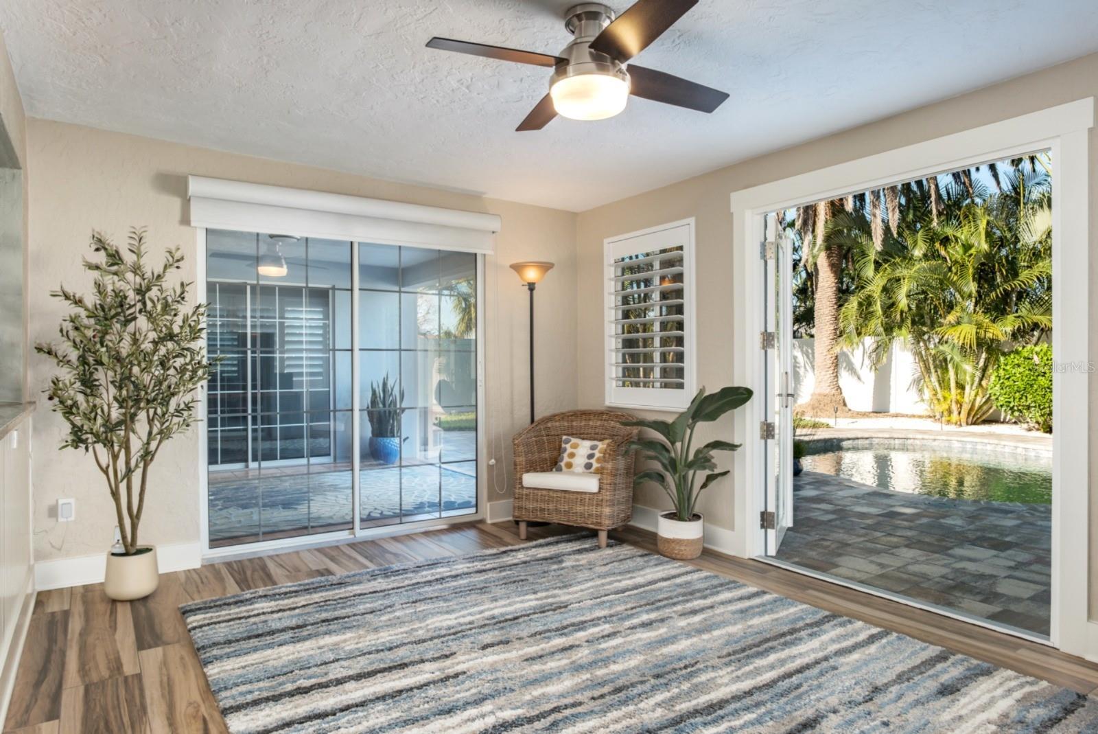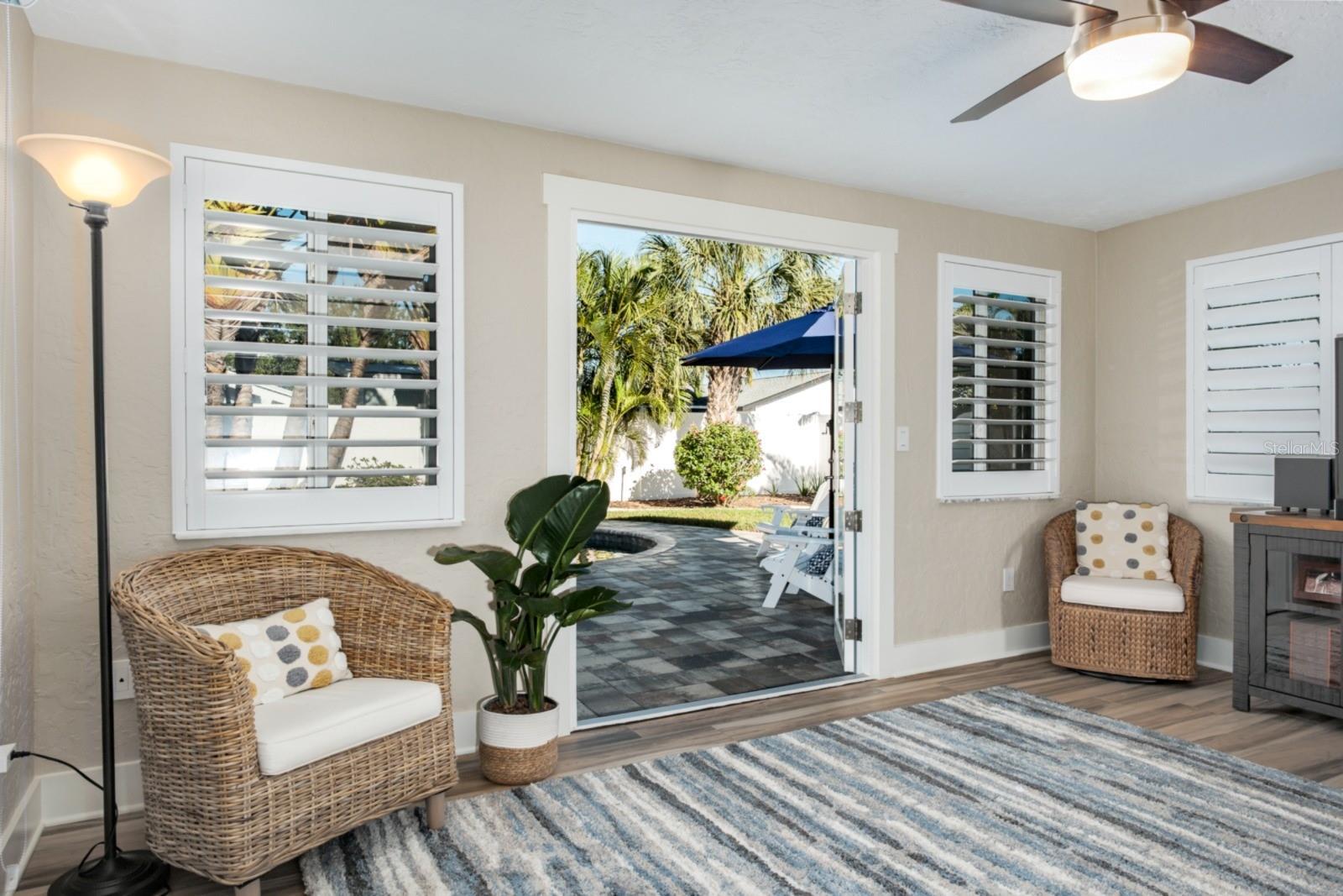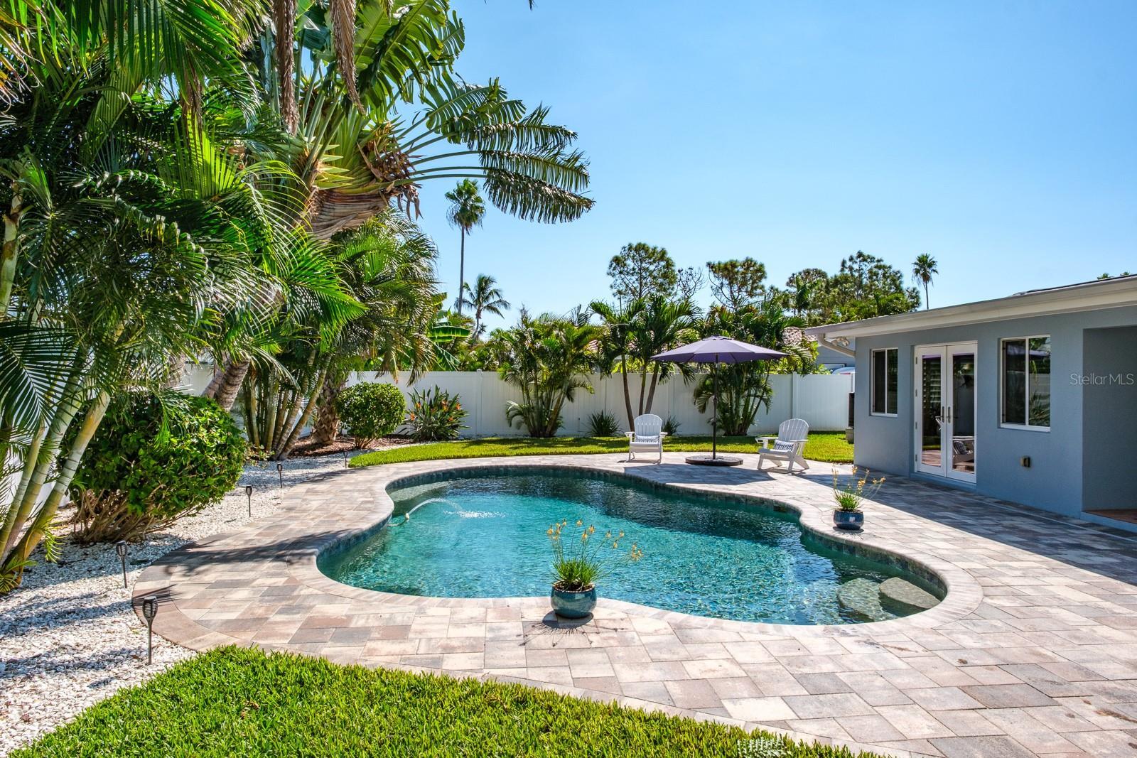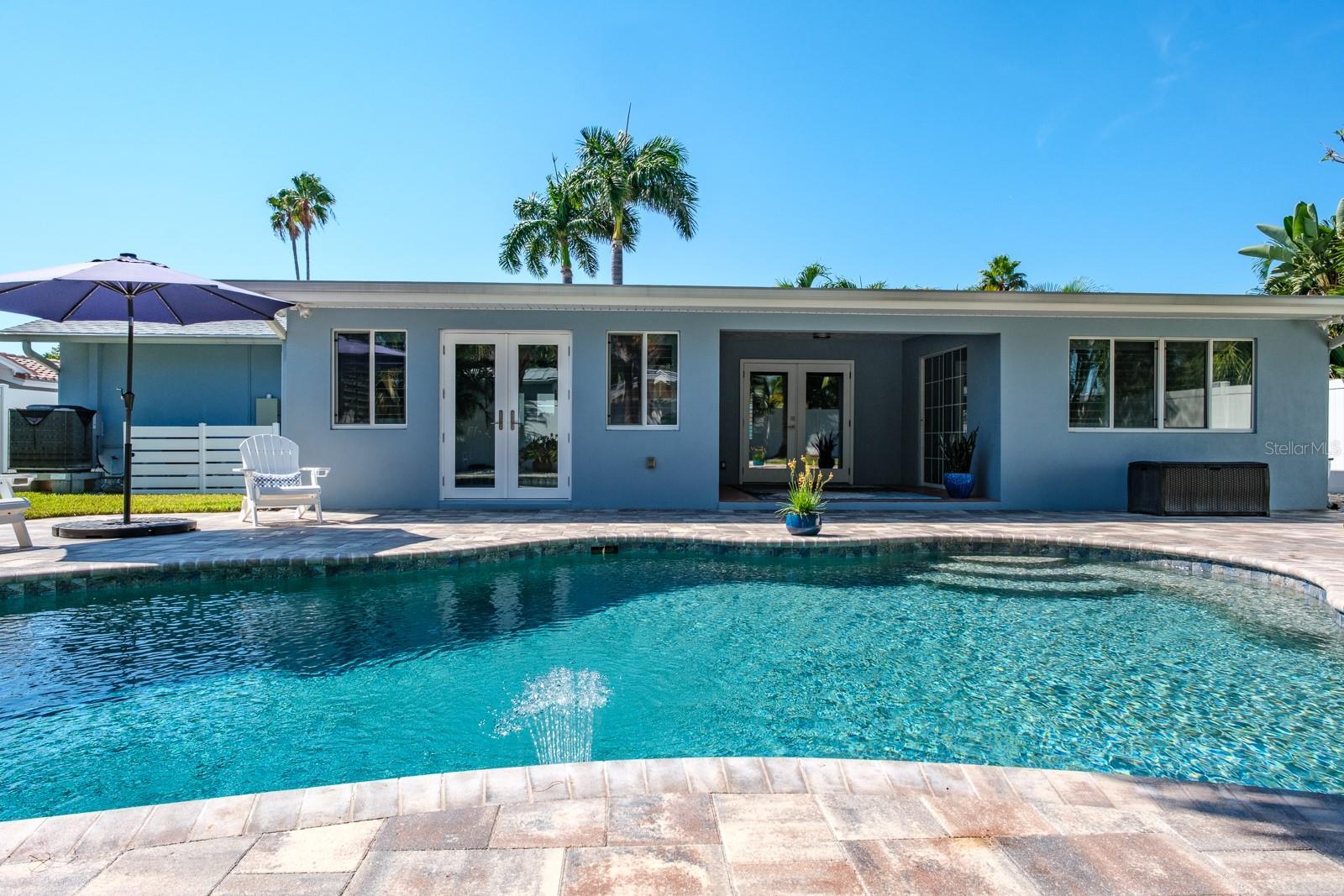 Welcome to the secluded Island of Vina Del Mar! This 2BR/2BA coastal-inspired residence showcases an oversized office/ flex room adjoining the primary suite, creating a private space for work, wellness, or relaxation. This coveted island home offers light-filled, open-concept living with views of the landscaped backyard and saltwater pool. The updated kitchen features custom quartz countertops, all-wood cabinetry & pantry with soft-close drawers, and a striking 100-year-old cypress beam with matching accent trim. The split floor plan includes a spacious primary suite with an en suite bath, a walk-in closet with custom shelving, and a versatile office/den/nursery space with pool access. This flex space could also be used as a third-bedroom or in-law room with exterior access. The guest suite offers a built-in closet and adjacent bath, with a custom pocket door for added privacy. Two distinct living areas provide flexibility—one for larger gatherings, the other is open to the kitchen with direct pool access. The covered lanai offers shade while overlooking the private backyard, with an adjacent lounge area ideal for cooling off indoors. Meticulously upgraded and kept, the home features a new roof (2025), pool pump (2024), water purification & filtration system (2022), water heater (2020), Air Knight purification system (2017), custom Pebble-finish saltwater pool (2017), wood plank-style porcelain flooring, plantation shutters, Nest smart thermostat & smoke/CO detectors, updated electrical panel, newer windows and doors, fresh paint, and more. The two-car garage provides additional storage, while underground power lines preserve unobstructed views. Nearby Vina Del Mar Park offers a playground, dog park, pickleball, tennis, and basketball courts. Cruise down to the beach, restaurants, shops and entertainment in famous Pass-A-Grille or even a short drive to the vibrant Downtown St Pete for nightlife and the St Pete Pier. Don’t miss your chance to live the Salt Life!