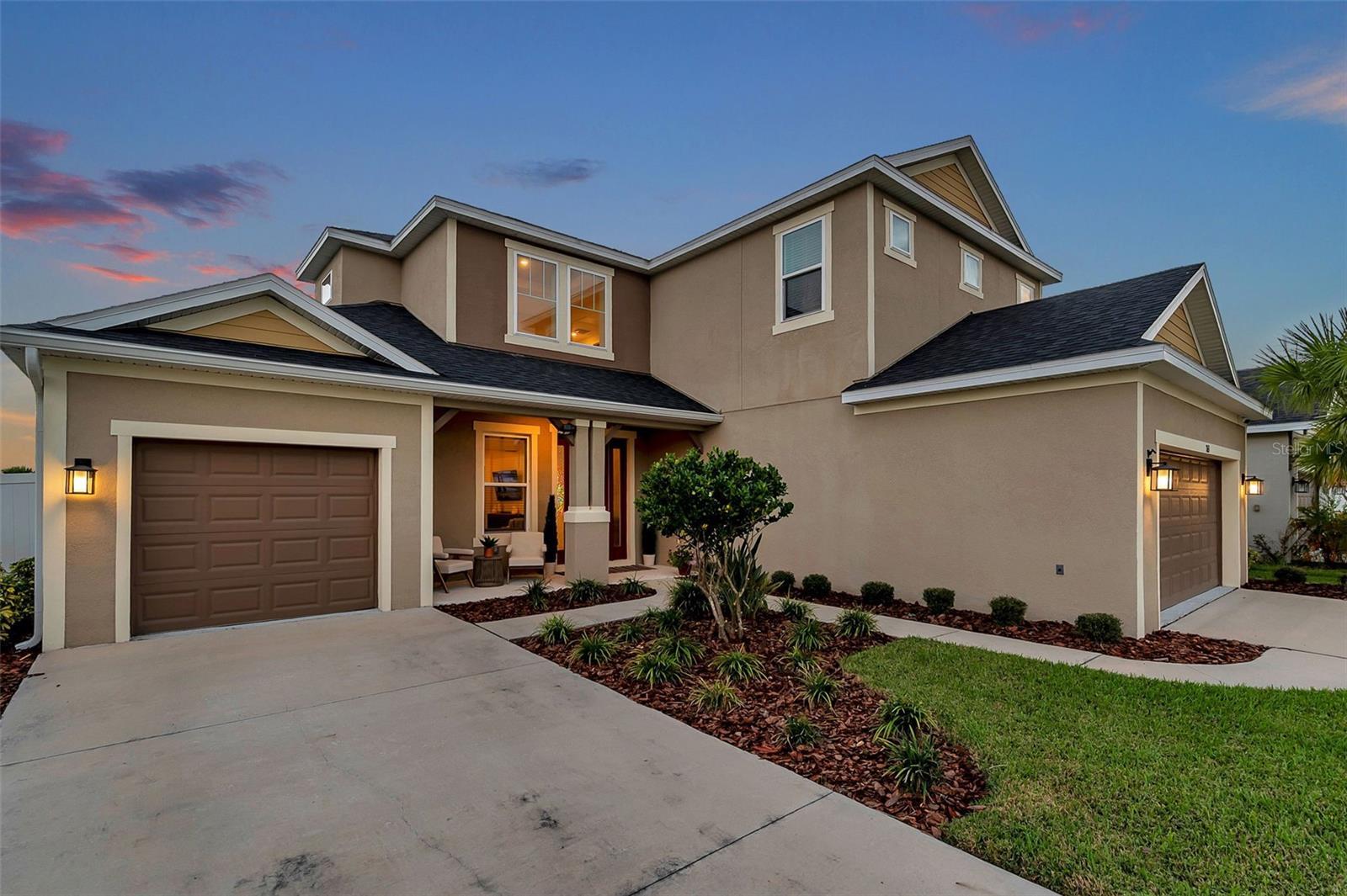 Step inside 7163 Talamore Drive, a nearly 3,500 sq.ft. luxury residence nestled within the gated Talamore enclave of WaterGrass in Wesley Chapel. Built in 2023 and embellished with roughly $140k+ in options and upgrades and post closing improvements! This thoughtfully designed home features five bedrooms, four-and-a-half bathrooms, and a split three-car garage with dual driveways, blending modern sophistication with timeless comfort. A two-story grand foyer welcomes you with soaring ceilings, abundant natural light, and upgraded designer light fixtures that continue throughout the home, setting an unforgettable first impression of elegance. The primary suite is conveniently located on the main level, offering privacy and refinement with a tray ceiling, dual walk-in closets, and a spa-style ensuite bathroom featuring expansive quartz dual vanities, a freestanding soaking tub, and an oversized walk-through shower with dual shower heads and beautifully curated tile finishes. Also on the main floor is a secondary bedroom with a private en-suite bath, perfect for multigenerational living, extended guests, or use as a private office or in-law suite. At the heart of the home, the living room showcases a dramatic double tray ceiling, upgraded lighting, and a seamless flow into the dining area and chef’s kitchen. The gourmet kitchen is a showstopper, offering Level 5 cabinetry, quartz countertops, stainless steel appliances, a sleek glass cooktop, designer vent hood, walk-in pantry, porcelain farmhouse sink, extended island, and a custom wet bar—making it ideal for both everyday living and entertaining guests. Upstairs, a spacious bonus room offers endless possibilities—media room, game room, playroom, study lounge, or secondary living space—accompanied by generous secondary bedrooms and beautifully designed bathrooms. Outside, the home sits on an oversized, fully fenced 65-foot lot (a $59k lot premium not included in the figures above) overlooking a serene pond. The screened and covered lanai is perfect for year-round enjoyment, and the expansive backyard offers ample room for a future pool, outdoor kitchen, fire pit, or your personalized outdoor oasis. The split three-car garage provides exceptional functionality and storage, with one bay currently used as a home gym. Residents of WaterGrass enjoy access to resort-style amenities, including two luxury amenity centers with pools, splash zones, lap lanes, fitness centers, tennis courts, basketball courts, playgrounds, dog parks, and scenic walking trails. The newly completed Promenade Park adds an additional resort-style pool, splash pad, pavilion, playground, and open green space. Only two years old and meticulously maintained, this home offers the luxury, space, and lifestyle of new construction—without the wait. ***Schedule your private tour today, and don’t forget to ask about our EXCLUSIVE PREFERRED LENDER CREDITS.***