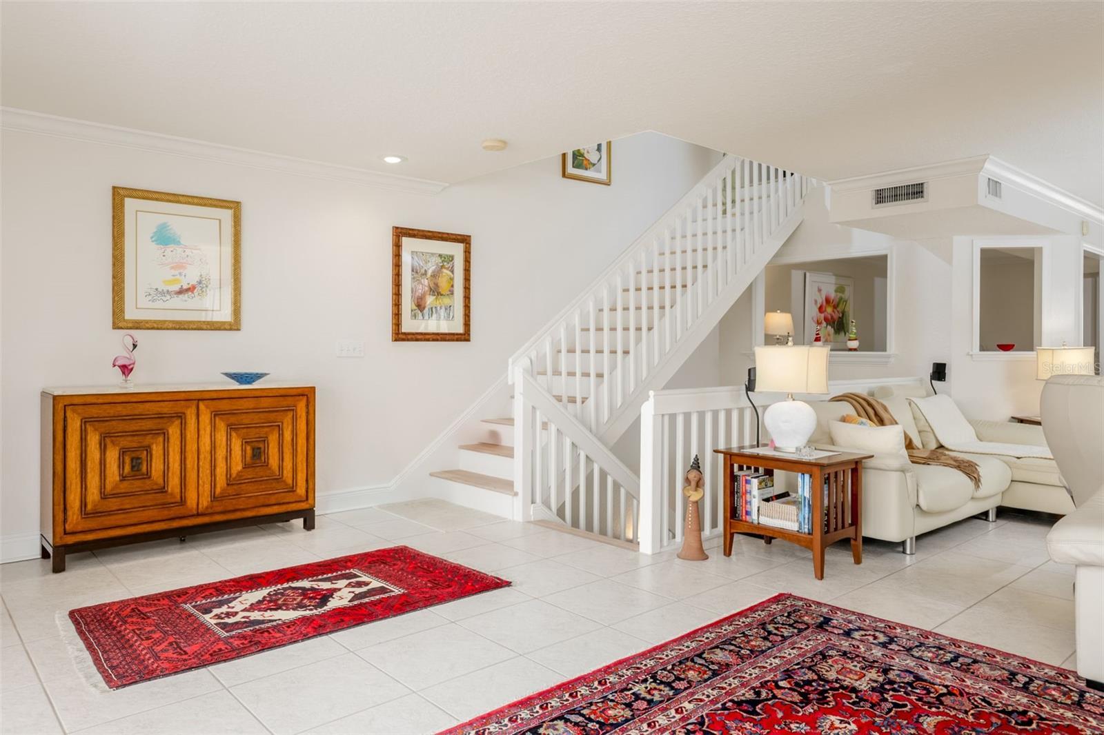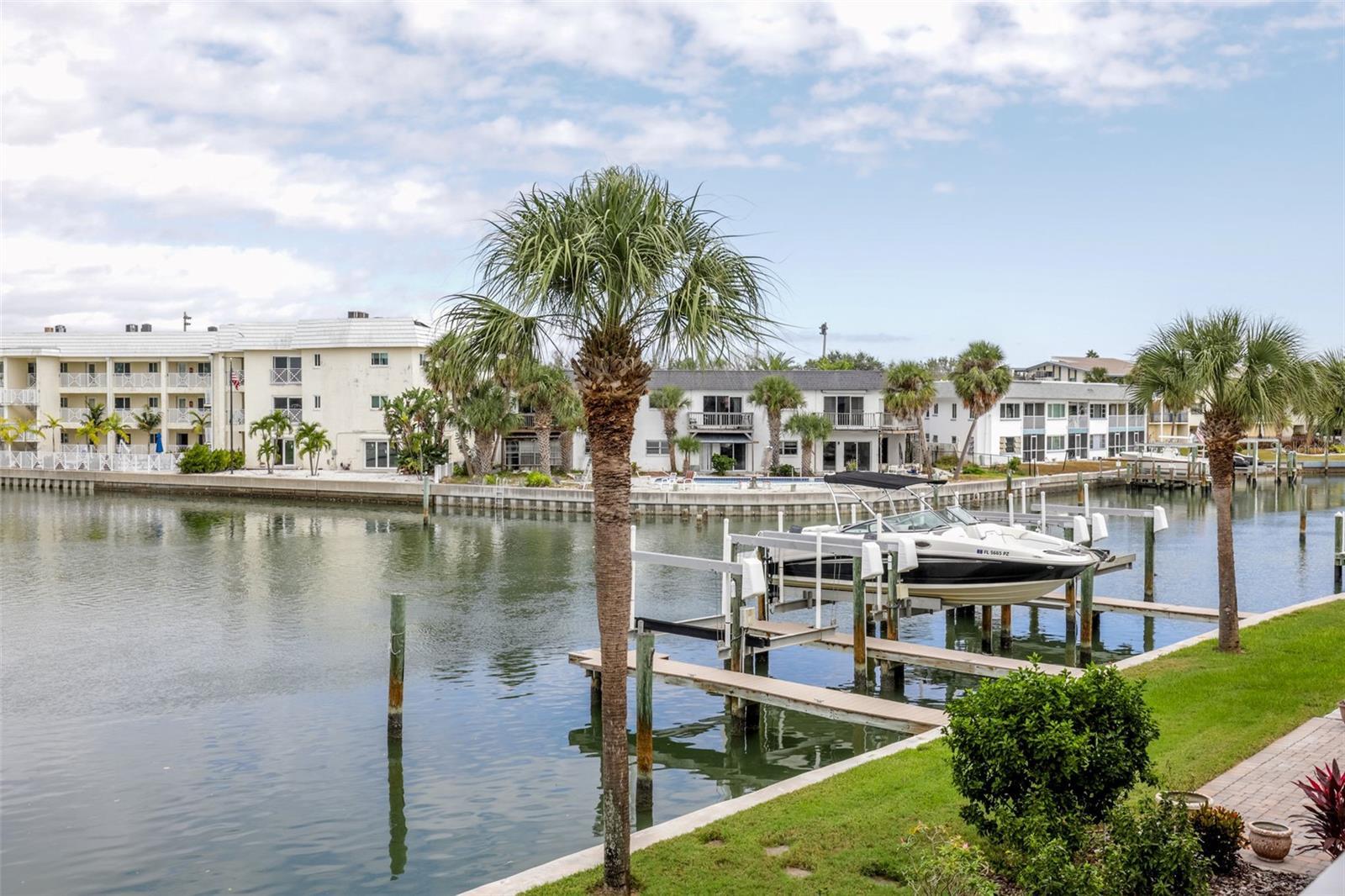 Welcome to Island Townhomes! Rarely available end-unit waterfront townhome just one block from Treasure Island’s famous white-sand beach. Nearly 2,500 sq ft, a 3–4 car garage, boat slip, paver drive and sweeping water views from every level make this one of Island Townhomes’ most desirable residences. Elevated living from this open-concept main floor features a bright kitchen, dining area, full bath, and a spacious living room that opens to a huge 24'×12' waterfront balcony—perfect for sunsets and entertaining. Upstairs, the private primary suite offers a spacious luxurious bath, large closet, and its own balcony overlooking the Intracoastal. Two additional bedrooms, a full bath, and upstairs laundry complete the top floor. Enjoy solid block construction, pristine condition, most furnishings included, and dock with deeded slip, quiet protected water with great gulf access. Walk to shops, restaurants, and the beach, or take a quick drive to Downtown St. Pete. Units like this almost never hit the market—don’t miss your chance to live where others vacation.