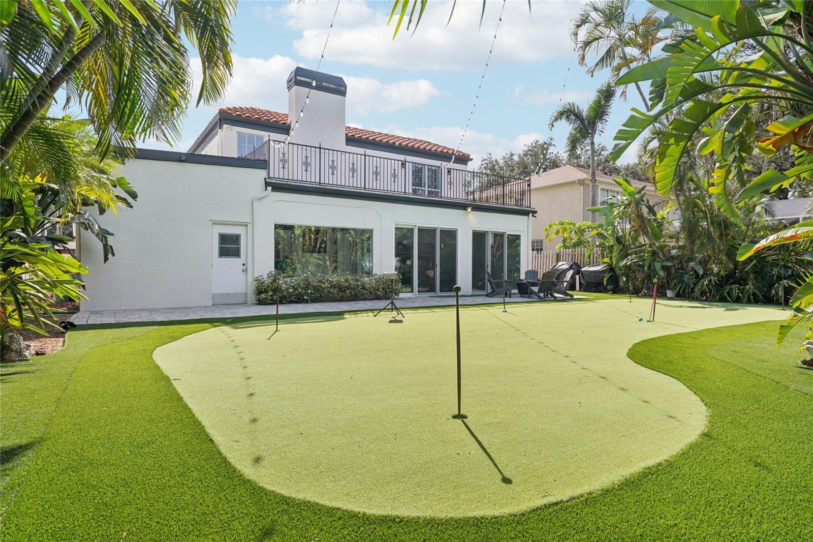Beautifully maintained Bayshore Beautiful home! This 4BR, 2.5BA block construction home includes an additional office, den, and bonus Florida room, all within walking distance of Roosevelt Elementary, the YMCA, and scenic Bayshore Blvd. Inside, enjoy high ceilings, natural light, and an open floor plan with an updated kitchen featuring a newer gas stove, dishwasher, and island countertop. Upgrades include LVP flooring, interior/exterior paint, an updated powder bath, new light fixtures, and new AC (2022). The enclosed sunroom with impact sliders opens to a backyard oasis with turf, pavers, a gas hookup for an outdoor kitchen, and a custom-built 45 ft. professional-grade putting green with six regulation putting cups and flags. A circular driveway, mature landscaping, and turf enhance curb appeal, while the garage features a golf simulator with a screen/projector, a temperature-controlled workshop/storage area, and a generator hookup. High and dry in Flood Zone X with a 16-foot elevation, this property currently does not require flood insurance. Meticulously cared for and move-in ready!