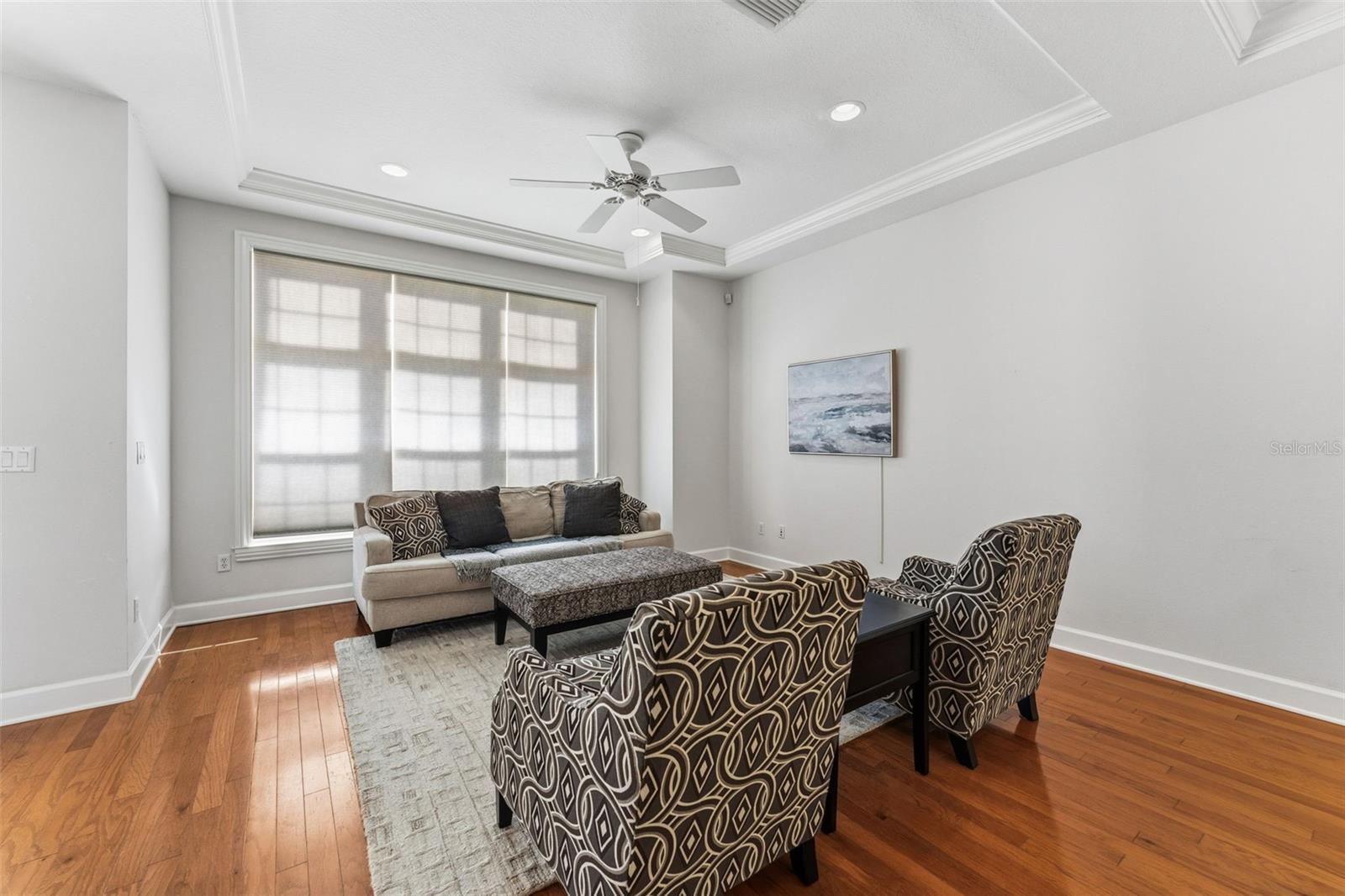 - Ceiling Fans(s), Crown Molding, High Ceilings, Open Floorplan, PrimaryBedroom Upstairs, Solid Surface Counters, Solid Wood Cabinets, Stone Counters, Thermostat, Tray Ceiling(s), Walk-In Closet(s)