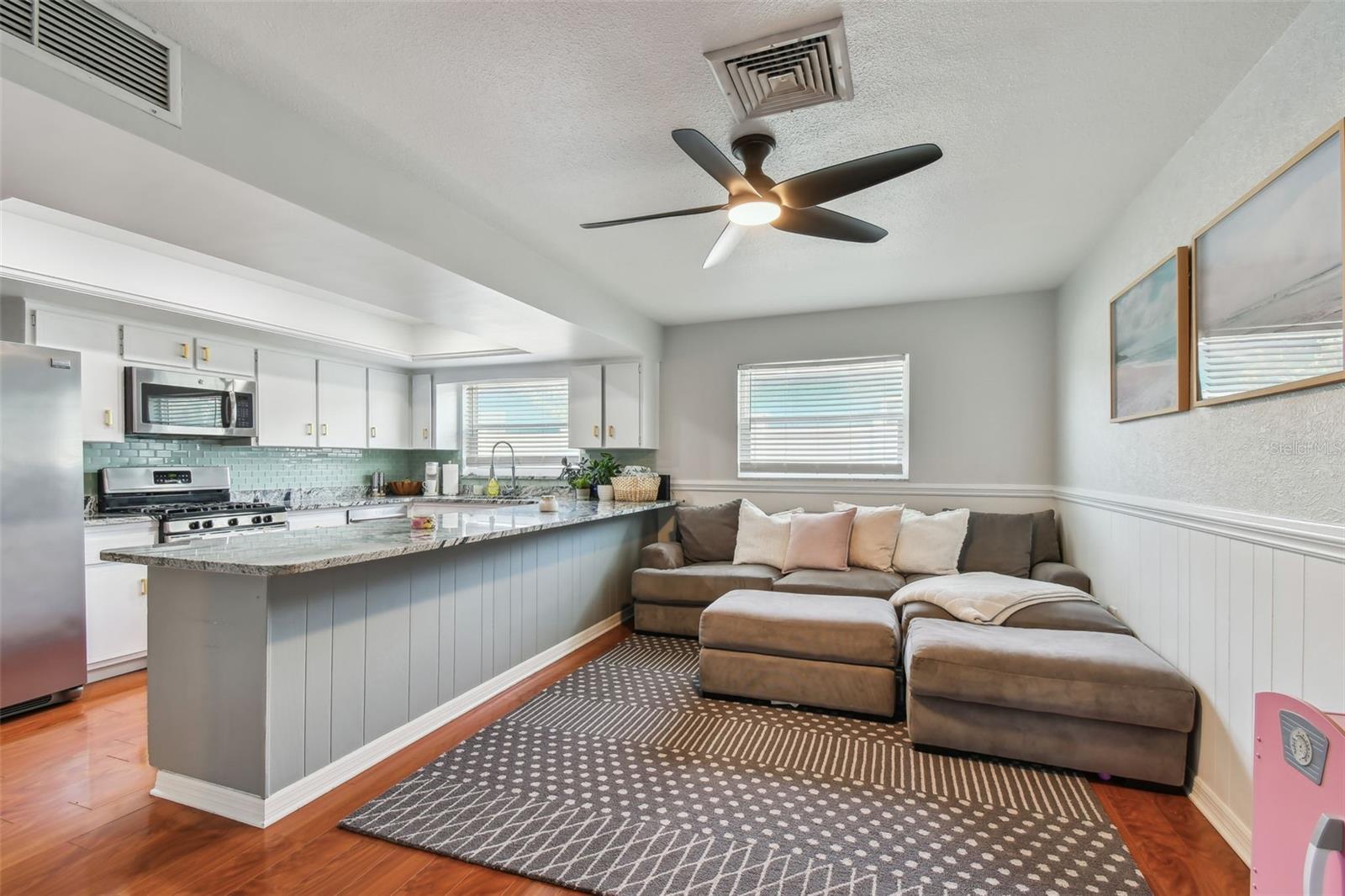 - Ceiling Fans(s), Eat-in Kitchen, Kitchen/Family Room Combo, Primary Bedroom Main Floor, Split Bedroom, Stone Counters, Thermostat, Walk-In Closet(s), Window Treatments