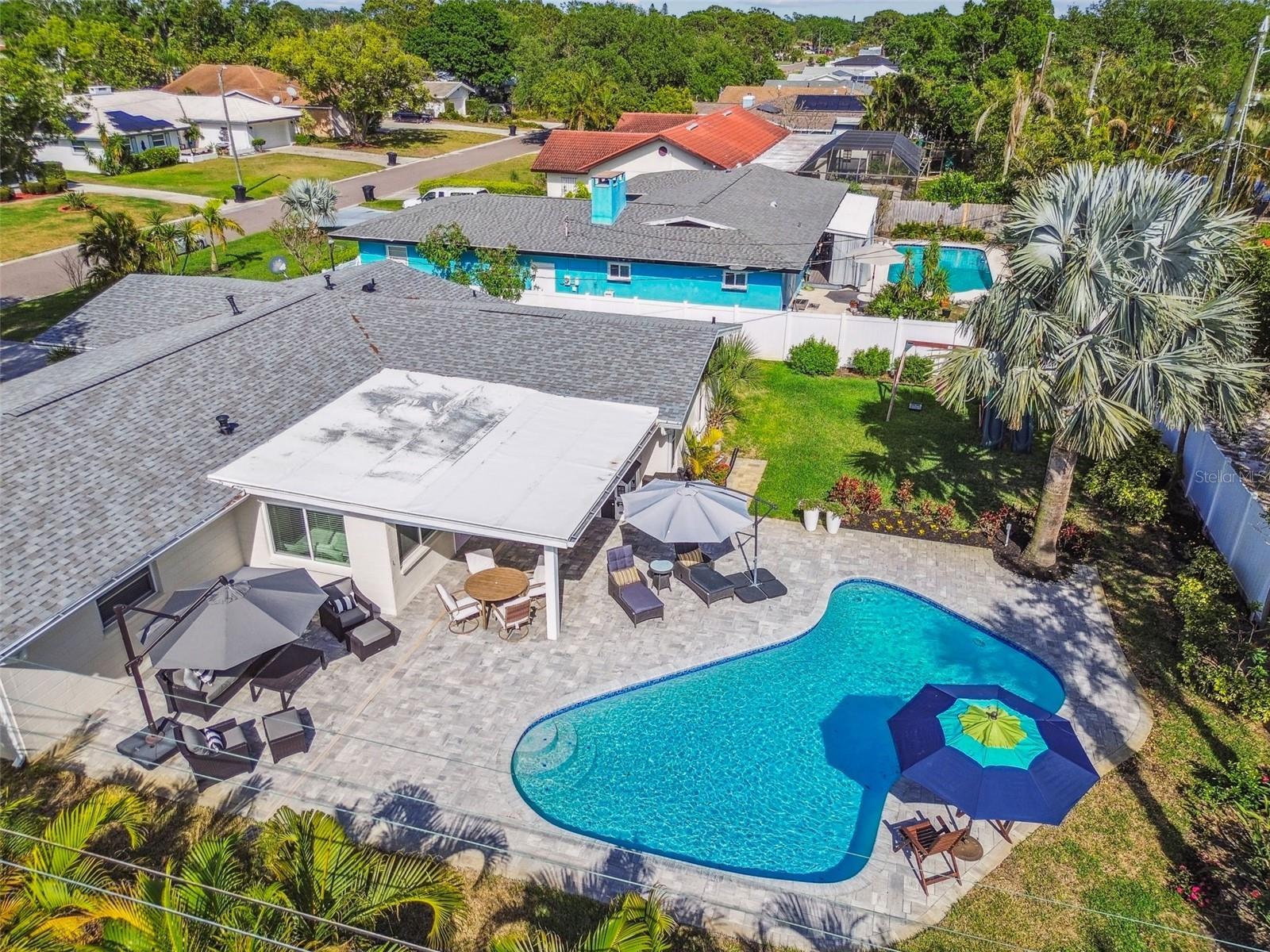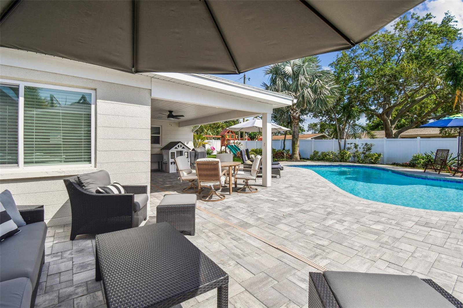 Welcome to the high-and-dry community of Pinellas Point, St. Petersburg’s quiet coastal enclave just minutes from downtown, award-winning beaches and Interstate 275. On a rare quarter-acre lot in flood zone X with no history of water intrusion, this residence requires no flood insurance and features impact-rated windows for added peace of mind. The 2024 pool and lanai remodel provides an ideal outdoor retreat with space for an outdoor kitchen, garden, playground or dog run. Inside, an expertly designed split floor plan begins at a covered veranda and formal foyer, opening into an expansive living room filled with natural light. A cozy seating area with a gas-burning, freestanding fireplace connects the living and dining rooms, leading to an updated kitchen with granite countertops, a gas range and extended breakfast bar overlooking a secondary family room. A spacious bonus room offers flexible use as a playroom, office or wellness space. The remodeled primary suite includes a generous walk-in closet and updated en-suite bath. Two guest bedrooms share an oversized updated bath. Just one mile away, Maximo Park offers boat, jet ski, kayak and paddleboard launches, nature trails, a sandy beach and disc golf. Near the evolving Skyway Marina District, this home pairs residential serenity with urban access.