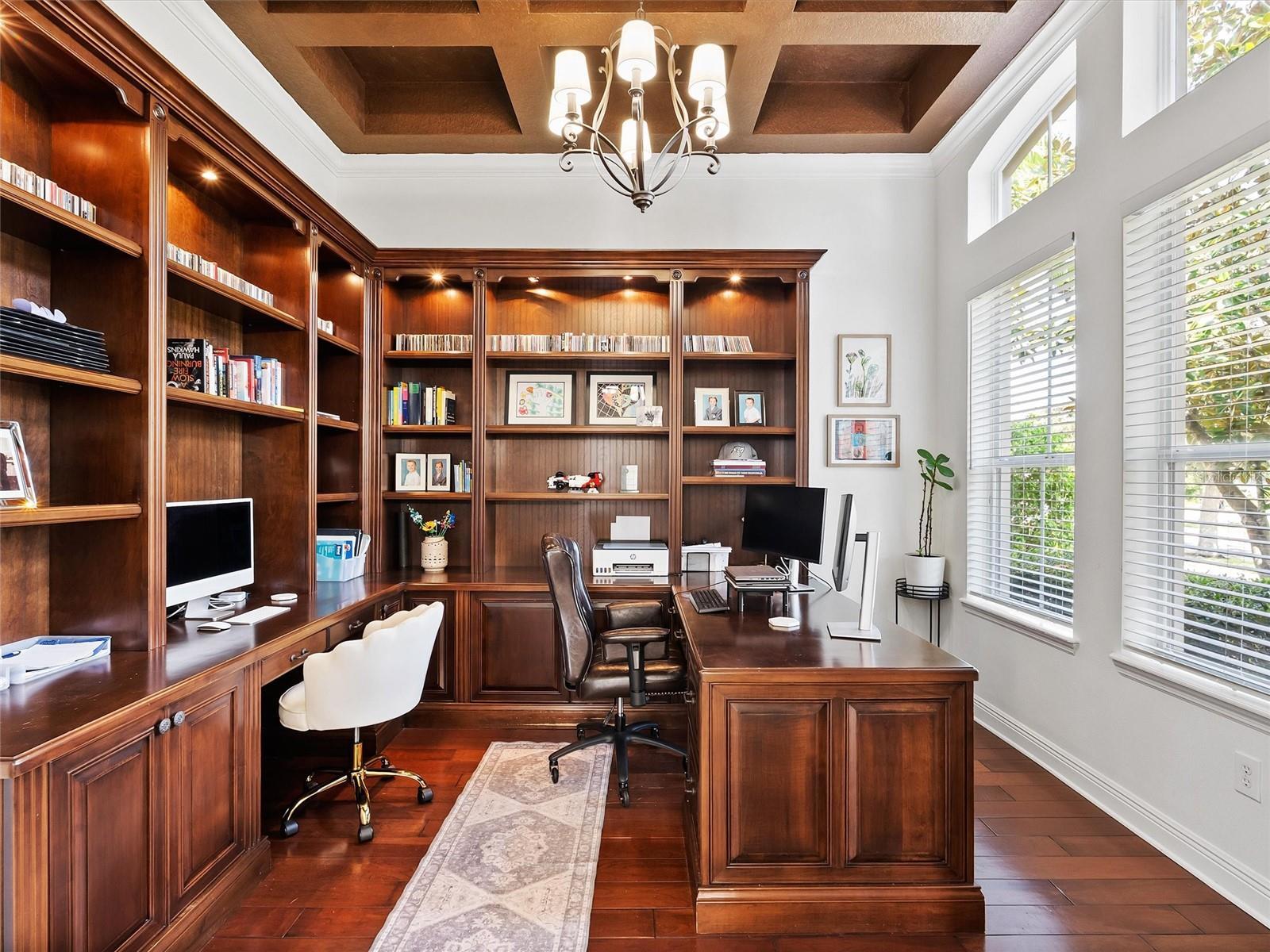 - Built-in Features, Ceiling Fans(s), Central Vaccum, Crown Molding, Eat-in Kitchen, High Ceilings, Kitchen/Family Room Combo, Open Floorplan, Primary Bedroom Main Floor, Solid Wood Cabinets, Split Bedroom, Stone Counters, Thermostat, Tray Ceiling(s), Walk-In Closet(s), Window Treatments