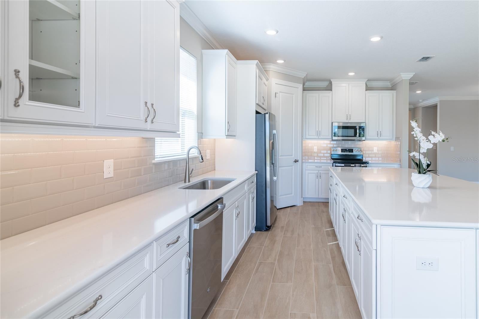 One or more photo(s) has been virtually staged. Want resort style living in a 55+ community but don’t want to wait to build?... Welcome home to this stunning 3-bedroom, 3-full bath home with office in Esplanade at Wiregrass Ranch. This home was completed in 2024 by Taylor Morrison, one of America’s most trusted home builders. Enjoy upgrades that provide functionality, style and comfort in this popular Lazio floor plan such as durable wood-look tile flooring, OVERSIZED KITCHEN ISLAND with STORAGE ON BOTH SIDES, soft-close cabinets, under cabinet lighting, crown molding throughout, tray ceilings, stainless steel appliances, CULLIIGAN WATER SOFTENING SYSTEM W/ DUAL TANKS, 2 UV LIGHT HVAC, dampers on all AC vents to control air flow, LARGER MASTER CLOSET, 8’ LONG SHOWER with multiple spray heads, upgraded bay window expansion in master bedroom and guest room, plus a $25,000 OUTDOOR KITCHEN FIT WITH GRILL, SINK AND REFRIGERATOR. The large 3-CAR GARAGE leaves plenty of space for a golf cart. This home is located in an established part of Esplanade with minimal to no construction around. The spacious 62ft lot is on a cul-de-sac backing up to HOA conservation area with plenty of room for a pool. Enjoy low-maintenance living with services that include lawn care, reclaimed water, cable/internet and trash pick-up. You will feel you are always on vacation with the stunning resort-style pool and spa, 24/7 gym, tennis, pickleball and bocce ball courts billiard/card room, spa, concierge services for travel and pets, curated activities such as wine tastings and culinary events and plenty of clubs to join to bring neighbors together. Esplanade at Wiregrass is close to top hospitals and medical facilities, the Shops of Wiregrass, Premium Outlets and restaurants. Less than hour commute to the Tampa International airport, this home and community offer a lifestyle of convenience, flexibility and luxury.