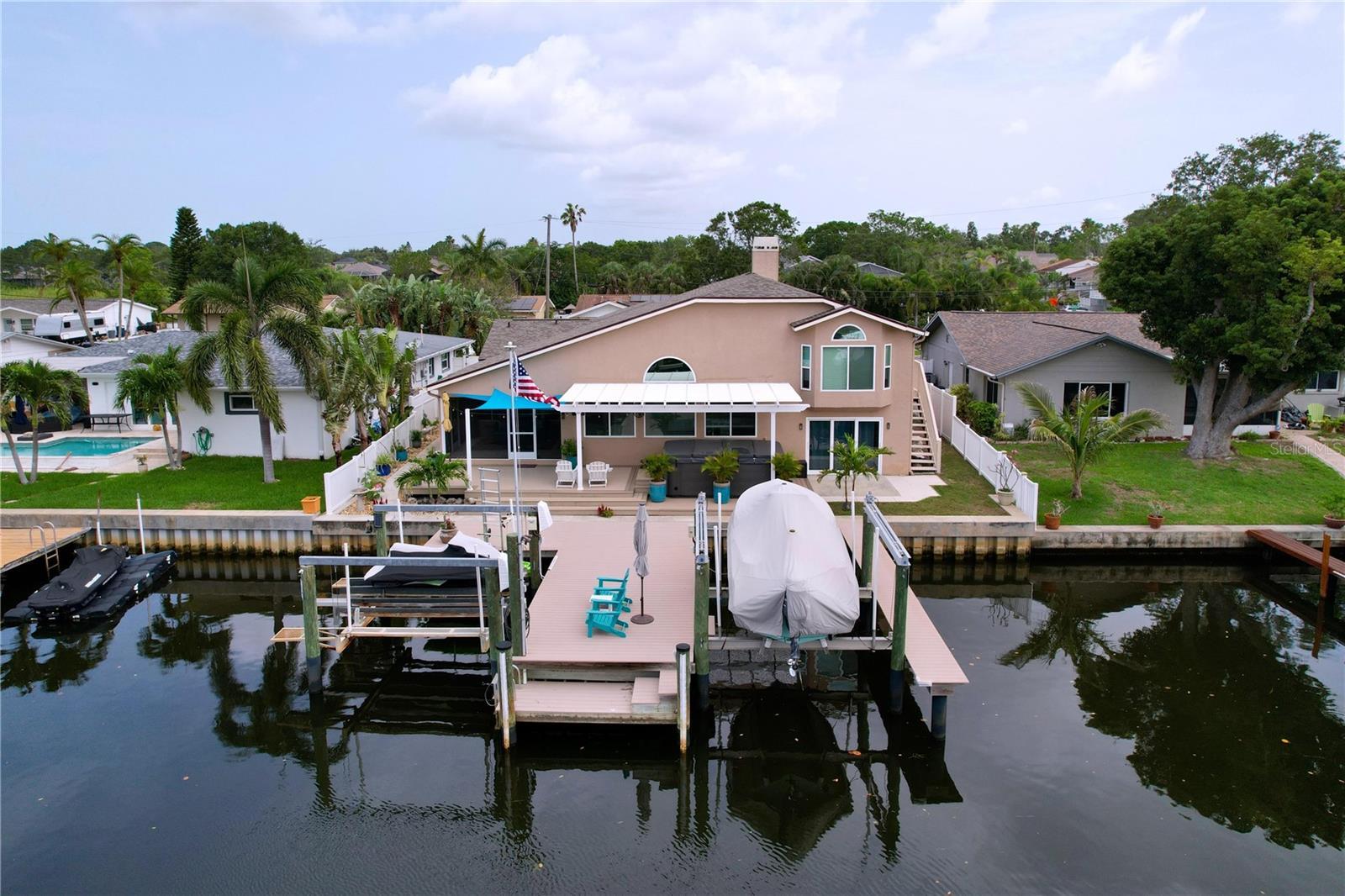 Luxury waterfront living in Palm Harbor | OPTIONAL HOA | GULF-ACCESS! This beautifully maintained coastal retreat offers incredible curb appeal and deep water access with no bridges just minutes to the Intracoastal, Gulf of Mexico, Anclote Key, and Three Rooker Islands. Enjoy the Florida lifestyle from your screened-in front and back patios, perfect for year-round relaxation and entertaining. Inside, soaring ceilings and abundant natural light highlight the open-concept living space. A custom sea glass and shell accent wall with an electric fireplace creates a stunning focal point. The remodeled gourmet kitchen boasts high-end appliances, upgraded countertops, and a modern flow ideal for entertaining. The main level features two spacious bedrooms (one with a walk-in closet), a stylish full bath between them, and a bonus room perfect for an office, nursery, or home gym. A beautifully designed wine closet/bar area adds an extra touch of sophistication. For added convenience, a half bath is located in the garage ideal for coming home from a day on the water. Upstairs, the private primary suite offers a peaceful retreat with a walk-in closet, a luxuriously updated en-suite bathroom, and private access to the exterior staircase. The suite also features a built-in window bench with hidden storage perfect for relaxing with a book or enjoying the breeze.Hurricane-rated Miami-Dade windows and doors are installed throughout the entire home, including the expansive 24x13 bonus storage room. With three sliding glass doors and a window, this space offers endless possibilities: home office, game room, lounge, or creative studio.The composite deck and dock is a high-end, low-maintenance upgrade and are equipped with a boat lift, dual jet ski lift (fits two skis), and a kayak lift. Just steps away, enjoy a 2023 8x13 Catalina Malibu Swim Spa complete with a bluetooth stereo & chiller keeping the water refreshingly cool even in the summer heat. You can float around, watch the game, wave to boaters, or even catch a glimpse of a passing dolphin. Additional features include updated bathrooms, a wine bar, and thoughtful upgrades throughout for comfort and convenience. With an optional HOA, a new 2025 roof, a 2023 water softener, and premium waterfront features throughout, this Palm Harbor gem delivers luxury, lifestyle, and location in one unforgettable home!