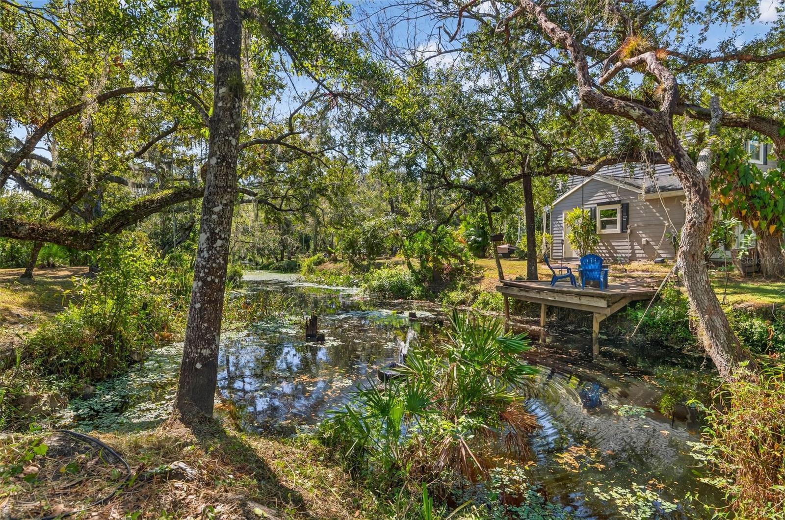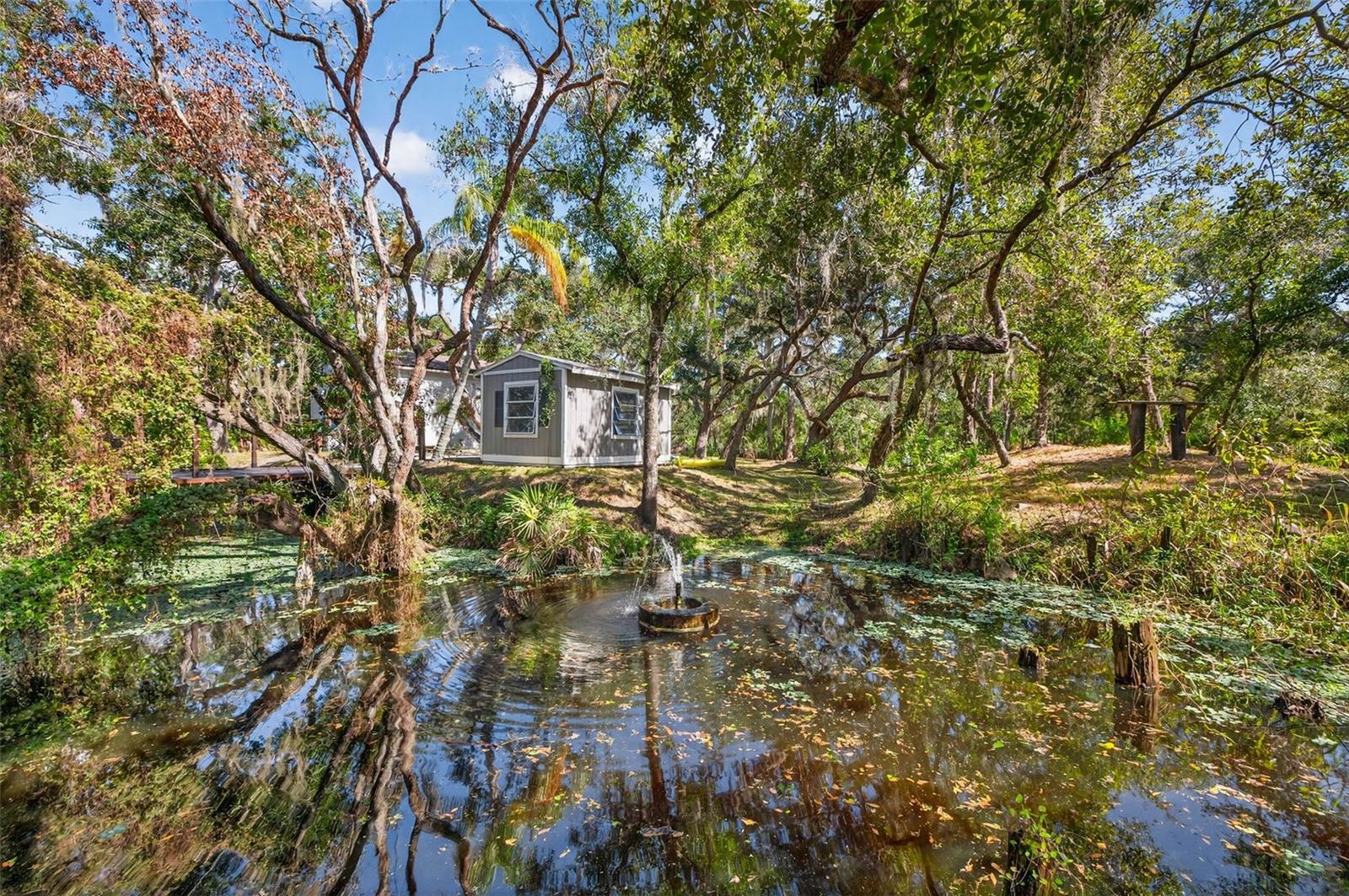 Welcome to your private Florida sanctuary, a serene escape with effortless access to urban life. Tucked away on 2.23 acres of lush, natural landscape, but just minutes to Lakewood Ranch, this 3-bedroom, 2.5-bath residence offers the perfect blend of refined living and serene seclusion. The tranquil creek winding through the property and native wildlife add to the home’s rare sense of retreat. Renovated to perfection, the interior showcases sophisticated finishes throughout — including luxury vinyl plank flooring, quartz countertops, and custom built-ins framing an active, stone-clad wood-burning fireplace. The expansive primary suite is a true haven, featuring dual custom-organized walk-in closets and a spa-inspired bathroom with a skylight that bathes the space in natural light. Outside, the setting is nothing short of breathtaking. Thoughtfully designed spaces invite relaxation and connection to nature — from the fountain-view sitting area and charming footbridge spanning the creek, to the grand patio ideal for alfresco dining or morning coffee amidst the sounds of nature. Beyond the main home, the property includes three additional structures: two storage sheds and a versatile outdoor workshop featuring two climate-controlled rooms. Ideally located just ten minutes from Lakewood Ranch, this home harmonizes the tranquility of country living with easy access to modern conveniences. Notable updates include: 2019 impact windows, 2020 roof, 2022 A/C systems, 2024 septic, and 2024/25 well and pump. If you're looking for a peaceful hideaway that keeps you connected to city energy, this is the perfect home for you.