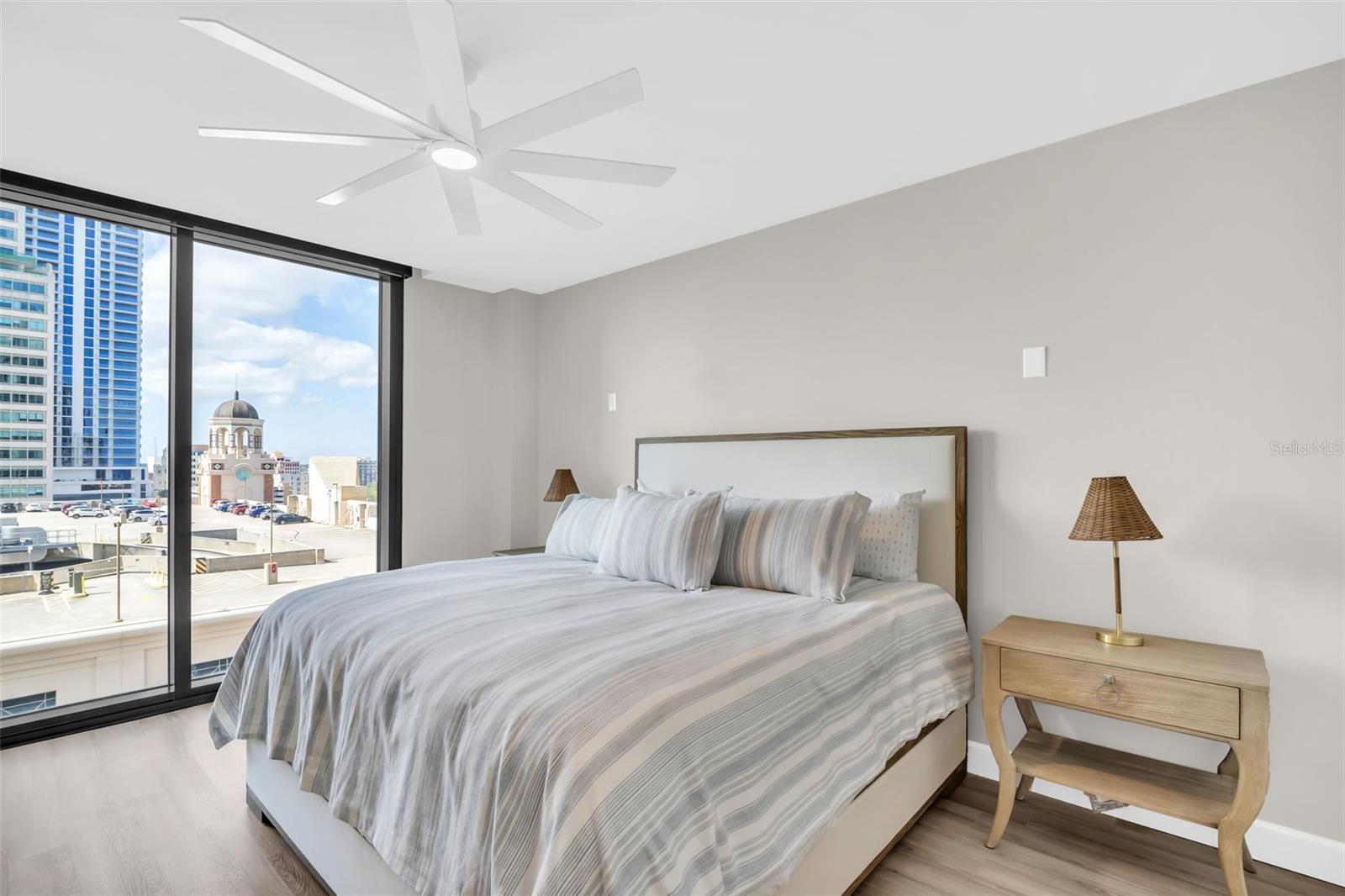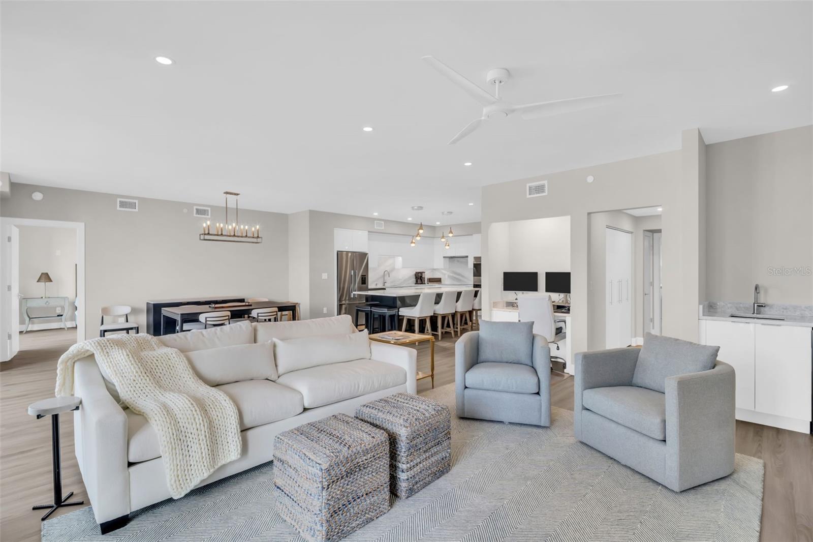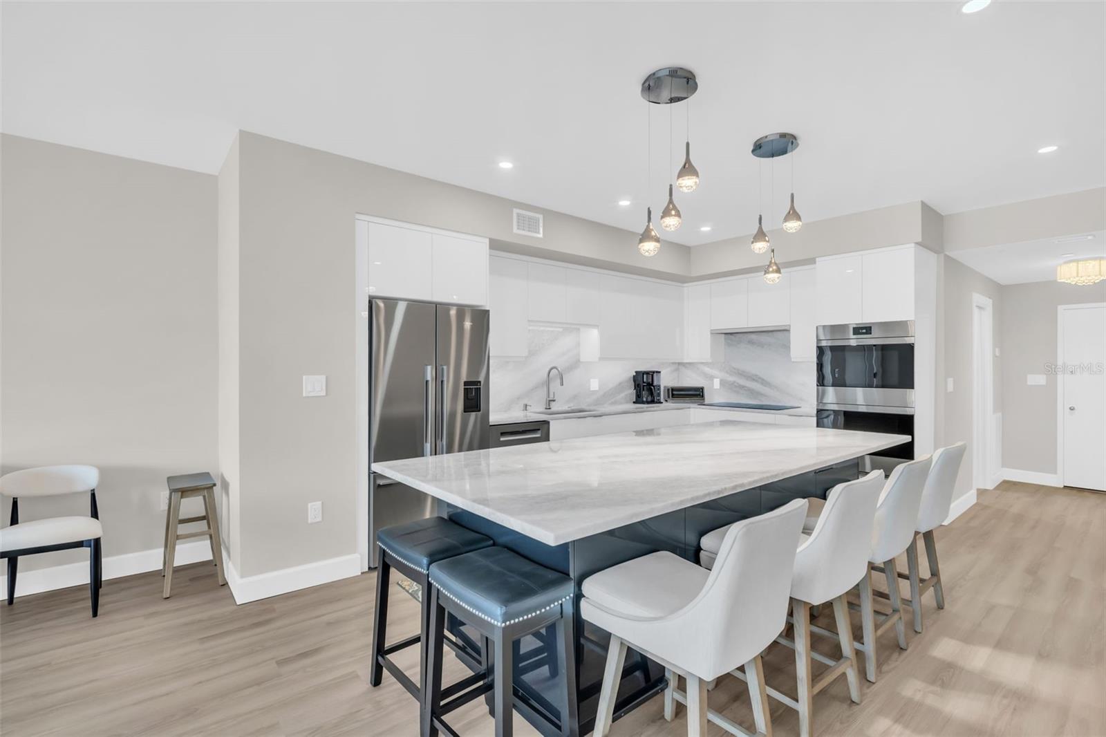 Discover elevated downtown living in this fully transformed 3-bedroom, 2-bath residence at Bayfront Tower, spanning approximately 1,925 interior square feet and featuring a generous balcony with sweeping city-scape views. From the studs up, no detail was overlooked in the 2025 renovation: all plumbing and electrical systems are brand new, and premium finishes abound, think Delta and Brizo faucets, an auto-touch kitchen faucet, Wolf induction cooktop with double ovens, and extended appliance warranties (via Ferguson). Custom Londos cabinetry enhances the kitchen, laundry and bar/work area, with under-island seating that conceals built-in storage. Marble surfaces grace the island, backsplash, countertops and work zone, while Franke granite sinks elevate the design. Updated windows and sliding doors flood the space with light. Wireless motorized roller shades dress every opening; remote-powered silent ceiling fans keep things comfortable. New sprinklers and fire-detection systems provide added peace of mind. With ample closet space and thoughtful built-ins, the home combines sleek design with efficient living. At Bayfront Tower, you'll enjoy full-service luxury in the heart of downtown: 24-hour concierge, valet parking, an on-site management team, rooftop heated pool and spa, jogging track, sprawling fitness center, library/game rooms and elegant social spaces for hosting events. Bayfront Tower. Live steps from the waterfront, vibrant dining, arts and culture, and the unbeatable walkability of St. Pete's premier address.