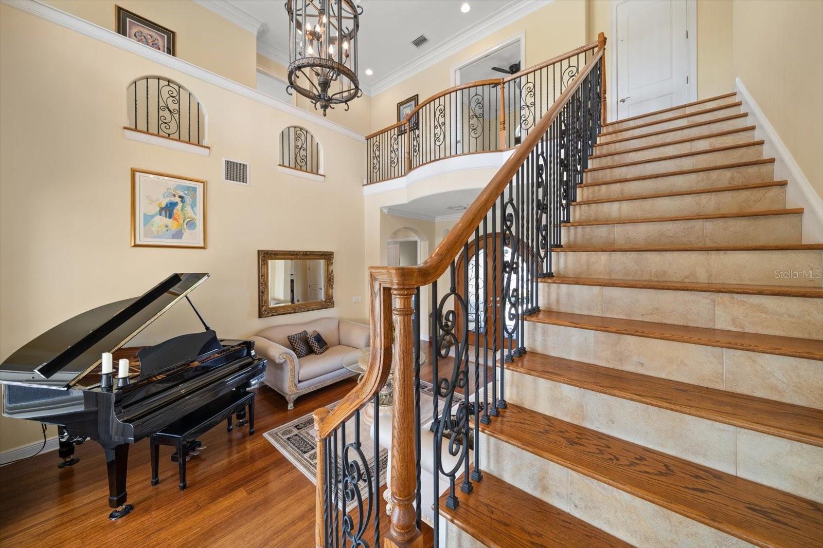 - Built-in Features, Ceiling Fans(s), Crown Molding, Eat-in Kitchen, Elevator, High Ceilings, Kitchen/Family Room Combo, PrimaryBedroom Upstairs, Solid Surface Counters, Solid Wood Cabinets, Stone Counters, Thermostat, Walk-In Closet(s), Wet Bar