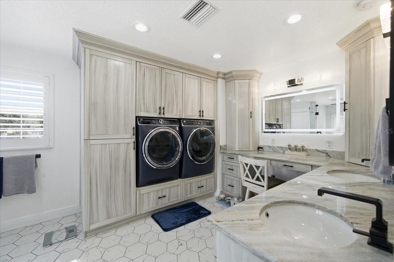 - Ceiling Fans(s), Crown Molding, Dry Bar, Eat-in Kitchen, High Ceilings, Open Floorplan, Primary Bedroom Main Floor, PrimaryBedroom Upstairs, Solid Surface Counters, Solid Wood Cabinets, Split Bedroom, Stone Counters, Thermostat, Walk-In Closet(s), Window Treatments