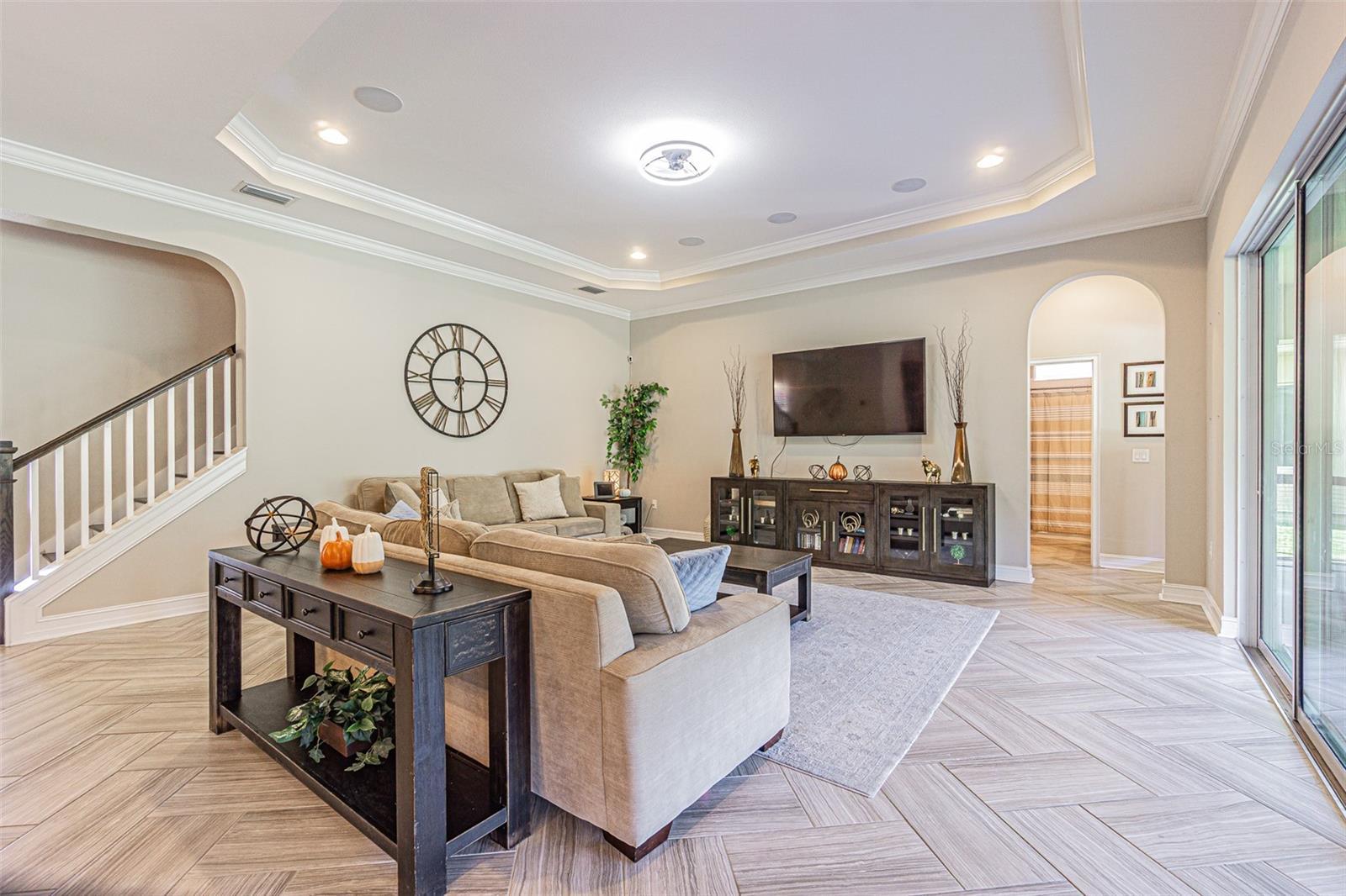 Beautifully appointed 5-bedroom, 4-bath, 4,443 sq. ft. home with office/den and bonus room in the highly sought-after gated community of Meadow Pointe. This thoughtfully designed home offers the perfect blend of elegance, comfort, and functionality. A welcoming foyer with custom herringbone tile leads to French doors opening to a bright office with hardwood floors, while a spacious formal dining room flows seamlessly into the butler’s pantry and chef’s kitchen featuring an oversized island, pot filler, and motion-sensor faucet—perfect for gatherings and entertaining. The open great room with coffered ceiling, surround sound, and a wall of sliding glass doors invites you to the covered patio overlooking a peaceful pond and conservation area, ideal for relaxing evenings outdoors. The first-floor guest suite provides privacy and convenience, while upstairs offers a large bonus room and four additional bedrooms, including a luxurious primary suite with balcony views of the pond and trees. The spa-inspired primary bath features dual shower heads, a soaking tub, his-and-hers closets, and surround sound for the ultimate retreat. Additional upgrades include crown molding throughout the first floor, wood staircase, security cameras, sprinkler system, and freshly painted exterior. Meadow Pointe residents enjoy resort-style amenities including a clubhouse, pool, tennis and basketball courts, playground, and scenic walking and biking trails. Conveniently located near top-rated Wiregrass schools, The Shops at Wiregrass, Publix, Cooper’s Hawk, the upcoming Orlando Health Hospital, and the exciting new Downtown Wesley Chapel entertainment complex coming in 2026—with easy access to I-75 for a quick drive to Tampa, the airport, and Florida’s best beaches and attractions.