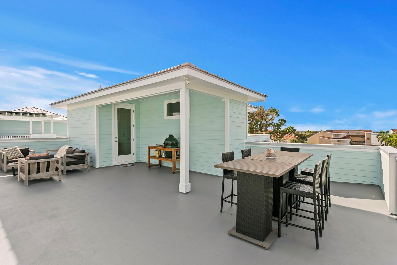 Exquisite Coastal Townhome with Rooftop Terrace and Gulf Views in Dunedin! Discover refined coastal living in this architecturally stunning four-story townhome, boasting 3 bedrooms + office, 2.5 bathrooms and a Private 4-stop Elevator, perfectly positioned across from the Gulf in coveted Dunedin. Constructed with Insulated Concrete Forms (ICF) for superior strength, energy efficiency, and soundproofing, as well as Miami Dade Impact windows and doors, this residence blends modern craftsmanship and security with timeless elegance. The exterior showcases Hardy siding to ensure lasting beauty and durability as well as 2 balconies (front and back) – 1 featuring a wood-paneled ceiling and a charming porch swing that conveys with the home. 4-car garage with pebble epoxy floor has two separate bays with dual garage doors — the rear section thoughtfully outfitted as a home gym. Behind the private gated entry with rich wood ceiling, the interior features 10-foot ceilings, 8-foot solid-core interior doors, and designer finishes creating an ambiance of upscale sophistication throughout the home. The second floor reveals a bright and expansive great room ideal for entertaining, with defined living and dining spaces that flow seamlessly to the gourmet kitchen. This chef’s space features premium shaker-style cabinetry with crown molding, granite countertops, stainless steel appliances (including a 5-burner gas range), spacious pantry, and a generous center island with seating. Wide-plank engineered wood flooring and ample natural light throughout, enhance the home’s modern coastal style. Dedicated home office provides a quiet and functional space ideal for remote work or creative pursuits. Upstairs, the huge primary suite offers a serene retreat complete with sitting area, spacious walk-in closet and spa-inspired en suite bath boasting dual vanities, tile floor, large soaking tub, and a separate shower. Two additional bedrooms (1 featuring a Murphy bed and built-in desk), a well-appointed full bath with tub/shower combo and a convenient laundry closet, complete this level. The fenced backyard offers a private outdoor retreat with a paver patio, low-maintenance turf lawn, and beautifully designed landscaping that enhances both style and relaxation. The crown jewel of this exceptional home is the fourth-level Rooftop Terrace — an entertainer’s dream showcasing panoramic 360-degree views of the Gulf, Caladesi Island and Dunedin. Enjoy unparalleled sunsets and gentle sea breezes from your substantial rooftop sanctuary, easily accessible via private elevator and stairs. Located just steps from the scenic Pinellas Trail and moments from Downtown Dunedin’s acclaimed restaurants, boutiques, and waterfront attractions, this home delivers the perfect fusion of luxury, location, and lifestyle.
