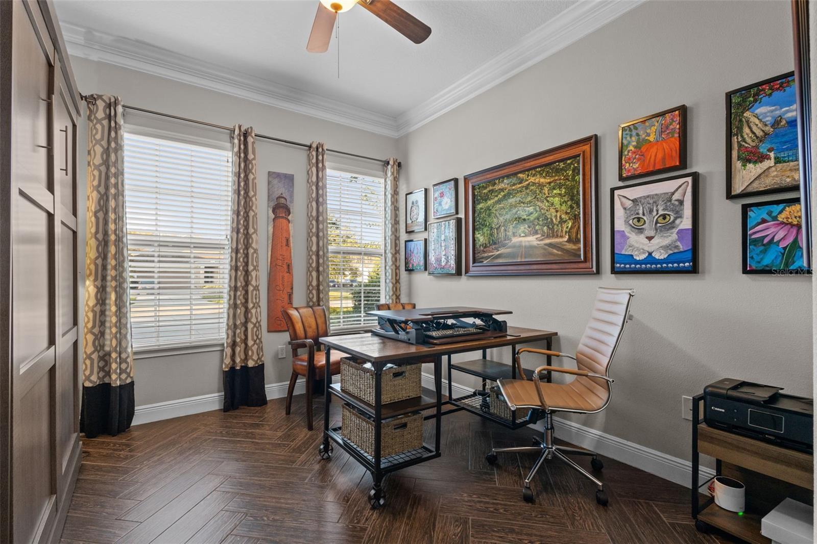 - Ceiling Fans(s), Crown Molding, High Ceilings, Open Floorplan, Primary Bedroom Main Floor, Stone Counters, Walk-In Closet(s)