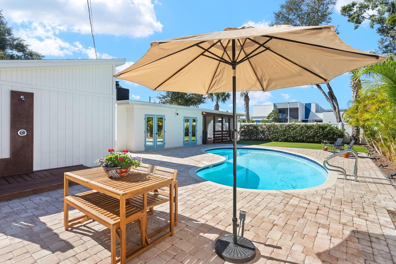 Under contract-accepting backup offers. Stunning Mid-Century Modern Adobe-Style Pool Home in coveted South Tampa Norma Park. Located on a desirable corner lot, this beautifully renovated single-story home offers 1,480 sq ft of stylish living space with 4 uniquely designed bedrooms featuring charming brick accent walls and 2 elegant bathrooms. And air-conditioned 140 sqft ADU is currently a large laundry room with custom closets, bringing the total heated living area to 1,620 sq ft. This home went through an extensive renovation in 2021-2022, followed by nearly $96k in owner improvements in late 2022-2025. Impeccable finishes are found throughout, creating a true showpiece that is even more impressive in person. Last year, minor water intrusion (1–2 inches in limited areas due to pool overflow from excessive rain) was promptly and professionally addressed with new porcelain tile floors, updated baseboards, fresh paint, and a new guest bath vanity, restoring the home to pristine condition. Exceptional Indoor–Outdoor Living! The entertaining kitchen layout features a cooking island, breakfast bar, and flows seamlessly into the inviting living room with its cozy brick wood-burning fireplace. Outdoor living shines here with multiple spaces to enjoy year-round including a welcoming front porch, a side patio lined with Agusta Bricks, and a 280 SqFt covered carport/patio area, plus a lush no-mow green turf yard, and a sparkling kidney-shaped pool with a true deep end, surrounded by beautiful pavers and generous lounging areas. Fido even has a fenced side yard with a plush green no-mow turf. The outdoor shower has hot water too, and is attached to the back of the ADU. The ADU currently serves as a laundry and storage space with newer full-size washer/dryer and custom closets. However, existing hookups inside the main home allow easy relocation of the laundry, opening the possibility of transforming the ADU into a studio, office, pool house, or playroom. This is a neighborhood on the rise. Families and future resale value benefit from proximity to the highly regarded Kenneth E. Adum K-8 Magnet and IB Candidate School, a growing asset to the beloved Norma Park community. This exceptional home offers versatility, style, and a resort-like lifestyle in one of South Tampa’s most desirable neighborhoods. Do not miss seeing this property. Furnishings can be sold separately. Schedule a showing today!