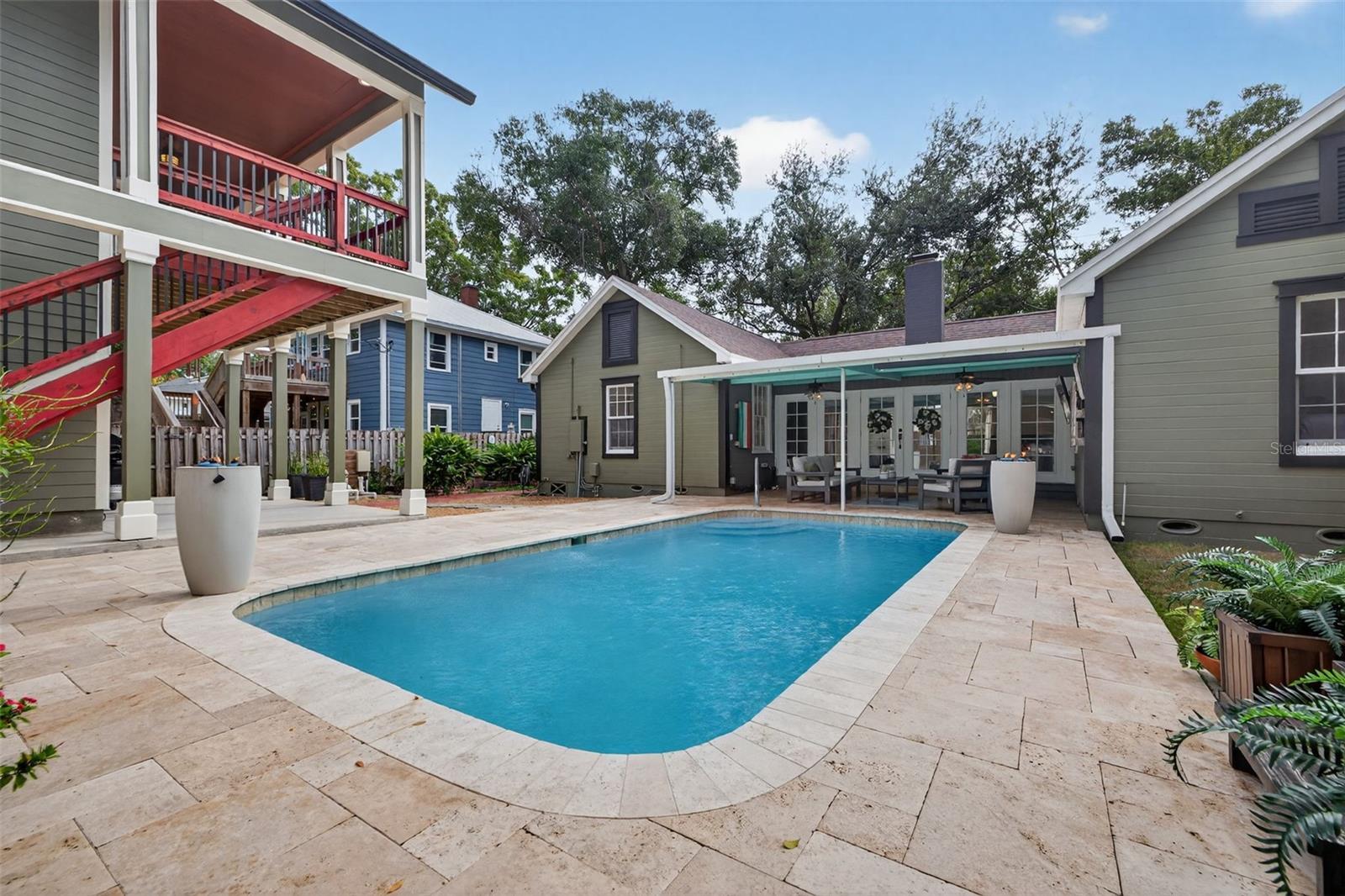 Welcome to a Crescent Heights property you don’t come across often. This home will stop you in your tracks. Set on an oversized 75-ft wide lot, this home offers rare, sought-after features and a backyard that truly feels like a retreat. The main bungalow has been beautifully cared for by the same owners for over 20 years. Featuring 4 bedrooms, 2 updated bathrooms (renovated in 2024), original hardwood floors, and a cozy wood-burning fireplace. One of the bedrooms has its own en-suite bath and private entrance, giving you a great option for guests, an office, or a quiet separate suite. Step outside where the backyard oasis will instantly put you in vacation mode. Grab your favorite tropical drink and enjoy the large pool (refinished in 2021), hot tub, and, the real showstopper, a custom cabana. In 2020, the owners added a standout ADU, one of the largest in the neighborhood. It includes 2 bedrooms, 1 bathroom, a full kitchen, a spacious living room, a motorized lift and its own porch. It’s ideal for multi-generational living, guests, or added income. The detached, fully finished garage brings even more usable space with AC, an upgraded hurricane-rated door, a full bathroom, generous storage, and two laundry hookup locations. Updates include Duration® Series 50 year roof shingles (2019), two 2025 gas tankless water heaters, remodeled bathrooms, upgraded plumbing, and an insulated garage door with upgraded hardware and a wall mount opener. All utilities are conveniently on one meter. This is a rare chance to own a true compound in one of St. Pete’s most loved neighborhoods: non-flood zone, tree-lined streets, and close to everything you love.