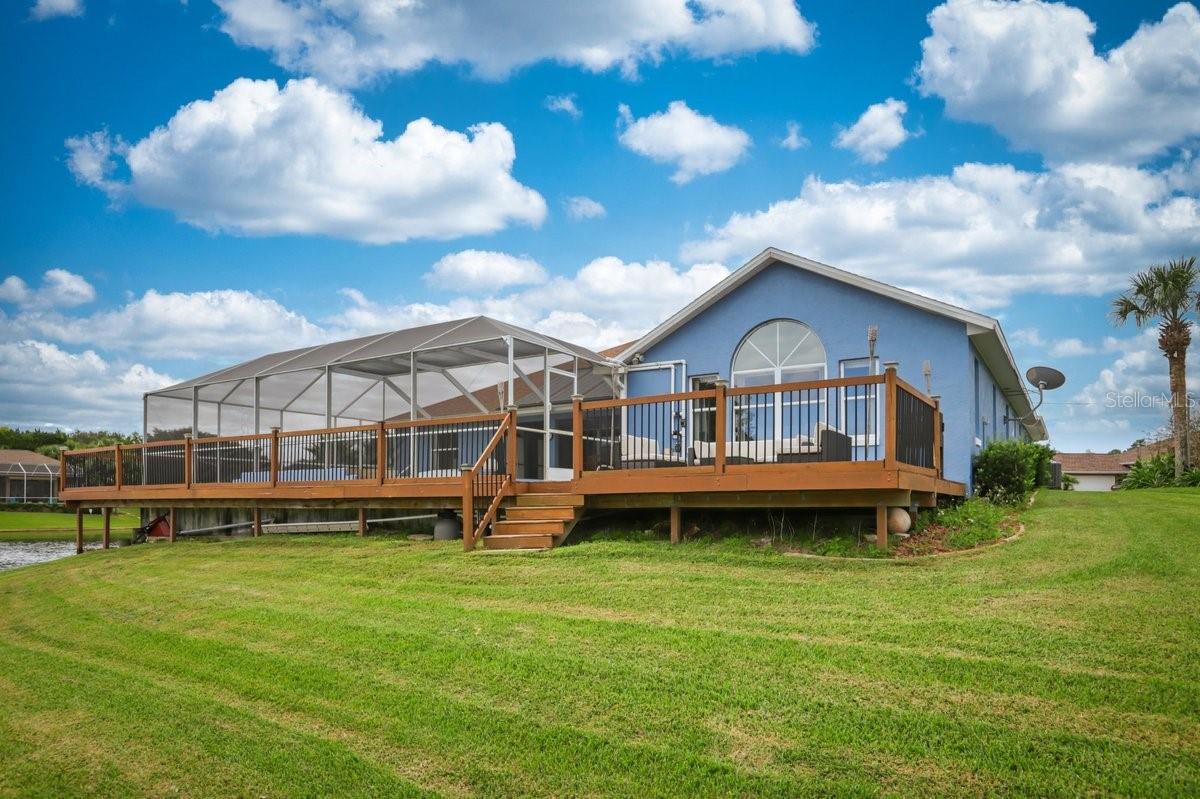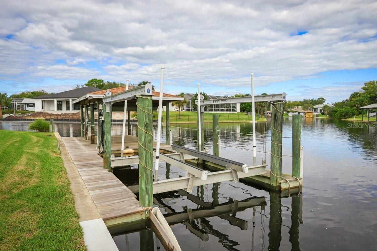 One or more photo(s) has been virtually staged. Welcome to your waterfront paradise! This stunning 4-bedroom, 2.5-bath pool home sits on a rare tip lot with approximately 180 feet of saltwater canal frontage—just minutes to the Intracoastal Waterway. Enjoy breathtaking water views from nearly every room, a screened solar-heated pool with a waterfall, and a private boat dock with a 10,000 lb lift, perfect for all your boating adventures. Step inside an open, light-filled floor plan with soaring ceilings, granite countertops, and spacious living and dining areas ideal for entertaining. The primary suite features both his and her walk-in closets and a fully renovated spa-like bathroom with a soaking tub and walk-in shower. Direct pool access from the formal living room, family room, dining area, and one of the guest bedrooms creates seamless indoor-outdoor living. Recent upgrades include a 2017 roof and a 2023 A/C system. Relax on the patio as boats glide by, or fish right from your backyard—every day feels like a vacation. *Includes a home warranty*