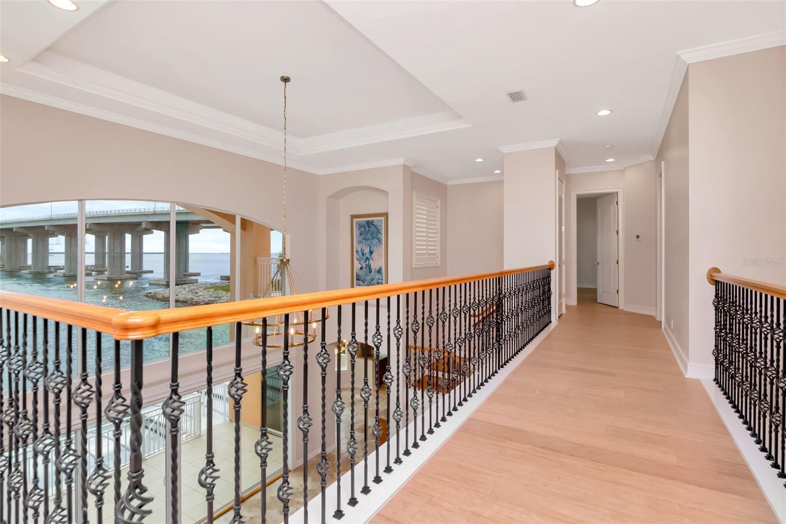 One or more photo(s) has been virtually staged. Experience the best of waterfront living in this beautifully appointed 5-bedroom, 6-bath residence offering 4,168 square feet of thoughtfully designed space. Built in 2000, this elegant home is perfectly positioned to showcase sweeping views of Tampa Bay and the iconic Sunshine Skyway Bridge. Ideal for the car enthusiast, the entire first level serves as an expansive garage that can easily accommodate a sizable collection. With two full bathrooms for poolside convenience and a generous flex space currently used as a bar, the lower level offers versatility for entertaining or additional storage. Upon entering the foyer, you are greeted by a dramatic two-story living room where oversized windows bathe the space in natural light and frame unobstructed views of the bay. The open, split-floorplan centers around the primary suite, a serene retreat featuring dual walk-in closets, a spacious bath with soaking tub and walk-in shower, and private access—via a spiral staircase—to the dedicated upstairs office or study. Designed for entertaining, the expansive kitchen offers abundant counter space for meal prep, a breakfast nook overlooking the water, and seamless flow to the living and dining areas. Guests will appreciate the convenience of a downstairs bedroom located near an adjacent full bath—perfect for comfort and accessibility. The third floor hosts three additional bedrooms, including one ensuite and two connected by a Jack-and-Jill bath. The office/study and rear bedroom each open to their own terraces, providing idyllic spaces to enjoy daily sunrises, sunsets, and the tranquil beauty of the bay. Located within an exclusive gated cul-de-sac of just seven luxury homes, this property offers privacy, security, and an elevated sense of retreat. Boating enthusiasts will love the private dock equipped with a lift and jet ski floating dock—perfect for effortless days on the water and prime fishing for the sportsman. A rare opportunity to own a waterfront sanctuary that seamlessly blends luxury, comfort, and the unmatched allure of Tampa Bay living.
