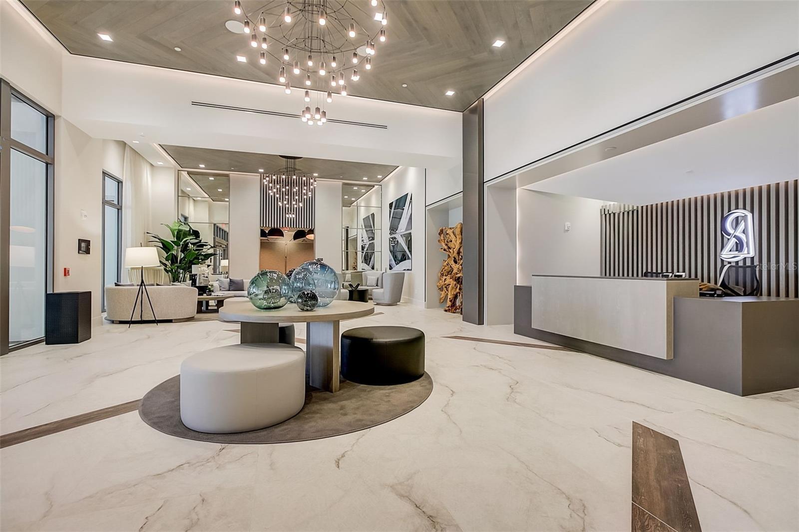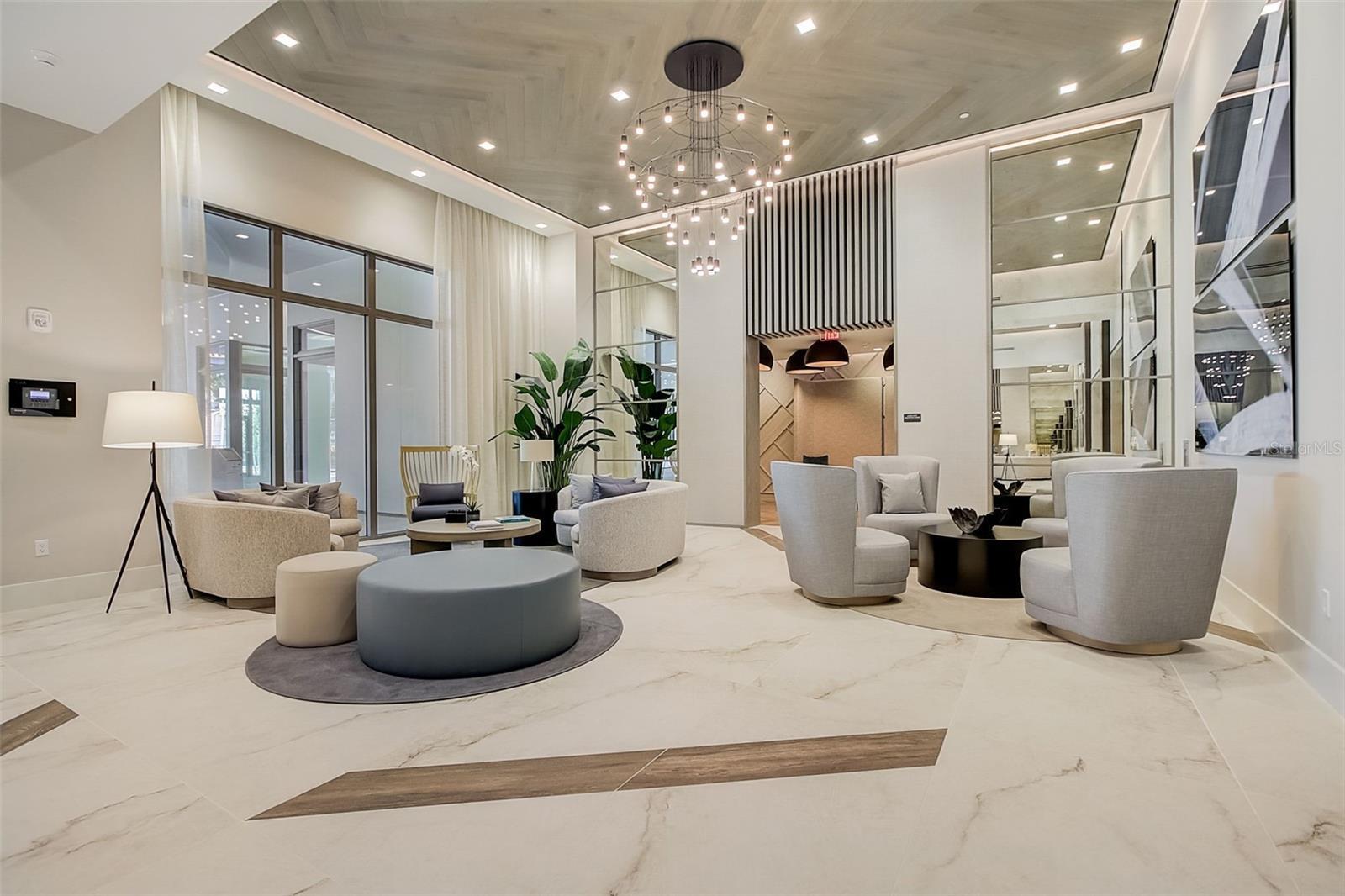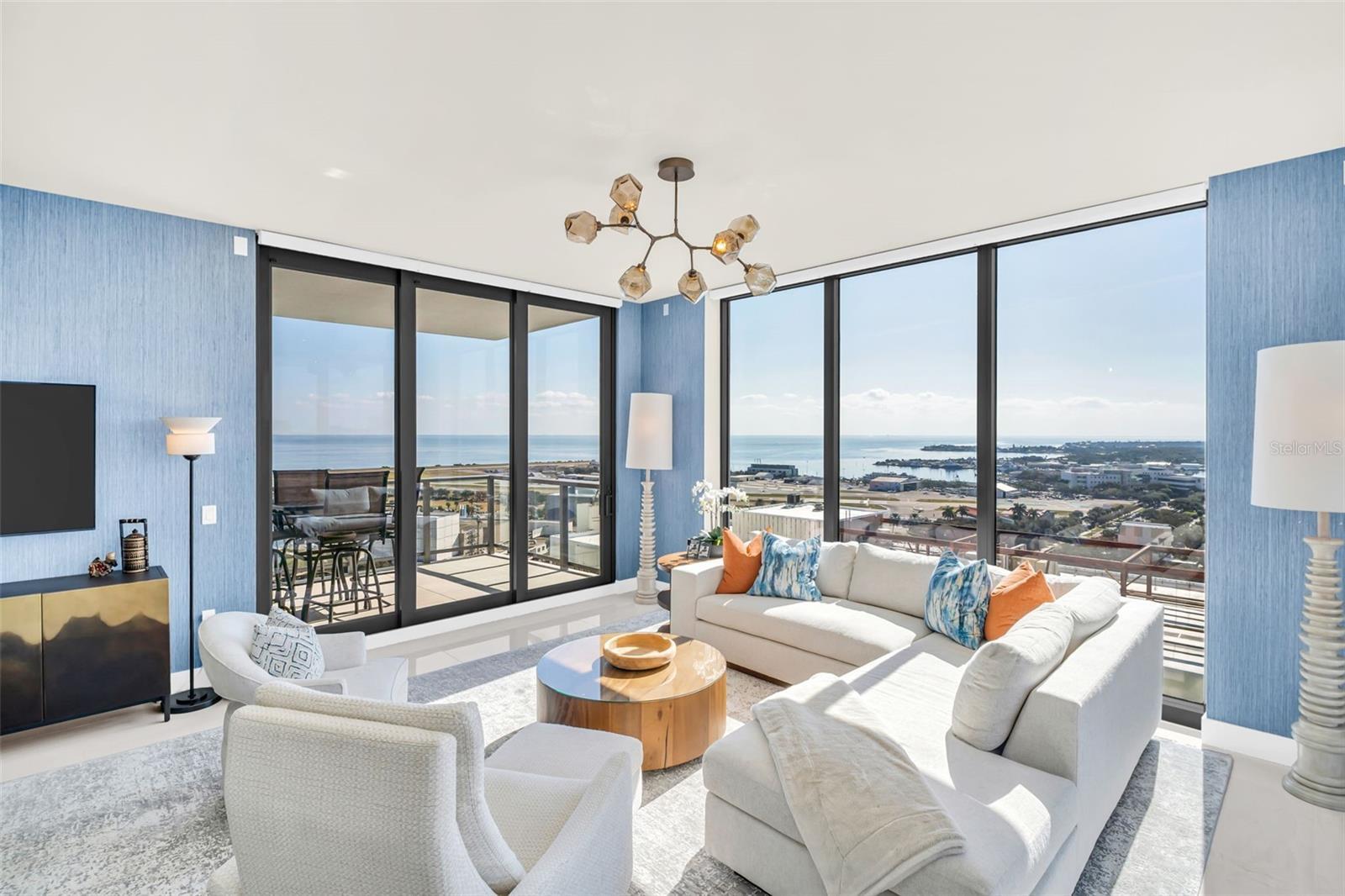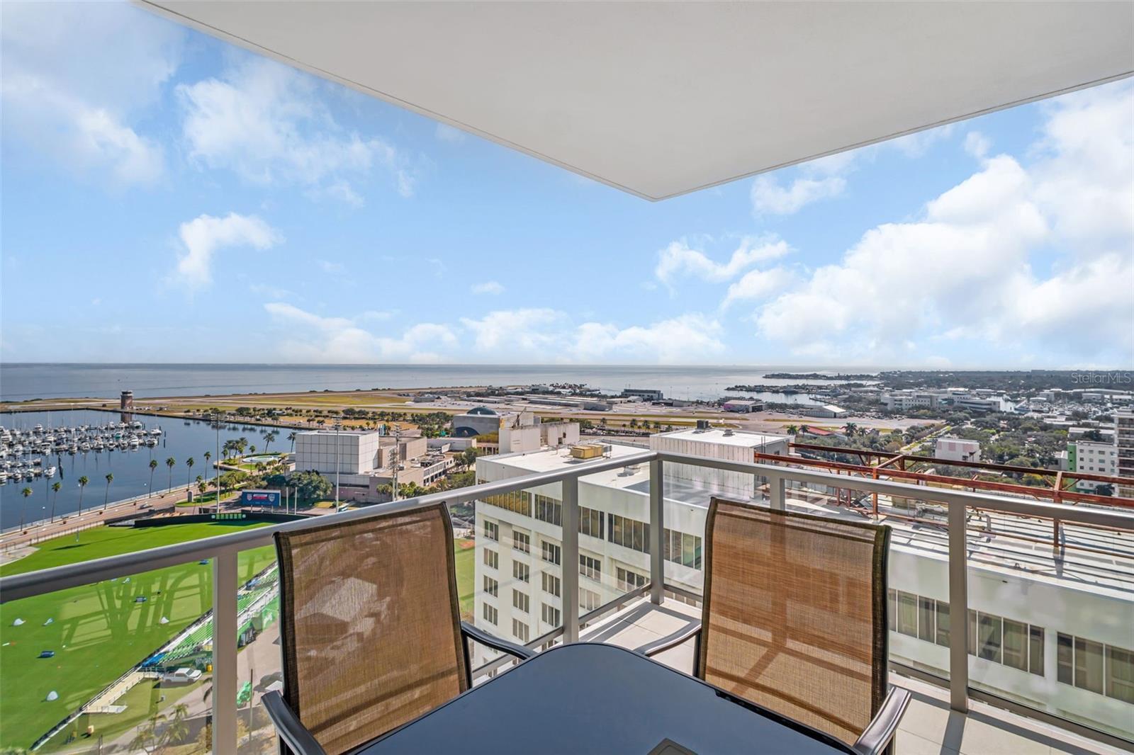 Experience elevated luxury living in this spectacular 2-bedroom + den, 3-bath residence at Saltaire, one of downtown St. Petersburg’s most prestigious waterfront towers. This highly coveted and rarely available floor plan, spans 2,172 square feet, and showcases UNMATCHED 180° VIEWS from Tampa Bay and the iconic Skyway Bridge, down the peninsula, and all the way west toward the beaches. Watch sunrises and sunsets from TWO PRIVATE BALCONIES, enjoy a front-row seat to flights taking off from Albert Whitted Airport, and take in the beauty of St. Pete from every room. Inside, this meticulously upgraded home blends modern sophistication with thoughtful functionality. The enclosed den creates a true third bedroom, while the open main living areas are framed by floor-to-ceiling glass that brings the water and skyline indoors. Designer enhancements include an upgraded electrical package, Hunter Douglas Silhouette & Pirouette window treatments, premium tile flooring with professionally sealed grout throughout, high-quality neutral wall coverings in the primary suite, and an elegant blue textured accent wall that mirrors the tones of the bay. Electrical upgrades include power at all toilets, TV-height outlets in bedrooms and den, plus dedicated EV-ready wiring accessible from TWO included parking spaces positioned just steps from the elevator doors. The kitchen is appointed with premium cabinetry, an upgraded induction cooktop, expanded pantry with pull-out shelving, and seamless flow into the dining and living spaces. A tilt-mount living room TV allows for effortless viewing from multiple angles. Both bedrooms feature finished custom closets, while upgraded ceiling fan/light kits add comfort and style throughout. Living at Saltaire offers the comfort of 24-hour concierge service and secured entry, plus an incredible lineup of amenities, including a 7th-floor resort-style pool with bay views, a fully equipped fitness center, beautiful club rooms, and a private dog park. You’ll be moments from waterfront parks, fantastic restaurants, unique shops, nonstop events, and the city’s beloved arts scene. It’s downtown St. Petersburg living at its finest—where lifestyle and luxury meet effortlessly.