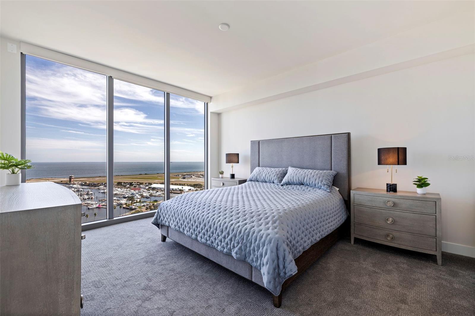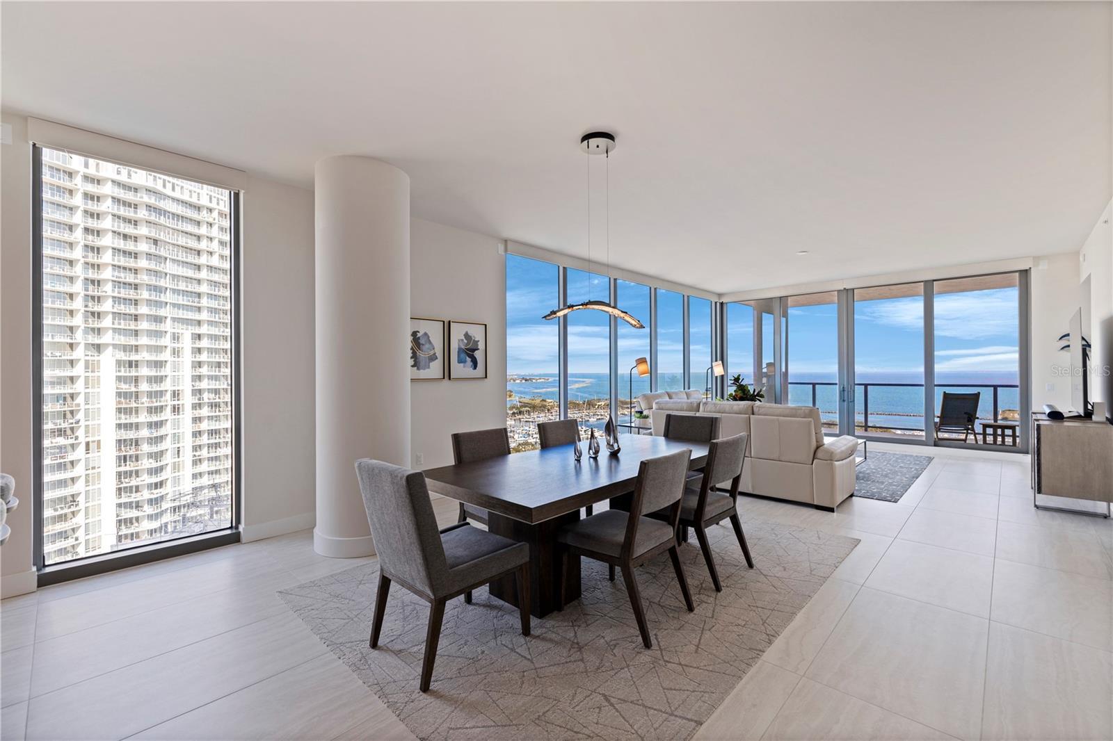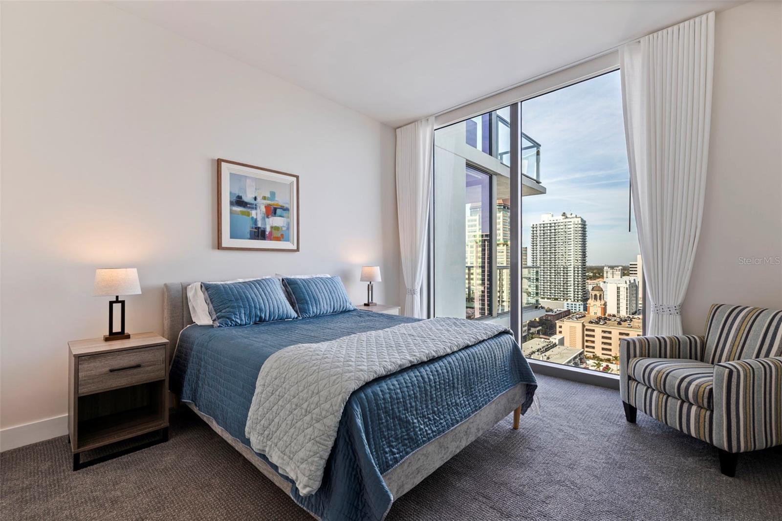 Welcome to Residence 2103 at Saltaire. Perched on the 21st floor in the tower’s most coveted corner with a northeast exposure, this residence offers sweeping, unobstructed views of Tampa Bay, the St. Pete Pier, and the downtown skyline. This rare 2,712 sq ft, three-bedroom, four-bath home combines refined design, modern convenience, and resort-style amenities in one of St. Pete’s most desirable luxury high-rises. It is the largest floor plan in the building other than the penthouse. Floor-to-ceiling glass captures expansive water and city vistas from sunrise over the bay to the glow of downtown at sunset, while automated shades provide effortless comfort at the touch of a button. The open-concept layout is ideal for both everyday living and entertaining. The gourmet kitchen enjoys stunning views and features JennAir appliances, sleek stone countertops, and an oversized island with seating for four. The adjoining living and dining spaces flow seamlessly to a covered terrace, creating the perfect setting for morning coffee over the bay or evening cocktails as the city comes alive. A thoughtfully designed split floor plan ensures privacy throughout. The primary suite offers inspiring panoramic views and an elevated bathroom retreat with dual vanities, a soaking tub, a separate walk-in shower, and two generous walk-in closets. The guest wing includes two additional bedrooms, each with en-suite baths and walk-in closets, along with a full guest bath and a spacious laundry room. A separate enclosed den with a transom window provides an ideal work-from-home space or media room. This residence includes two secure garage parking spaces equipped with an EV charger, conveniently located just steps from the elevator. Saltaire’s seventh-floor Aire Deck delivers a true resort-style experience, featuring a pool and spa with cabanas, outdoor kitchens with grills, and a bar with a large TV for movie nights or game days by the pool. On the same level, residents enjoy a bayfront fitness center, a private dog park, a clubroom, and multiple lounge spaces designed for relaxation and connection. Additional amenities include 24/7 lobby staff, concierge services, and valet parking. Live in the heart of it all. Watch sailboats drift across the bay and small planes land at Albert Whitted Airport from your balcony. Walk to the Saturday Morning Market at Al Lang, catch a Rowdies game, enjoy dinner along Beach Drive, explore The Dali and other world-class museums, or unwind at the St. Pete Pier — all just steps from your front door. This is more than a residence; it is the ultimate downtown St. Pete lifestyle, delivered at its finest.