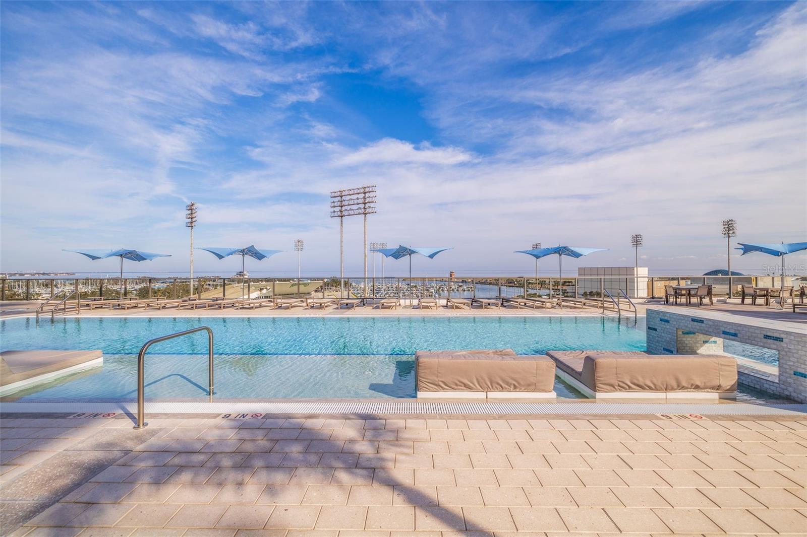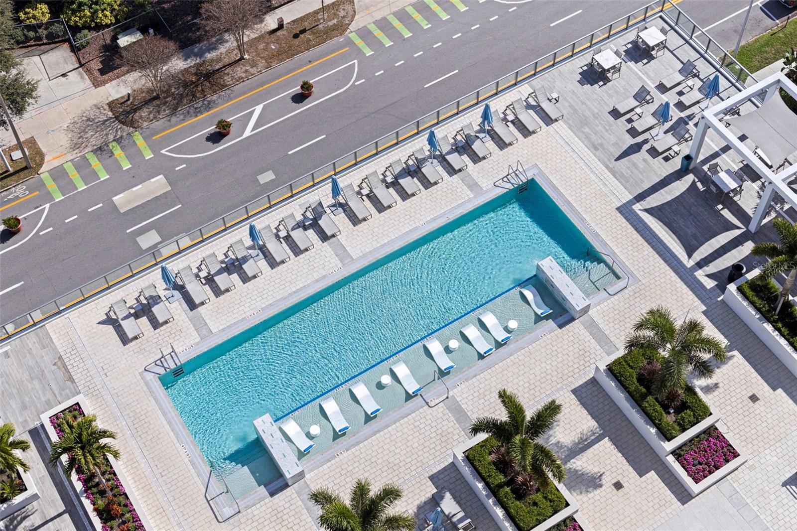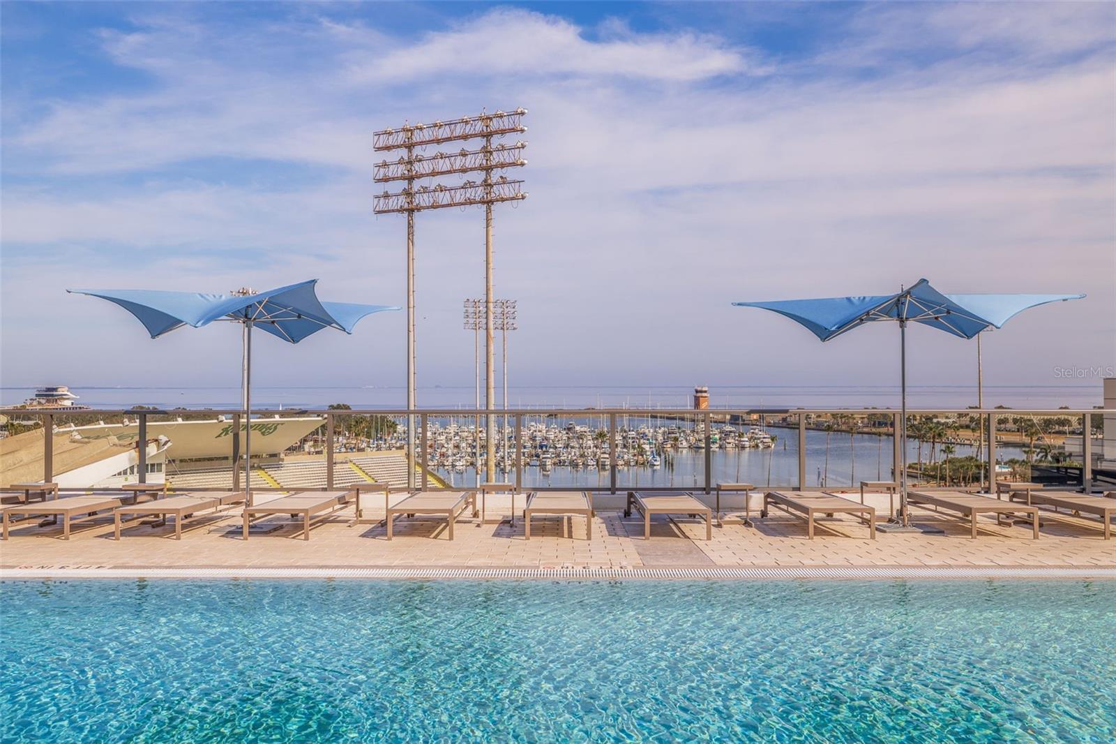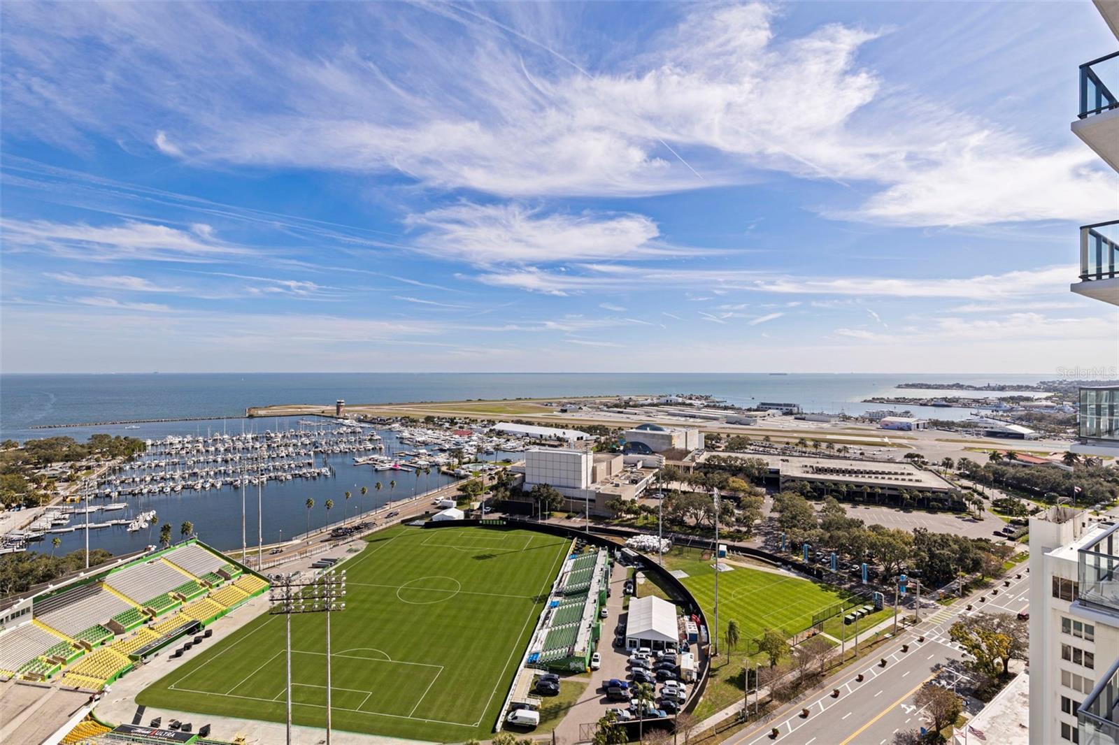 Welcome to Residence 2103 at Saltaire. Perched on the 21st floor in the tower’s most coveted corner with a northeast exposure, this residence offers sweeping, unobstructed views of Tampa Bay, the St. Pete Pier, and the downtown skyline. This rare 2,712 sq ft, three-bedroom, four-bath home combines refined design, modern convenience, and resort-style amenities in one of St. Pete’s most desirable luxury high-rises. It is the largest floor plan in the building other than the penthouse. Floor-to-ceiling glass captures expansive water and city vistas from sunrise over the bay to the glow of downtown at sunset, while automated shades provide effortless comfort at the touch of a button. The open-concept layout is ideal for both everyday living and entertaining. The gourmet kitchen enjoys stunning views and features JennAir appliances, sleek stone countertops, and an oversized island with seating for four. The adjoining living and dining spaces flow seamlessly to a covered terrace, creating the perfect setting for morning coffee over the bay or evening cocktails as the city comes alive. A thoughtfully designed split floor plan ensures privacy throughout. The primary suite offers inspiring panoramic views and an elevated bathroom retreat with dual vanities, a soaking tub, a separate walk-in shower, and two generous walk-in closets. The guest wing includes two additional bedrooms, each with en-suite baths and walk-in closets, along with a full guest bath and a spacious laundry room. A separate enclosed den with a transom window provides an ideal work-from-home space or media room. This residence includes two secure garage parking spaces equipped with an EV charger, conveniently located just steps from the elevator. Saltaire’s seventh-floor Aire Deck delivers a true resort-style experience, featuring a pool and spa with cabanas, outdoor kitchens with grills, and a bar with a large TV for movie nights or game days by the pool. On the same level, residents enjoy a bayfront fitness center, a private dog park, a clubroom, and multiple lounge spaces designed for relaxation and connection. Additional amenities include 24/7 lobby staff, concierge services, and valet parking. Live in the heart of it all. Watch sailboats drift across the bay and small planes land at Albert Whitted Airport from your balcony. Walk to the Saturday Morning Market at Al Lang, catch a Rowdies game, enjoy dinner along Beach Drive, explore The Dali and other world-class museums, or unwind at the St. Pete Pier — all just steps from your front door. This is more than a residence; it is the ultimate downtown St. Pete lifestyle, delivered at its finest.