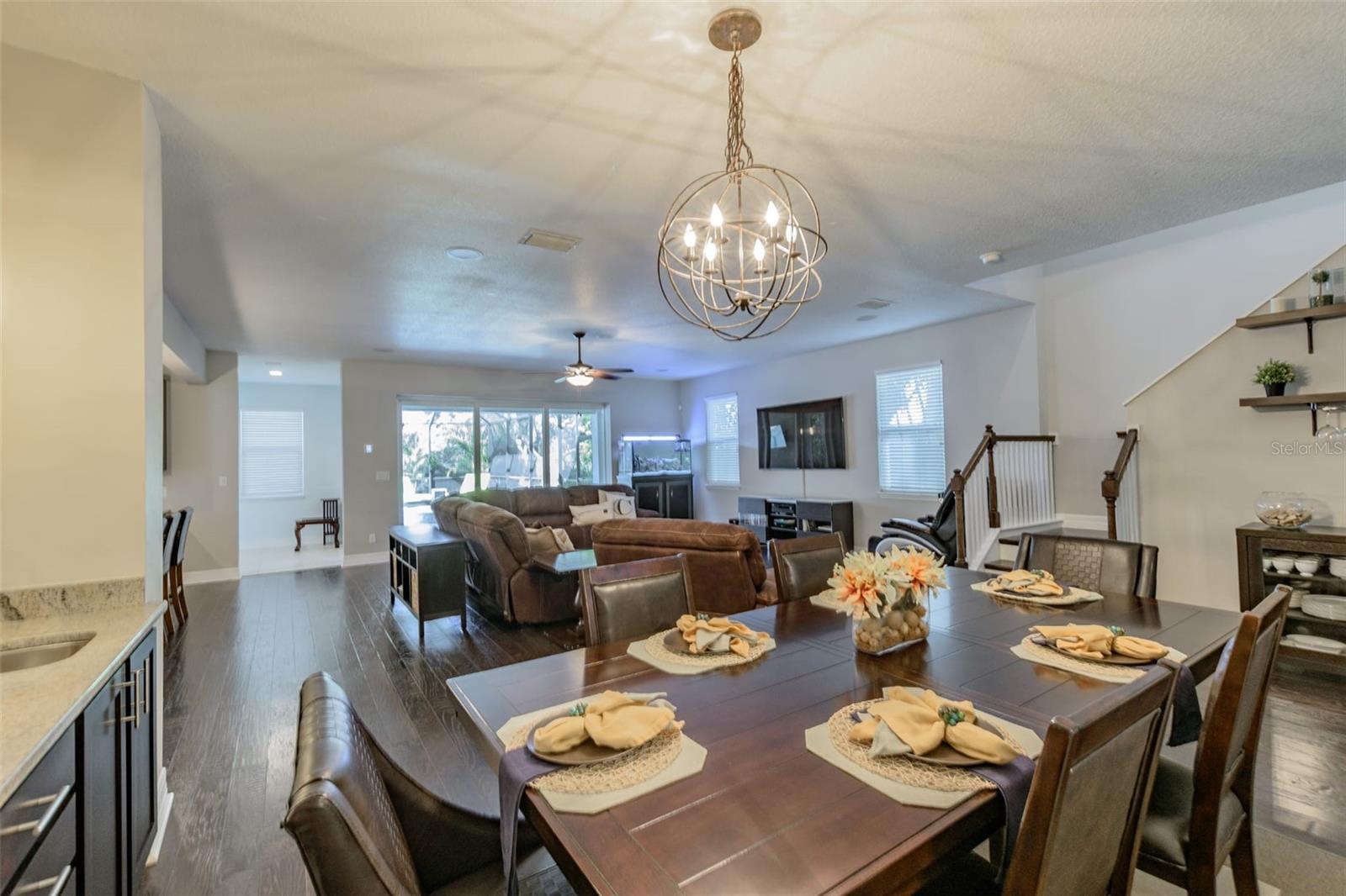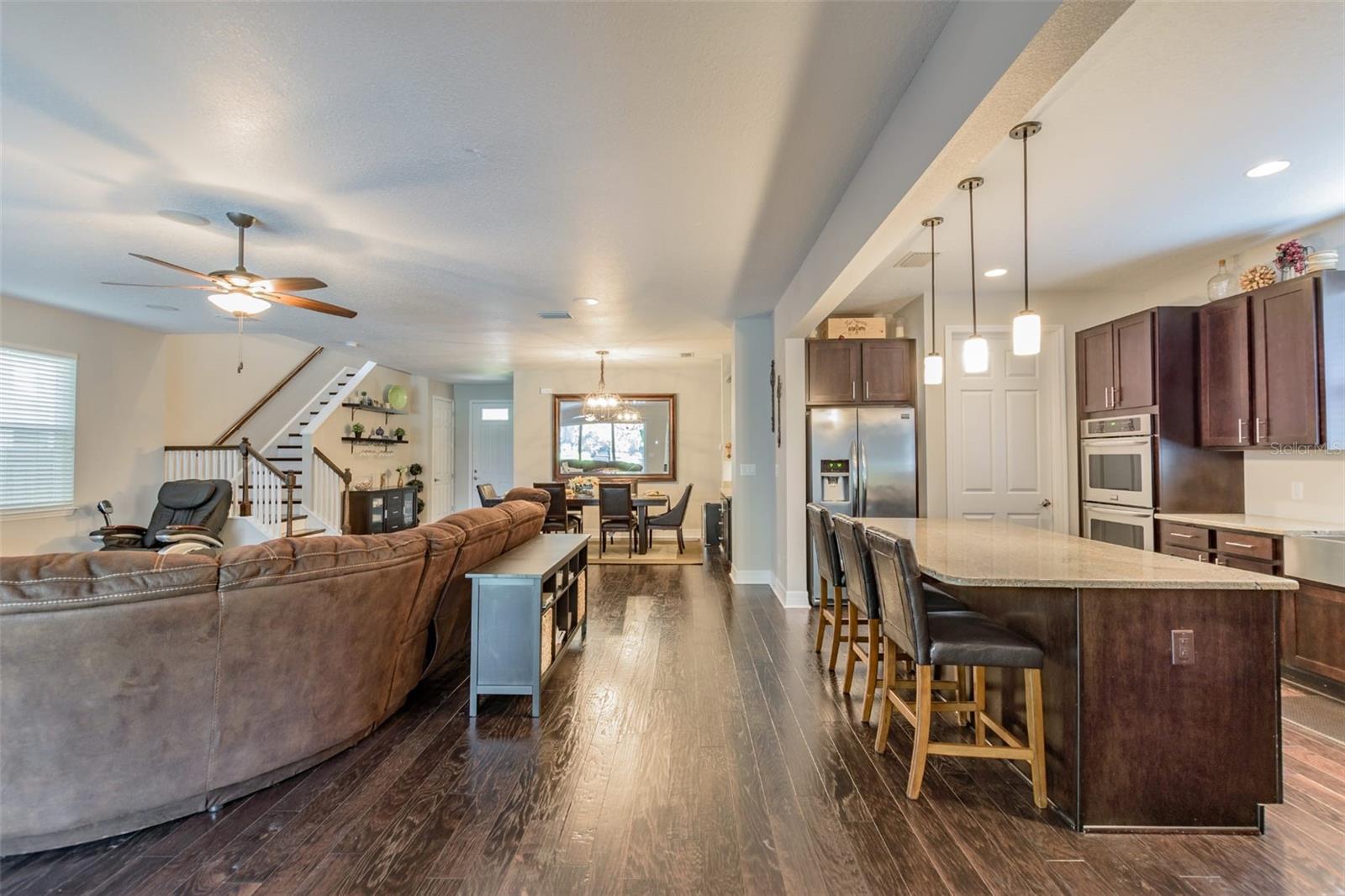 - Ceiling Fans(s), High Ceilings, Kitchen/Family Room Combo, Living Room/Dining Room Combo, Open Floorplan, Stone Counters