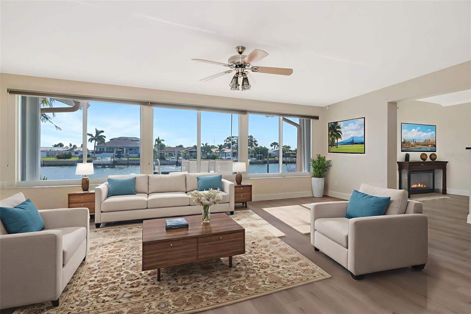 One or more photo(s) has been virtually staged. MOVE-IN READY with breathtaking waterfront views! This beautifully renovated 3 bedroom, 2 bathroom, Treasure Island home in desirable Capri Isle offers the ultimate coastal lifestyle. Inside, you will find an open light-filled floor plan, new flooring throughout, and lots of storage. The kitchen has new cabinets, granite countertops, new appliances, and sliding glass doors to the paved backyard. Cozy up by the two-sided fireplace shared by the living room and primary suite, which features a sitting area, custom walk-in closet, and spa-like bath. Sliding glass doors off of the primary bedroom and living space lets you relax on the screened porch overlooking the water. The split floorplan offers the additional bedrooms and a bathroom with a tub/shower combo. Extras include an indoor laundry room with utility sink, water purification system, hurricane shutters, and a composite boat dock. Community amenities include outstanding recreational facilities, a dog park, playground, and walking paths. Close to award winning sandy beaches, shops and restaurants. Easy access to downtown St. Petersburg, museums and art district. Don’t let this wonderful opportunity to own a slice of paradise sail away! Schedule a showing today!