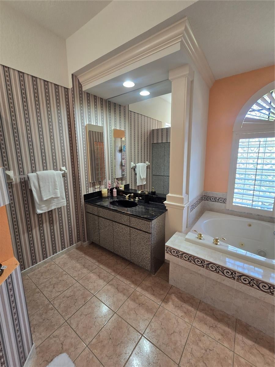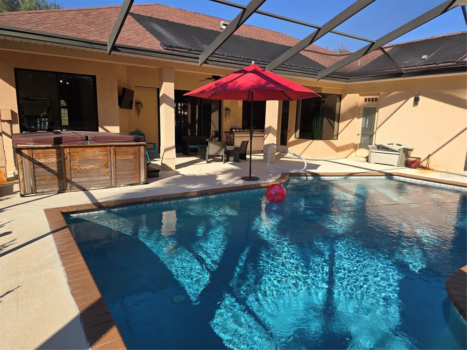 Welcome to your new home! Light and bright well-maintained single-level home in the gated community of Pickert Estates on half-acre lot. Open floorplan with living room, formal dining room, and spacious family room with red brick electric fireplace. Eat-in kitchen features corian counters, stainless appliances, breakfast bar, walk-in pantry, and plenty of cabinets. Master suite with sitting area, two walk-in closets, and spacious bath with glass-block accents, walk-in tile-surround shower, separate tub, and dual vanities. Split bedroom floorplan, plantation shutters, ceiling fans, and tile throughout this lovely home. AC replaced in 2019. Clerestory cut-out accents and built-in shelving in family room and master. Access to patio from master bedroom, living room, kitchen, second bath, and bedroom. Inside laundry with sink and extra upper/lower cabinet storage. Desk alcove for convenience with built-in book shelves. Enjoy outdoor living in the screened lanai with sparkling solar-heated salt water pool, above-ground heated spa, and outdoor kitchen. Large grassy fenced yard with outdoor storage shed. Buyer to verify all information and measurements.