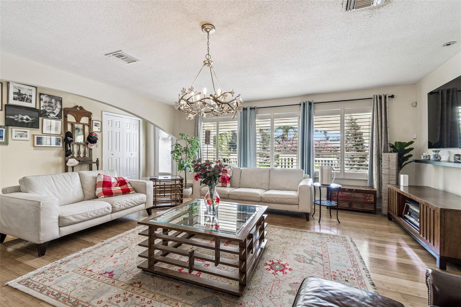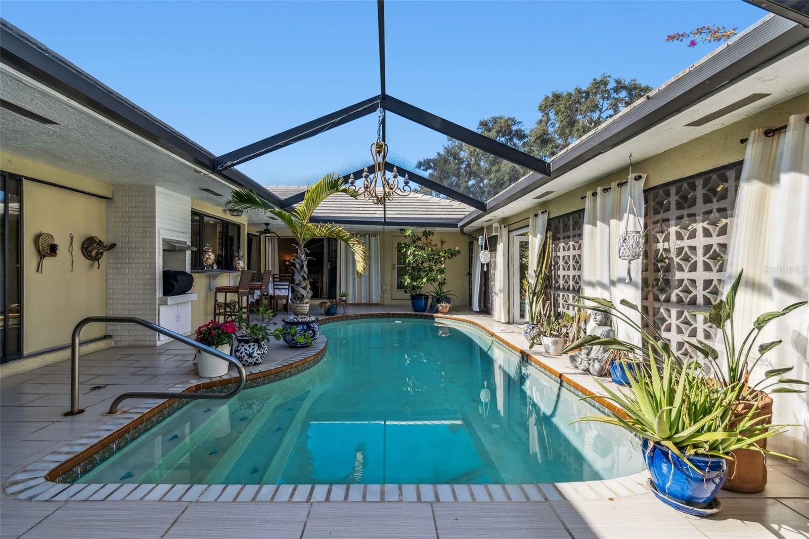 Nestled in the much desired Pinellas Point neighborhood of Saint Petersburg, this beautifully updated 3 bedroom, 2 1/2 bath home offers 2,206 sqft of refined living space with exceptional indoor- outdoor flow. COMPLETELY HIGH & DRY. Enjoy the extended, custom tiled front porch to the serene solar heated, complete lanai enclosed, saltwater pool, every detail reflects comfort, style, and quality of craftsmanship. Inside enjoy expansive natural light provided by beautiful windows and doors, gorgeous plantation shutters throughout. The large sunken living room is excellent for entertaining. Crown molding, and strand bamboo flooring gives grace to the home. The open floor plan provides for inviting central gathering with a vast family room featuring built-in cabinetry. Multible sliding glass doors add to the seamless French Chateau feeling as you walk uninterupted through the home and out to the completely enclosed salt water heated pool with adjacent updated bath room with modern elegant vanity. This home features a gourmet kitchen showcasing hardwood cabinetry, blue gray granite countertops, and a striking European-style granite center island. A deep double stainless sink and a ever popular desired, pass-through window the the pool area to enhance effortless entertainment. The large spacious primary suite includes a spacious California walk-in closet, direct private access to the pool, a newly designed primary bedroom features custom lighting, walk-in large shower, and seperate his and hers vanities. The second bath offers a newer installed jetted tub for added relaxation. Outdoor living is exquisit with custom installed full perimeter exterior decorative brick patio with added concrete border for that exceptional stability. In addition, the privacy of this home is sustained by newly installed vinyl fencing, mature landscaping enhances the custom built outside concrete fireplace perfect for evening gathering. An additional elivated tile patio exists on the side of this home adding to its entertainment value while providing seperate sitting areas to enjoy or avoid direct sunlight.. Additional features include, newly enclosed laundary room, spacious two car garage, stone slate roofing, Full security system with lighting, newer, 2024 A/C and hot water tank. This elegant and thoughtfully updated property perfectly blends comfort, sophistication and outdoor Florida living to excellence. Designed to provide a feeling of privacy and European taste. Overhead, you'll enjoy the colors and beauty of the pergola providing for intimacy and shade. If you have ever been to southern Italy or France, you'll understand. This home is an exceptional opportunity in one of Saint Petersburg's most sought-after communities. 20 minutes from two major airports, minutes from major hospitals, shopping, Rt. 275 and the Skyway bridge. The best of Florida beaches, fabulous dining, comedy clubs, beach bars and dancing, hotels, theators, museums and Maximo park with its walking trails and numerous boat launching ability. A ten minute Uber to downtown Saint Petersburg with its diverse stores, entertainment, yacht clubs and central avenue featuring three blocks of shops, dining and music. THE BEAUTY OF PINELLS POINT, is that you exist in a family centered tree lined haven minutes from Saint Petersburg center. Secluded charm with easy access to both the gorgeous Gulf of America with its fishing and boating, or all Tampa Bay has to offer with its charming night life.