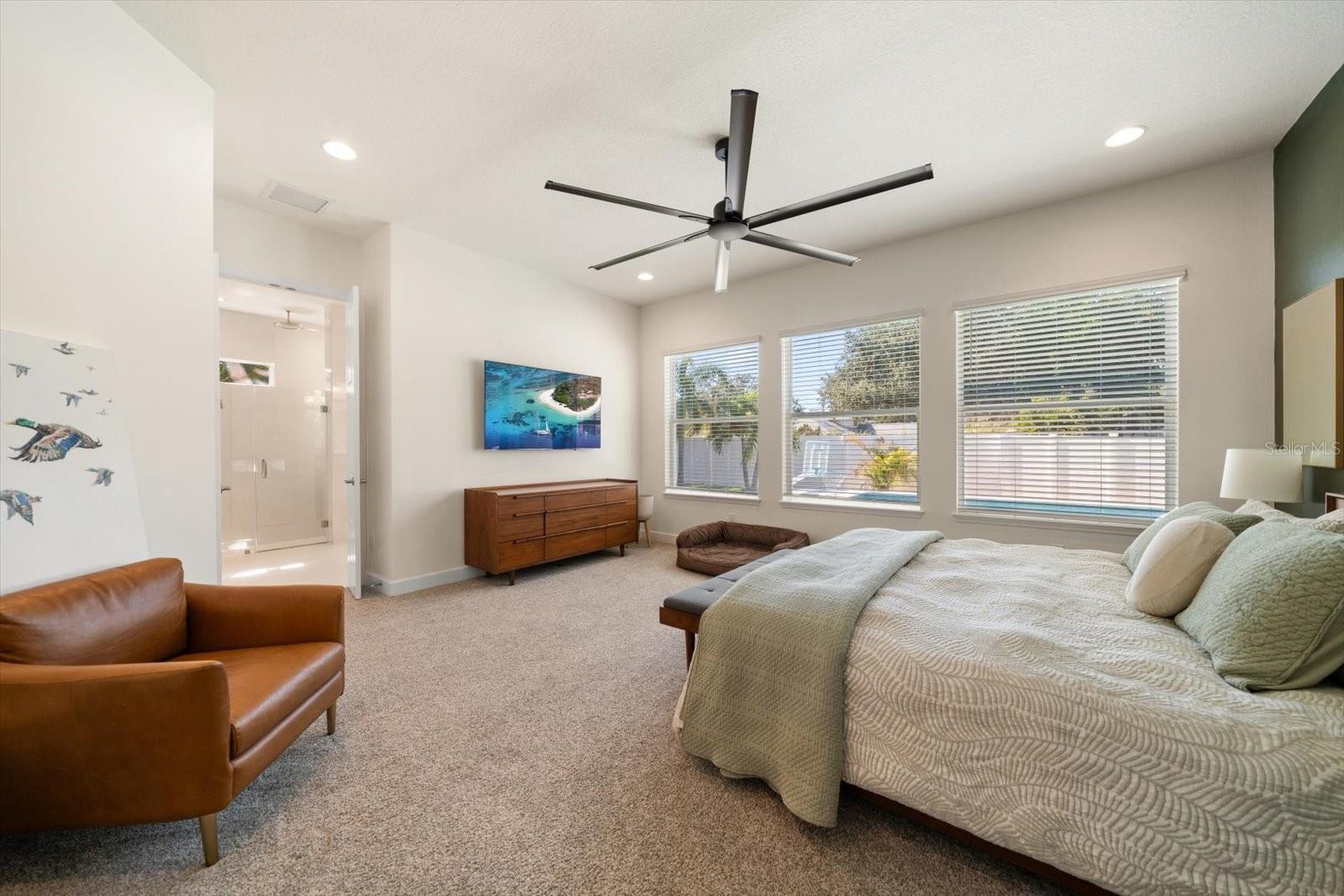 - Built-in Features, Ceiling Fans(s), Crown Molding, Dry Bar, Eat-in Kitchen, High Ceilings, In Wall Pest System, Kitchen/Family Room Combo, Living Room/Dining Room Combo, Open Floorplan, Primary Bedroom Main Floor, Solid Surface Counters, Split Bedroom, Walk-In Closet(s), Window Treatments