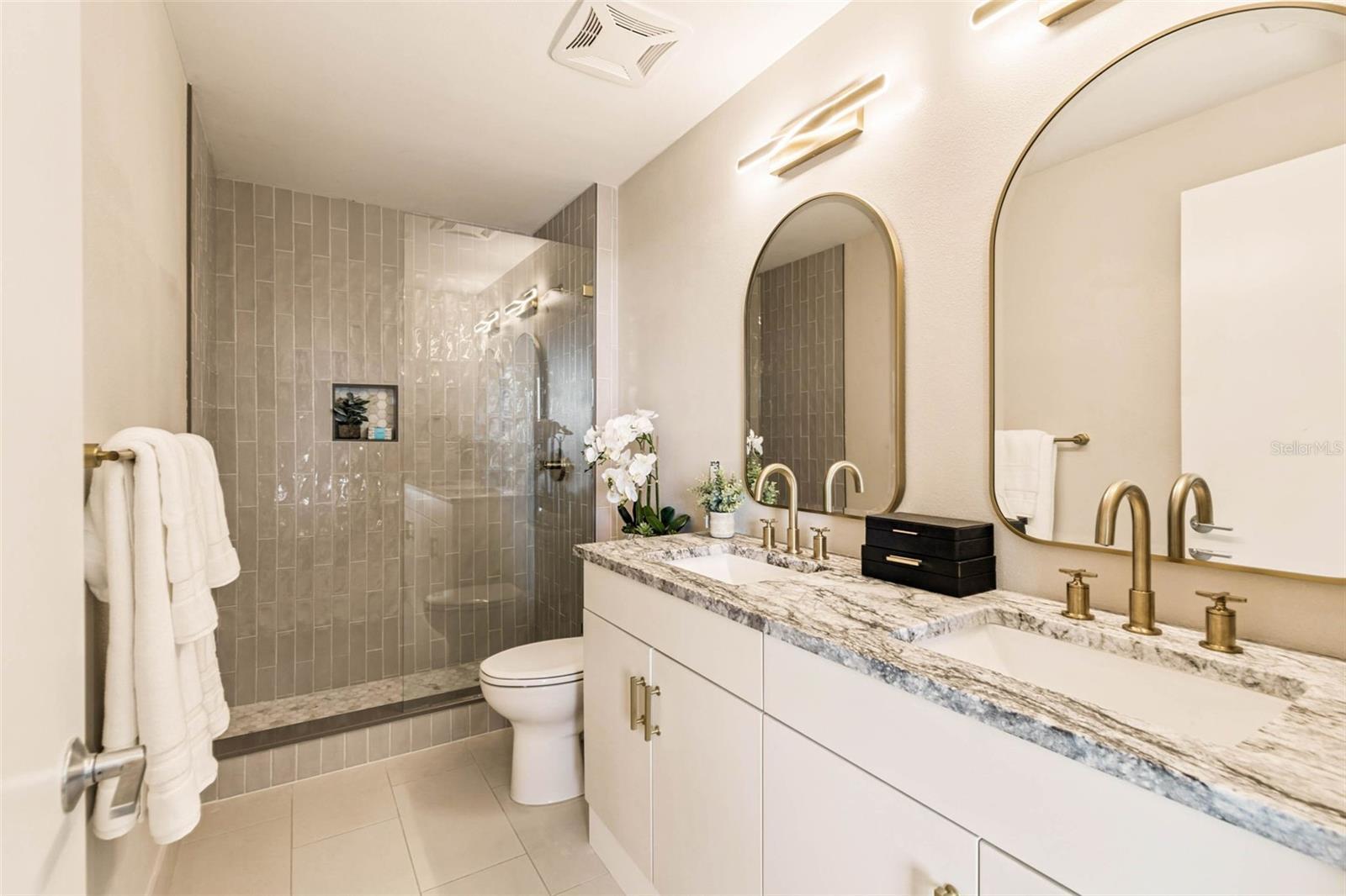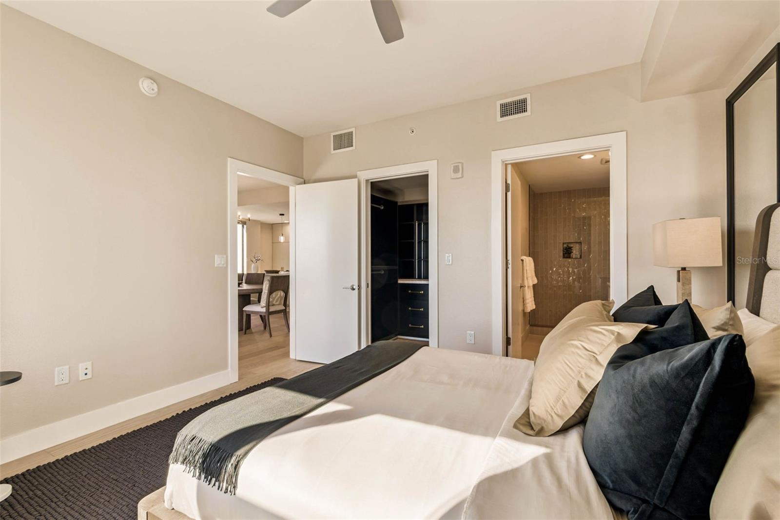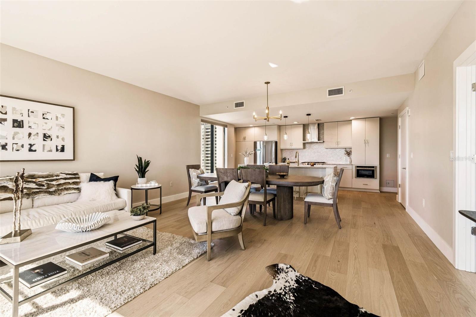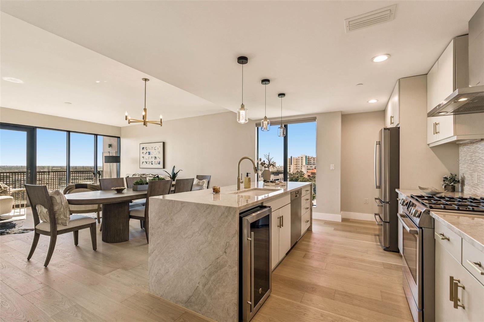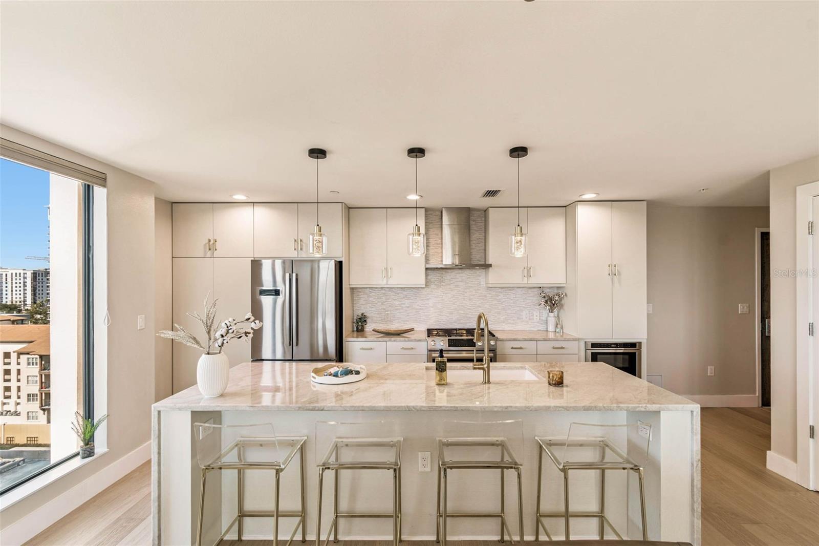 HIGH STYLE DOWNTOWN RETREAT WITH SWEEPING WATER VIEWS, BEAUTIFUL SUNSETS AND EVENING SPARKLING CITY VIEWS! This spectacular CORNER UNIT was EXTENSIVELY RENOVATED and is being OFFERED FULLY FURNISHED with high-end, luxury curated pieces selected specifically for the open concept living space. This exceptional 10th-floor pied-terre at The Salvador showcases sweeping water views of Tampa Bay, Bayfront Marina, Albert Whitted Airport, iconic Sunshine Skyway Bridge and sparkling city skyline at night. Every design element and furnishing in this one-bedroom, one-and-a-half-bath residence has been intentionally curated to complement the home’s sleek and sophisticated modern aesthetic, creating a cohesive, turnkey living experience. The Salvador also provides concierge service and on-site management with secure access for additional enhanced downtown living. Floor-to-ceiling hurricane-impact glass captures dramatic water and city vistas, while the private balcony offers an ideal setting for sunrise coffee or sunset cocktails. Enjoy gourmet cooking in the chef-inspired kitchen featuring stainless steel Bosch appliances, including a five-burner gas cooktop and wine refrigerator, designer tile backsplash, sleek Taj Mahal marble waterfall countertop, designer pendant lighting, sophisticated European-style cabinetry with ample storage, and a breakfast bar ideal for everyday cooking or elevated entertaining. The primary bedroom offers a serene retreat with a floor-to-ceiling impact window framing expansive views. The spacious bedroom includes two custom closets, a walk-in designed by California Closets and a second custom built-in closet for additional storage. The newly updated en-suite bath features Italian marble shower tile, a modern glass shower door, new designer lighting, a leathered matte white Santorini granite dual-sink vanity and elegant gold fixtures. Additional highlights include a newly updated half bath with new fixtures, designer lighting, new vanity featuring leather white Santorini granite countertop, new wide-plank wood flooring throughout the condo, custom 5-inch millwork baseboards, new designer chandelier in the dining space, plus a new front-loading washer and dryer in a dedicated in-unit laundry space with custom built-in additional storage. The Salvador, a boutique 74-residence LEED-certified tower, offers resort-style amenities including a heated saltwater pool, spa, fire pit lounge with outdoor grill, state-of-the-art fitness center, well-appointed clubroom, dedicated dog park with washing station and secure garage parking. This pet-friendly building is near award-winning Dali Museum, Mahaffey Theater, The Pier, Demens Landing, waterfront parks and a wide array of restaurants, art galleries, nightlife and shopping in thriving downtown St Petersburg.