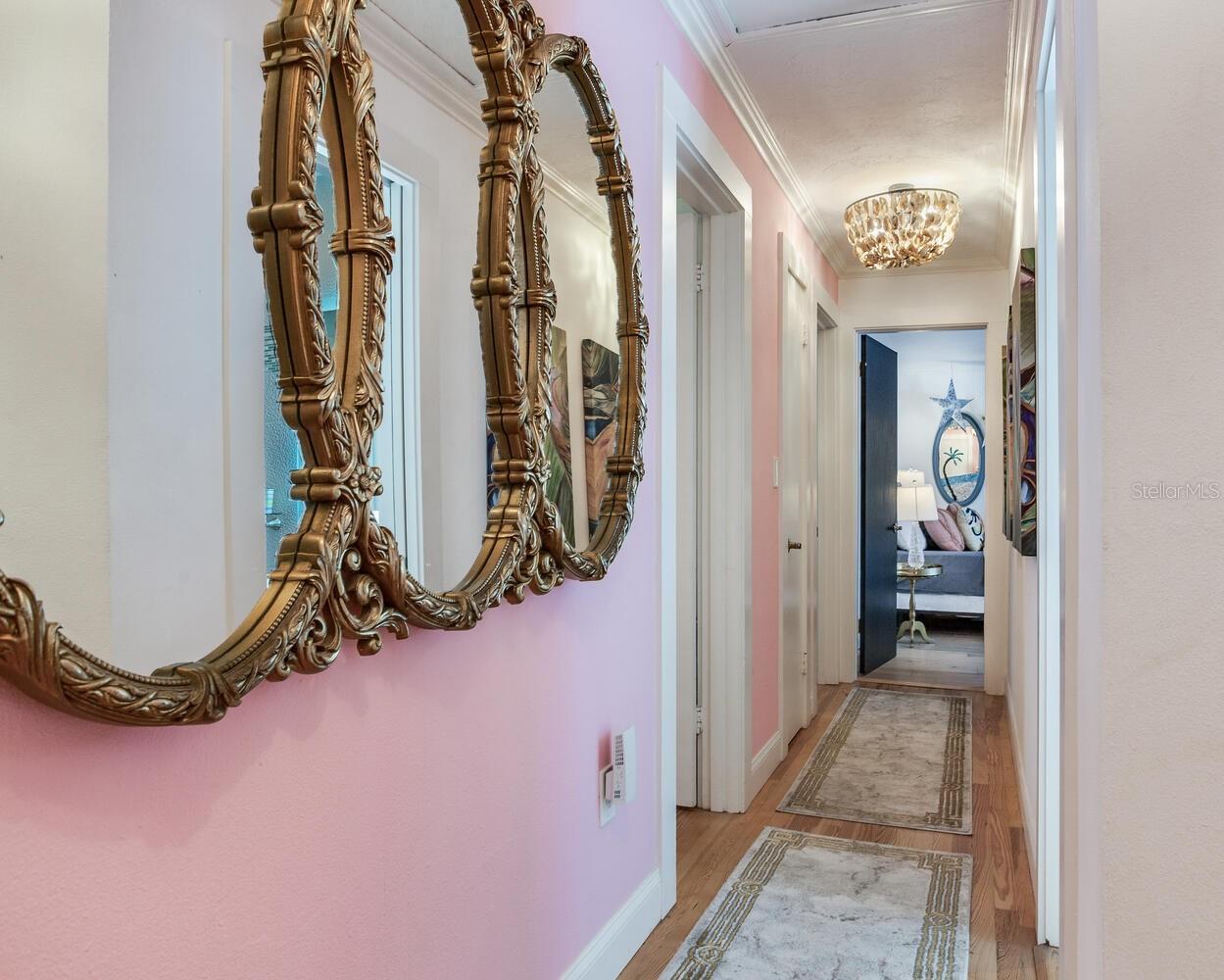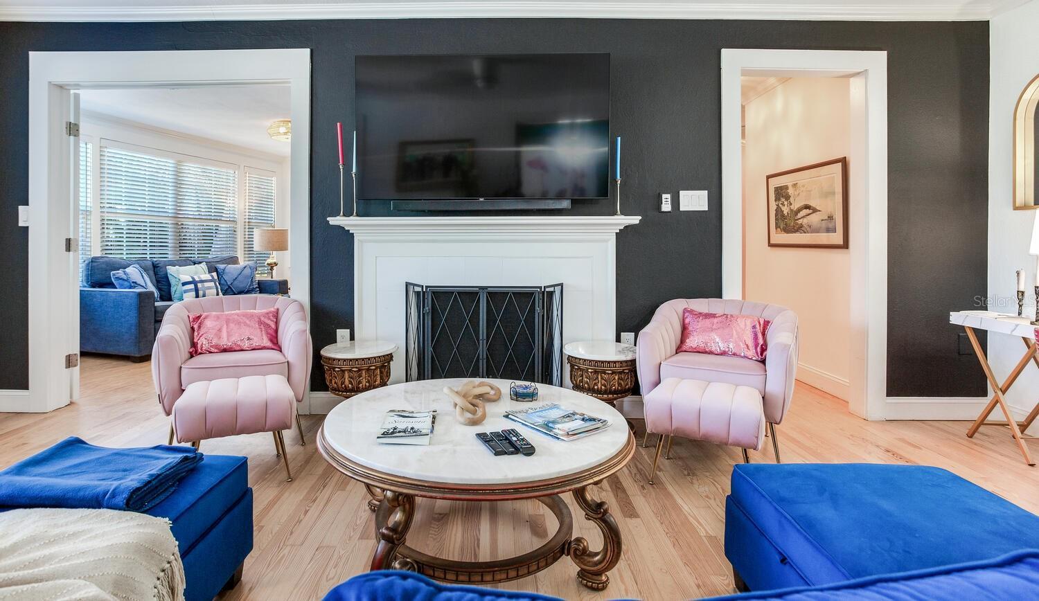 Under contract-accepting backup offers. Welcome to 1960 Lincoln Drive — a one-of-a-kind Sarasota retreat where vintage Florida charm meets vibrant, modern style. Tucked behind lush tropical landscaping in one of Sarasota’s most desirable west-of-trail neighborhoods, this beautifully updated 3-bedroom home radiates personality and warmth from the moment you arrive. A custom hand-painted “Flamingo Motel” mural sets the tone for the playful coastal-boutique feel found throughout the home. Inside, a bright and spacious living area features hardwood floors, abundant natural light, and a cozy fireplace framed by dramatic accent walls and chic designer touches. The dining room makes a statement with its lush green feature wall, crystal chandeliers, and seamless flow into the kitchen—perfect for entertaining. The updated kitchen blends charm and function with white cabinetry, quartz countertops, patterned tile flooring, open shelving, a statement pink SMEG refrigerator, and a large window overlooking the pool. The indoor–outdoor living continues with a fully screened lanai offering multiple lounging areas, dining space, and serene views of the private backyard oasis. The sparkling pool is surrounded by mature landscaping, creating a peaceful and secluded feel ideal for relaxing or hosting guests. Additional features include a dedicated bar area, updated lighting throughout, a spacious two-car garage, and a beautifully maintained front yard with a brick walkway that enhances the home’s curb appeal. Just minutes to Southside Village, Downtown Sarasota, world-famous Siesta Key Beach, and top-rated schools, this property offers both style and location. Whether you’re seeking a full-time residence or a fun Sarasota getaway, this home delivers a truly unforgettable living experience.