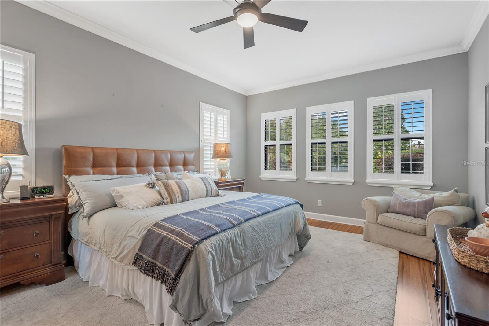 - Ceiling Fans(s), Chair Rail, Crown Molding, Eat-in Kitchen, High Ceilings, In Wall Pest System, Kitchen/Family Room Combo, Pest Guard System, Primary Bedroom Main Floor, Solid Surface Counters, Solid Wood Cabinets, Split Bedroom, Stone Counters, Thermostat, Vaulted Ceiling(s), Walk-In Closet(s), Window Treatments