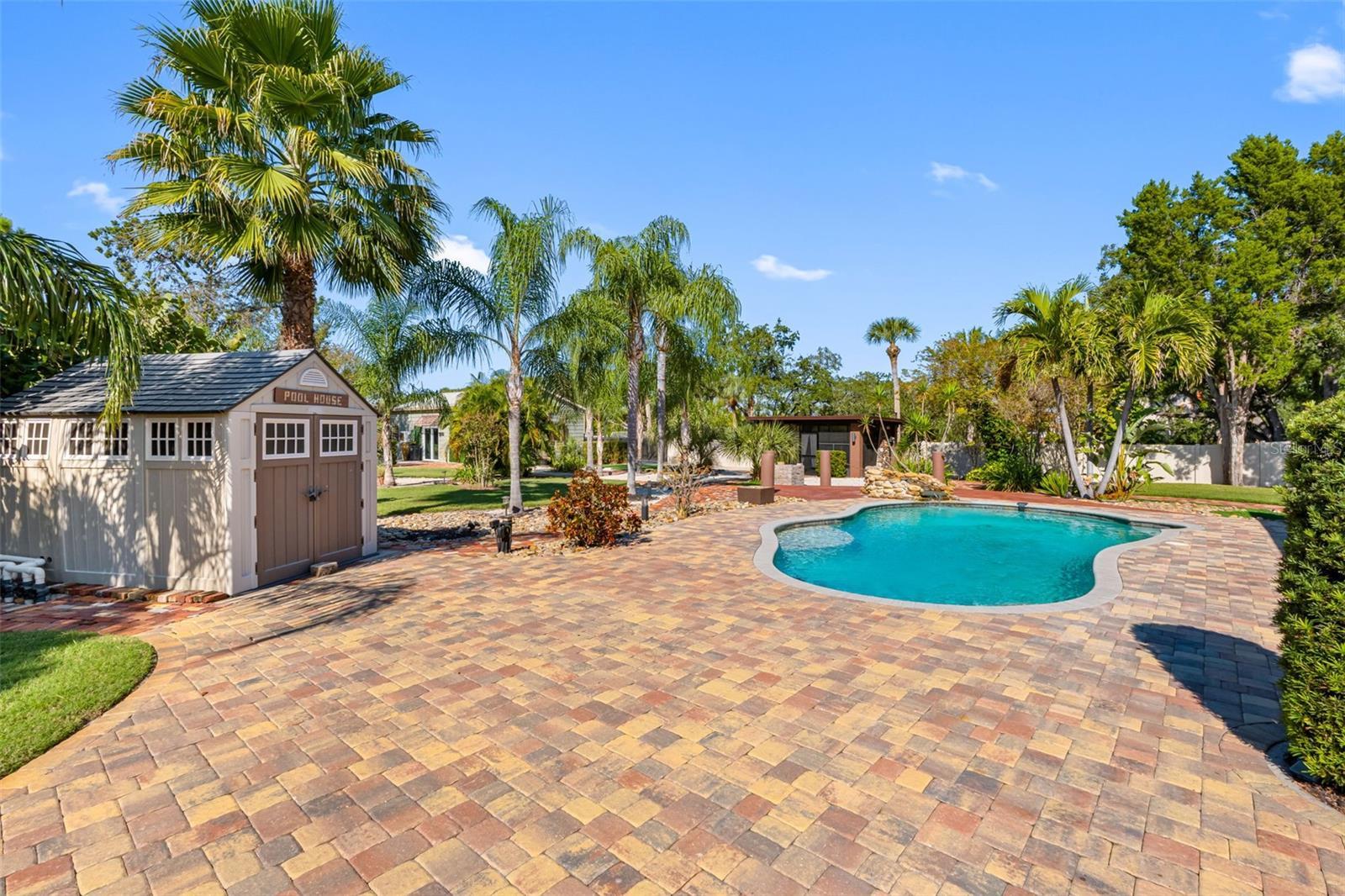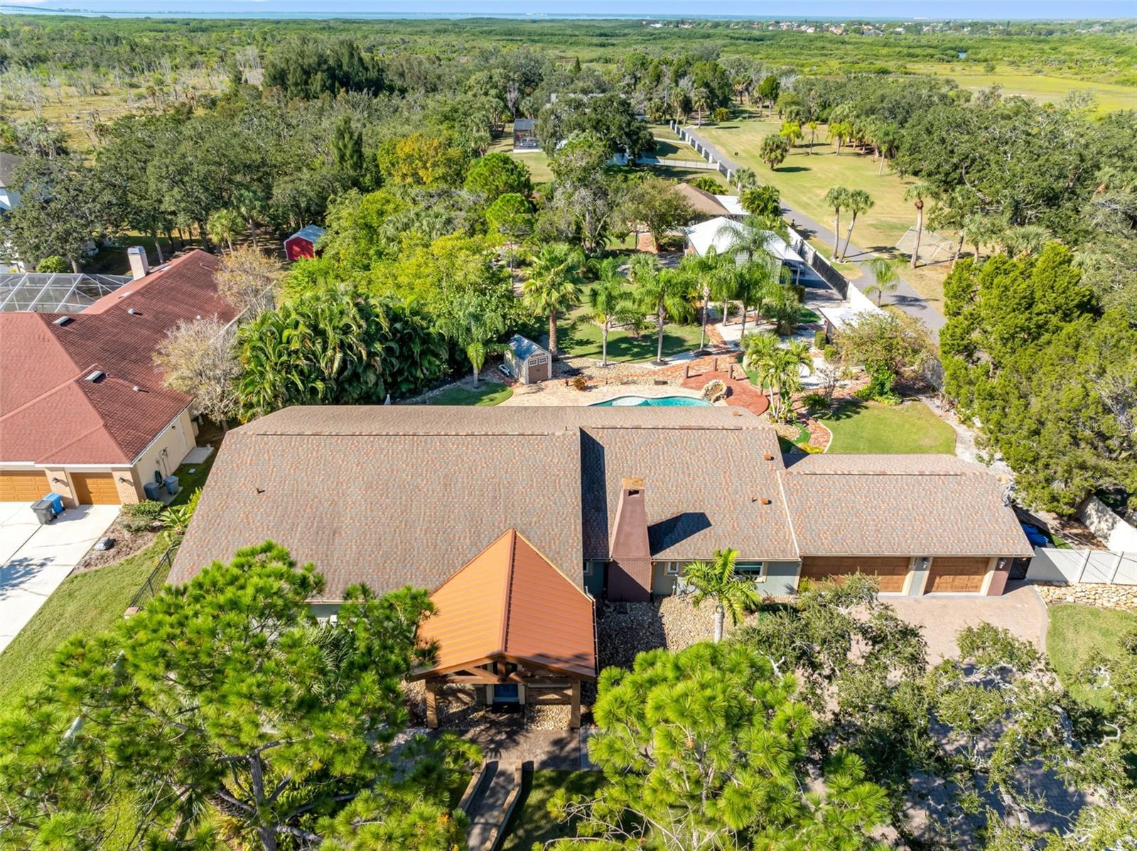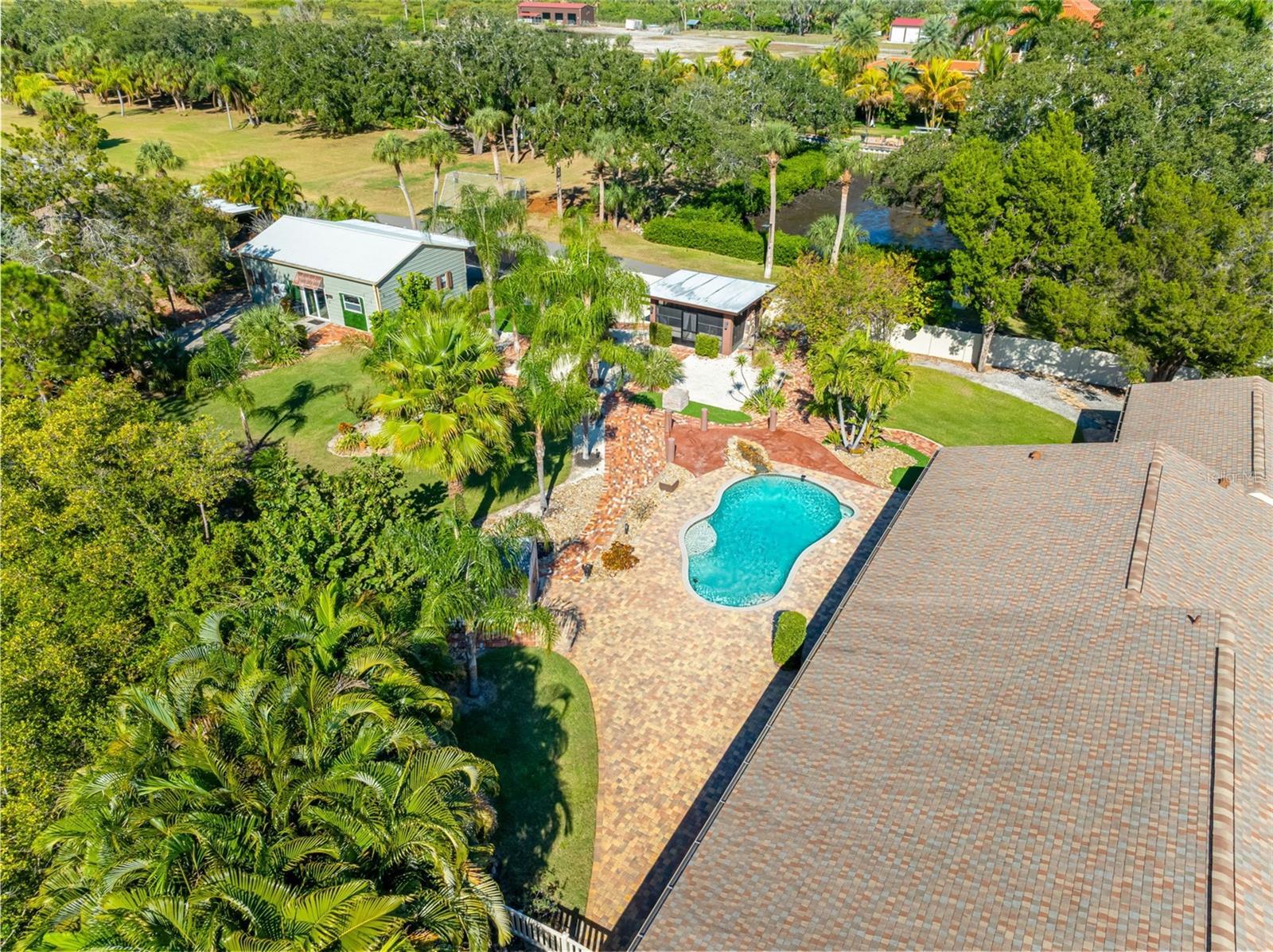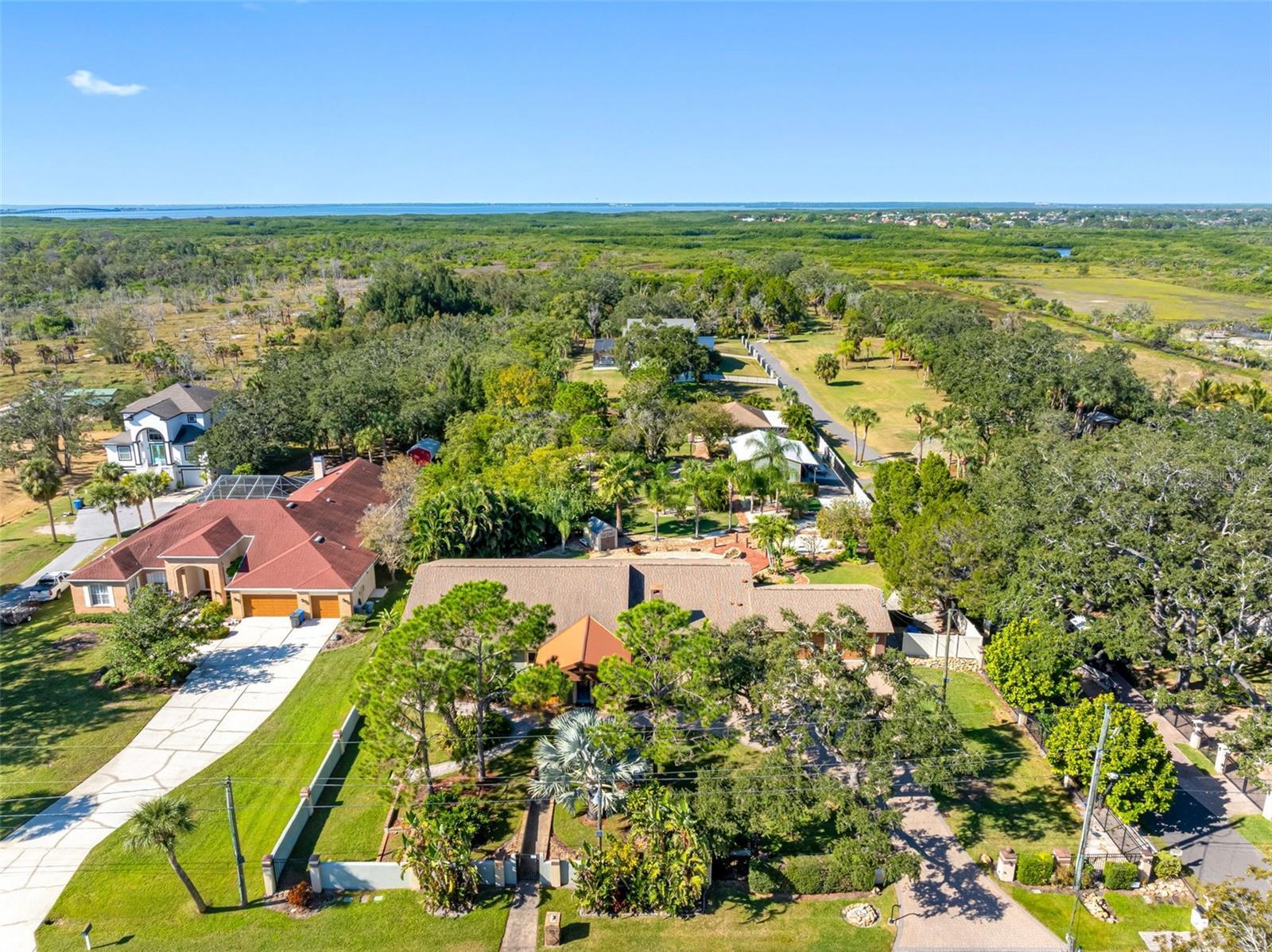 One or more photo(s) has been virtually staged. Welcome to this unique, one-of-a-kind, executive gated estate sitting on 1.25 acres of pristine landscaping. As you enter the home you are greeted by a large foyer with plenty of natural light. The oversized family room offers vaulted ceilings, updated custom tile flooring, updated lighting, dual ceiling fans and a stone accent wall. Just off the family room you will find an updated half bath. The kitchen has been fully remodeled including granite countertops and a custom tile backsplash, and stainless-steel appliances-a true chef’s dream. A large farmers sink with a window overlooks the rear pool area, and a center island with unique exposed granite edging complete with slide out convection microwave. An abundance of cabinets offers plenty of storage and space in the eat-in nook with custom flooring. A wood burning fireplace with a large hearth and propane option for added convenience completes this area. The main home has all bedrooms located on the first floor with an upstairs oversized bonus room (16x20), perfect for a play area, media room, home office or to use as an additional bedroom. The primary bedroom has an en-suite bathroom featuring dual sinks, granite countertops, a jetted tub with a tv and a large walk-in shower with multiple shower heads. The walk-in closet is a separate room with custom shelving, sitting area, windows allowing plenty of lighting with a door leading to an outdoor sitting area. Down the hall you will find several built-in closets for storage, two additional spacious bedrooms, and an updated full bathroom with a walk-in shower, all offering plenty of space with large windows. From the eat in kitchen you will find French doors leading to the oversized lanai with a custom crafted vaulted wood ceiling and a spa/hot tub. An oversized saltwater pool surrounded by pavers features a raised rock water spill. All the pool equipment was recently updated and includes a storage shed. This property is perfect for large gatherings and is an entertainer’s delight with brick and paver walkways throughout. A detached two-bedroom guest home with separate entrance is located at the rear of the property. Entering you will find a nice-sized living room, with a full kitchen including granite countertops, stainless steel appliances and plenty of cabinet space including a laundry closet & covered private patio area. Perfect for an in-law suite or out-of-town guests. In addition, there is a detached garage complete with air conditioning, a separate side entrance, a workout area and bathroom. A perfect retreat for a game of poker, workshop or hobby room. Just outside the sliding glass door sits a Basketball court. The main home is equipped with a tankless hot water heater and an additional water heater located in the attached 3-car garage for the kitchen and half bath. The garage has storage shelving, a wet sink with granite countertops and wood cabinets. The laundry area has a wood countertop, cabinets and a stone wall accent. The property also offers a fully screened detached building that is perfect for plants or a sitting area. The property is equipped with an RV pad with 50amp service and a 250-gallon propane tank with plenty of room for all your toys! You will notice a combination of paver walkways and brick that was originally from the streets of St. Pete. Most windows have been updated to “impact resistant”. The block walls are reinforced with concrete and makes the construction extremely strong. A must see Home!