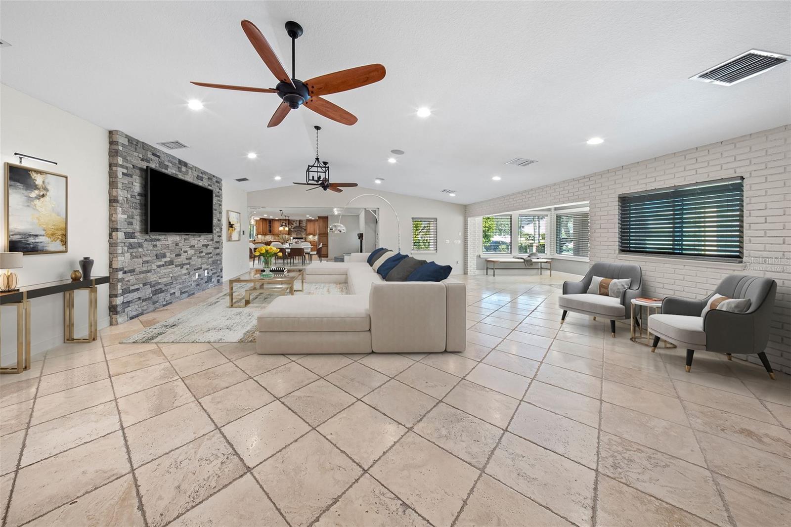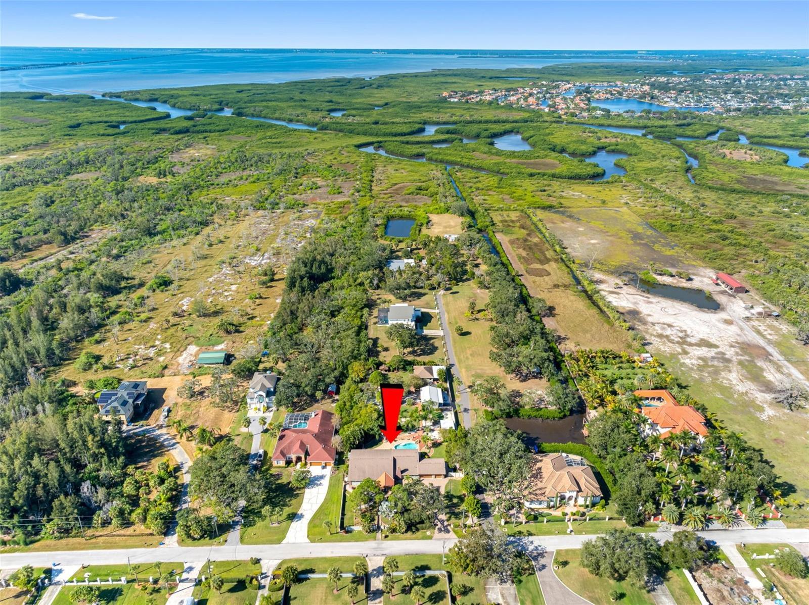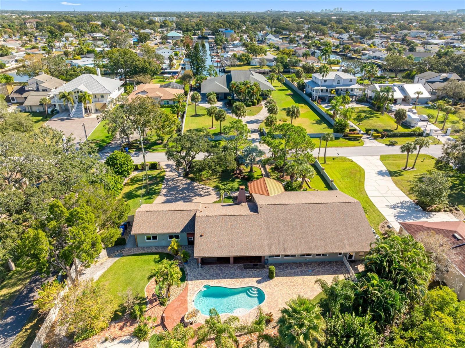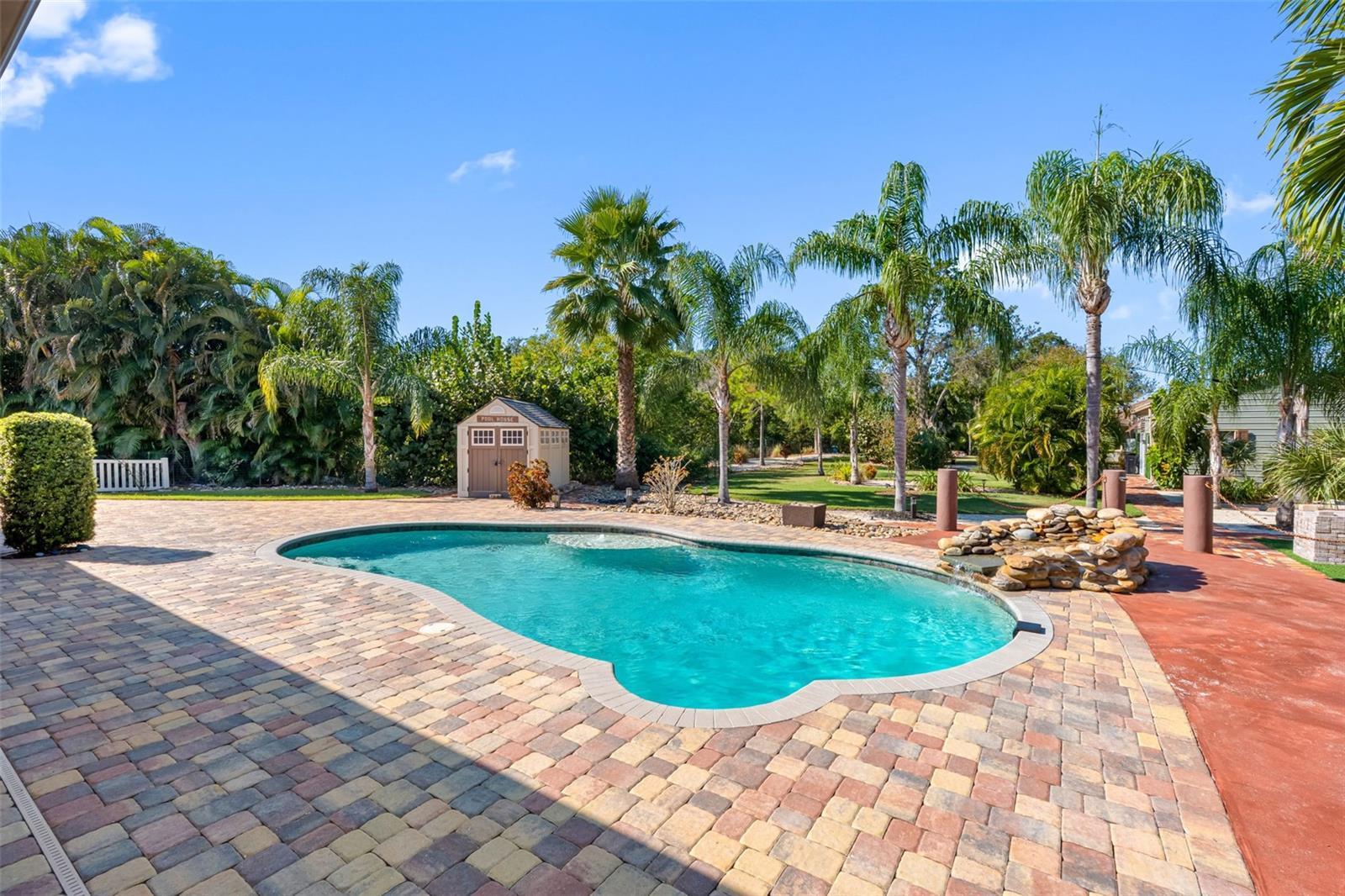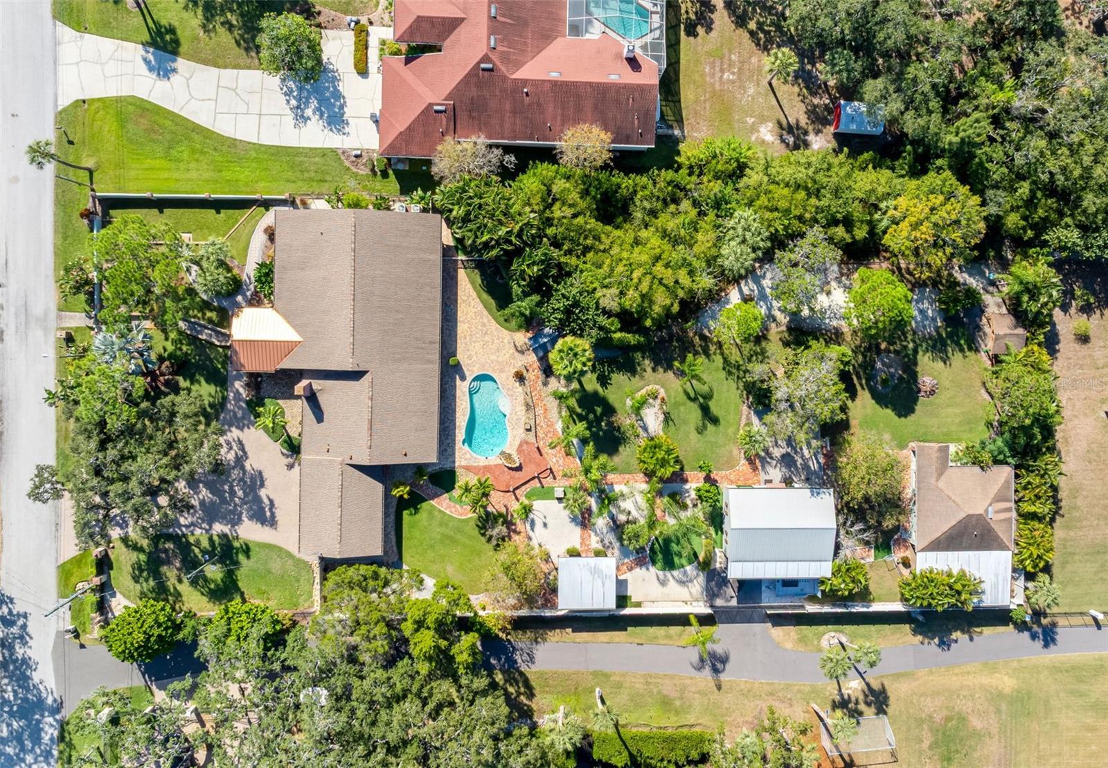 One or more photo(s) has been virtually staged. Welcome to this unique, one-of-a-kind, executive gated estate sitting on 1.25 acres of pristine landscaping. As you enter the home you are greeted by a large foyer with plenty of natural light. The oversized family room offers vaulted ceilings, updated custom tile flooring, updated lighting, dual ceiling fans and a stone accent wall. Just off the family room you will find an updated half bath. The kitchen has been fully remodeled including granite countertops and a custom tile backsplash, and stainless-steel appliances-a true chef’s dream. A large farmers sink with a window overlooks the rear pool area, and a center island with unique exposed granite edging complete with slide out convection microwave. An abundance of cabinets offers plenty of storage and space in the eat-in nook with custom flooring. A wood burning fireplace with a large hearth and propane option for added convenience completes this area. The main home has all bedrooms located on the first floor with an upstairs oversized bonus room (16x20), perfect for a play area, media room, home office or to use as an additional bedroom. The primary bedroom has an en-suite bathroom featuring dual sinks, granite countertops, a jetted tub with a tv and a large walk-in shower with multiple shower heads. The walk-in closet is a separate room with custom shelving, sitting area, windows allowing plenty of lighting with a door leading to an outdoor sitting area. Down the hall you will find several built-in closets for storage, two additional spacious bedrooms, and an updated full bathroom with a walk-in shower, all offering plenty of space with large windows. From the eat in kitchen you will find French doors leading to the oversized lanai with a custom crafted vaulted wood ceiling and a spa/hot tub. An oversized saltwater pool surrounded by pavers features a raised rock water spill. All the pool equipment was recently updated and includes a storage shed. This property is perfect for large gatherings and is an entertainer’s delight with brick and paver walkways throughout. A detached two-bedroom guest home with separate entrance is located at the rear of the property. Entering you will find a nice-sized living room, with a full kitchen including granite countertops, stainless steel appliances and plenty of cabinet space including a laundry closet & covered private patio area. Perfect for an in-law suite or out-of-town guests. In addition, there is a detached garage complete with air conditioning, a separate side entrance, a workout area and bathroom. A perfect retreat for a game of poker, workshop or hobby room. Just outside the sliding glass door sits a Basketball court. The main home is equipped with a tankless hot water heater and an additional water heater located in the attached 3-car garage for the kitchen and half bath. The garage has storage shelving, a wet sink with granite countertops and wood cabinets. The laundry area has a wood countertop, cabinets and a stone wall accent. The property also offers a fully screened detached building that is perfect for plants or a sitting area. The property is equipped with an RV pad with 50amp service and a 250-gallon propane tank with plenty of room for all your toys! You will notice a combination of paver walkways and brick that was originally from the streets of St. Pete. Most windows have been updated to “impact resistant”. The block walls are reinforced with concrete and makes the construction extremely strong. A must see Home!