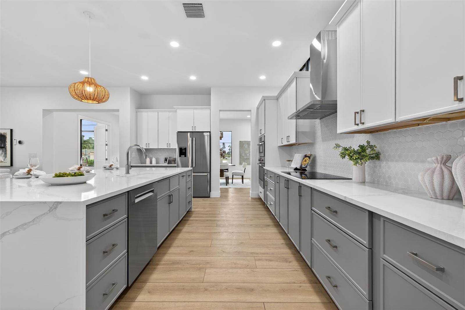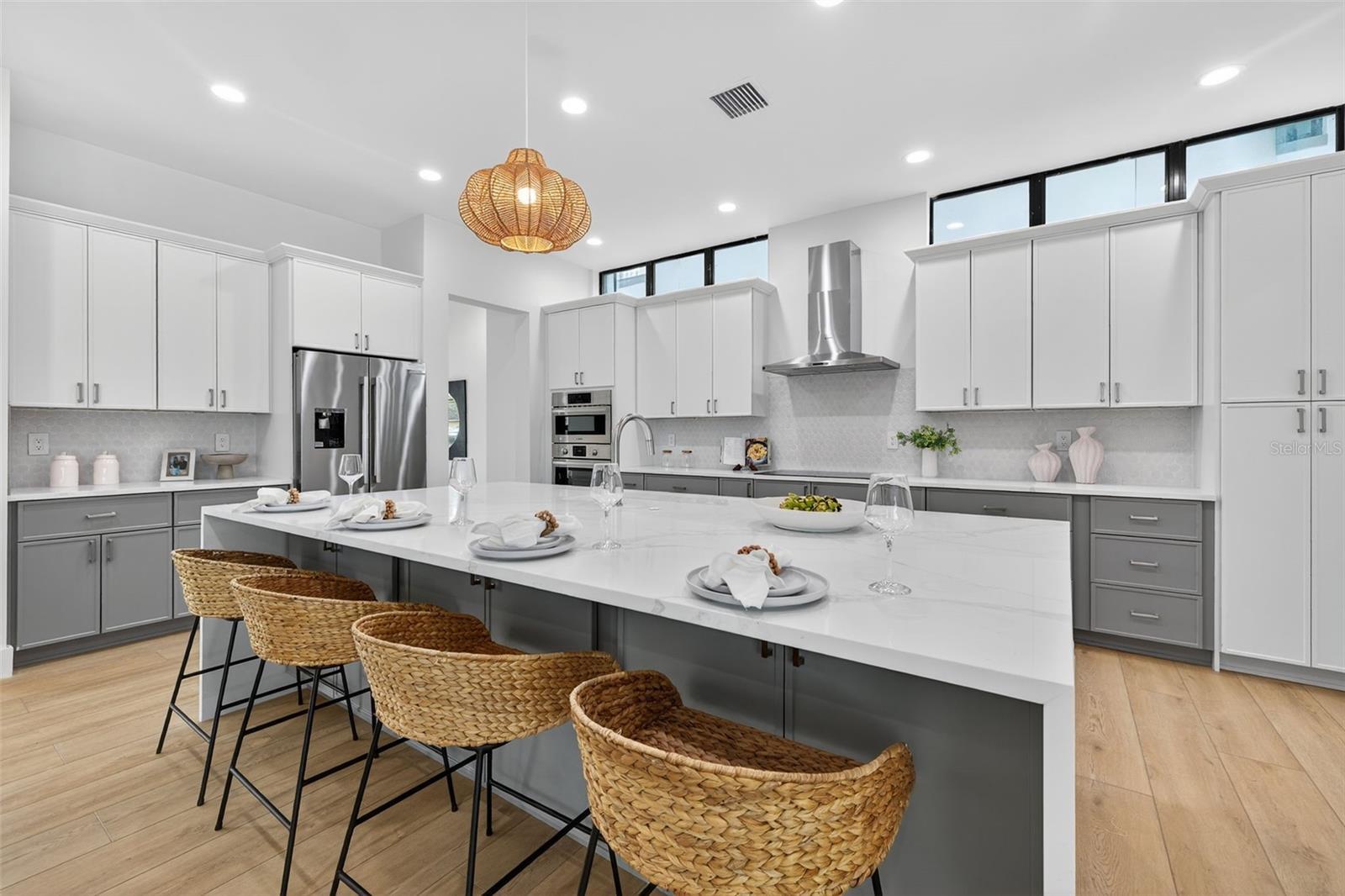 - Bar Fridge, Built-In Oven, Cooktop, Dishwasher, Disposal, Electric Water Heater, Ice Maker, Microwave, Range, Range Hood, Refrigerator, Wine Refrigerator