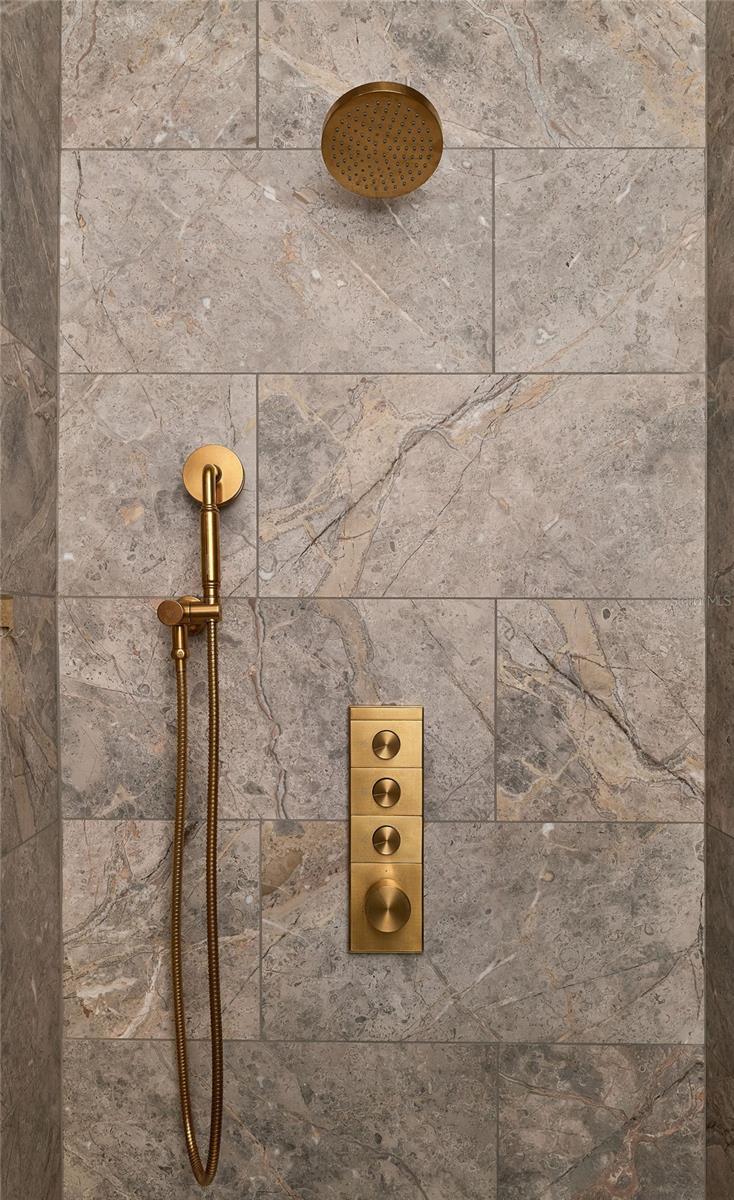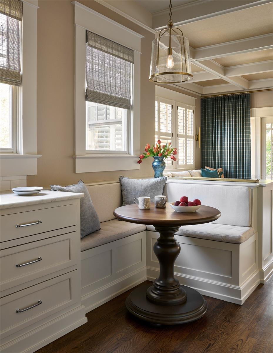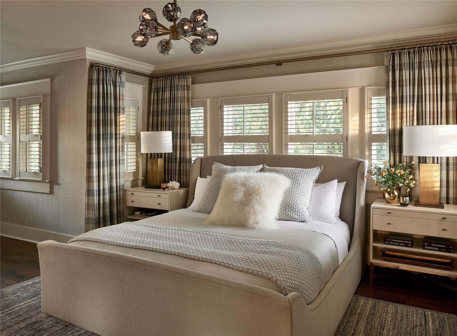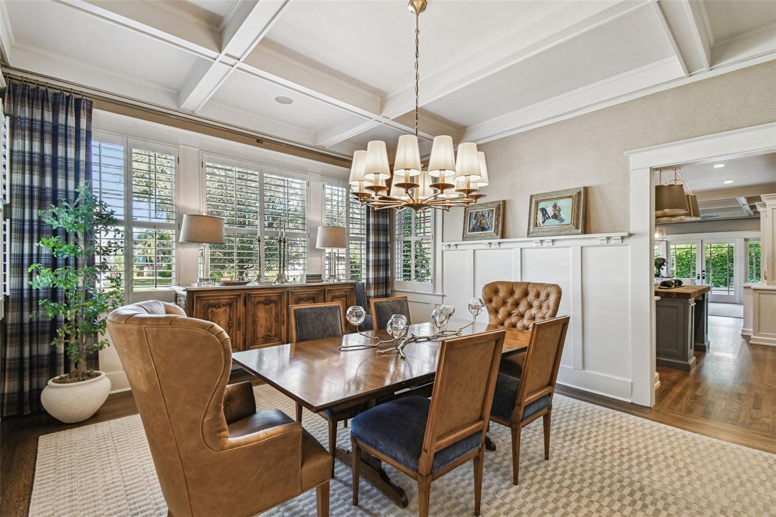 - Built-in Features, Ceiling Fans(s), Coffered Ceiling(s), Crown Molding, Eat-in Kitchen, High Ceilings, Kitchen/Family Room Combo, Primary Bedroom Main Floor, Split Bedroom, Stone Counters, Thermostat, Walk-In Closet(s), Window Treatments