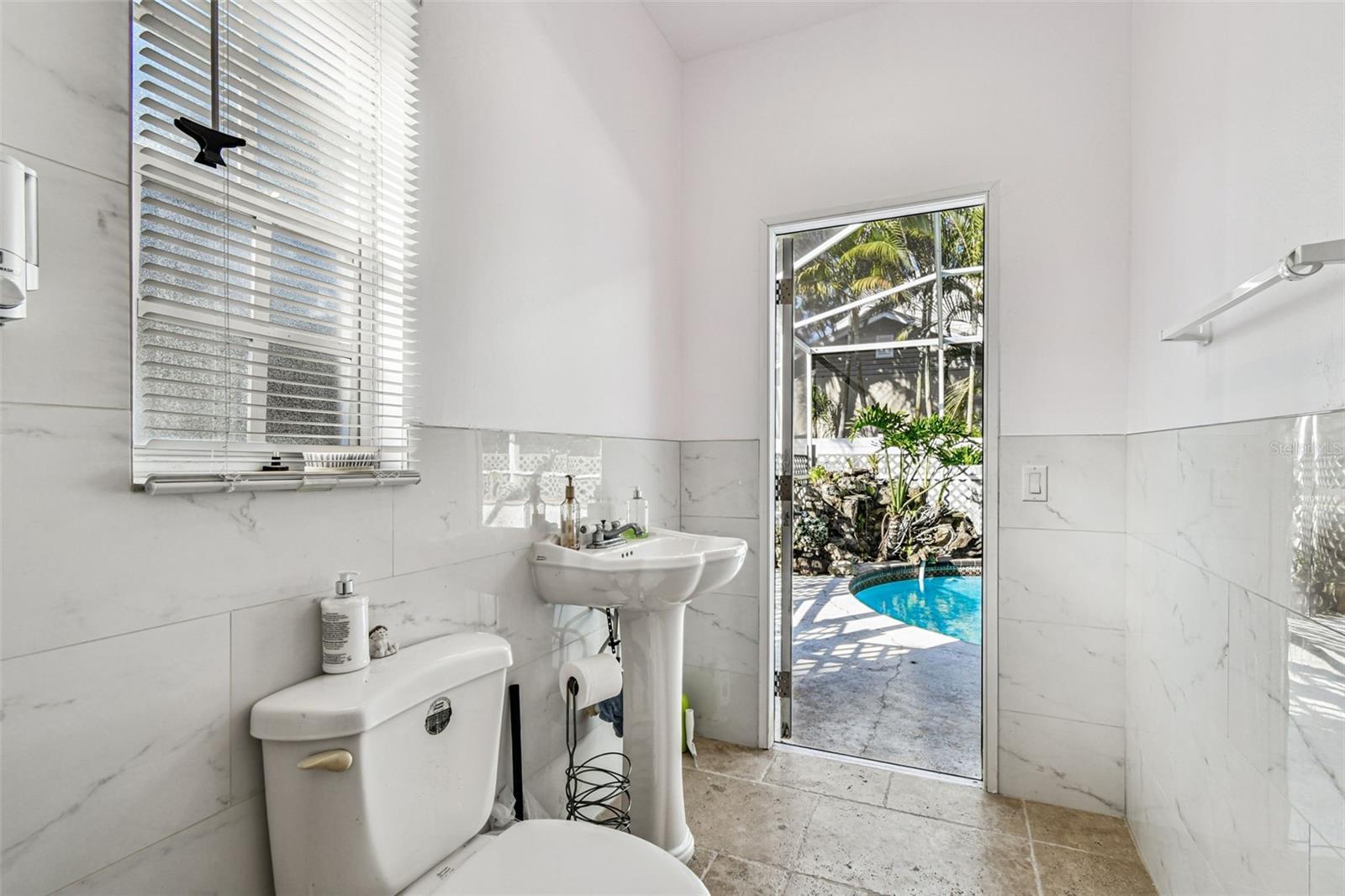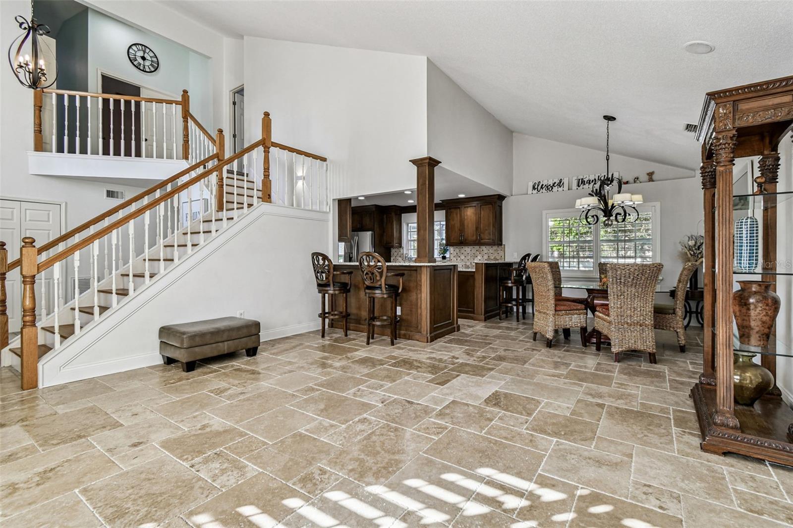 Welcome to The Woods at Lake Seminole, an established and highly desirable Seminole community. This spacious four-bedroom, three-and-one-half-bath home features an oversized two-car garage and a fully enclosed swimming pool—ideal for Florida living and entertaining. Upon entry, vaulted ceilings and a welcoming foyer create an immediate sense of openness. The living and dining room combination offers stone flooring and generous ceiling height, providing an inviting space for gatherings both large and small. The centrally located chef’s kitchen seamlessly connects the dining room, breakfast area, and family room. It is well appointed with a KitchenAid gas range, dishwasher, and refrigerator, granite countertops, wood cabinetry, a travertine backsplash, and two counter seating areas for casual dining. A pantry is conveniently tucked beneath the staircase. The breakfast area includes an under-counter refrigerator and overlooks the pool, while the adjoining family room features a gas fireplace, creating a warm and comfortable gathering space. The first floor also includes a laundry room, half bath, and direct access to the oversized garage. Upstairs, a wood staircase leads to four generously sized bedrooms, including a spacious primary suite with a large walk-in closet and an en-suite bath featuring dual vanities, a jetted soaking tub, and a separate walk-in shower. A second full bathroom serves the remaining bedrooms. The Woods at Lake Seminole offers an active HOA with community events throughout the year and is conveniently located near Gulf beaches, Tampa International Airport, and just a short drive to downtown St. Petersburg.