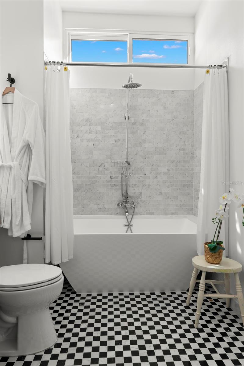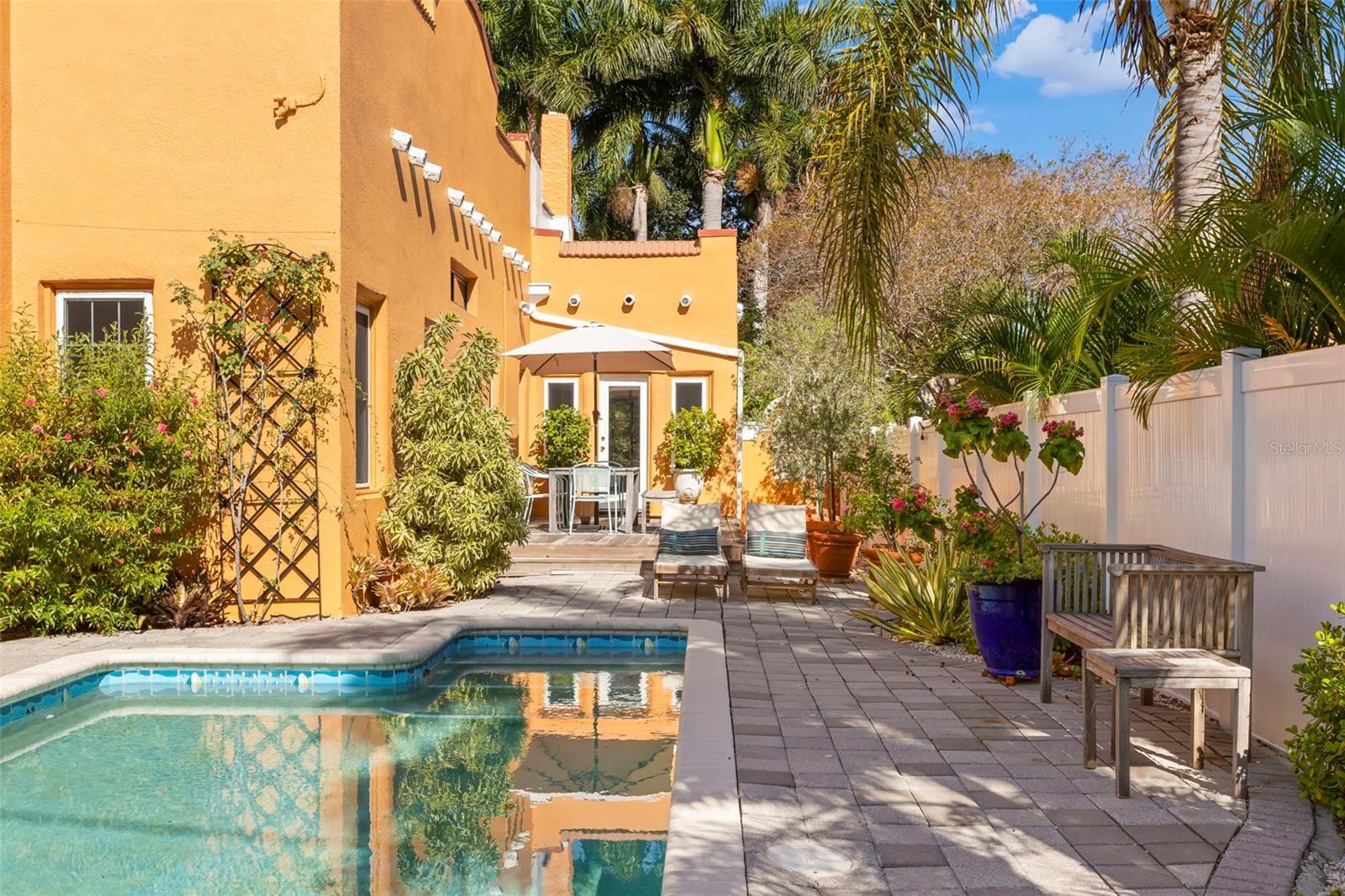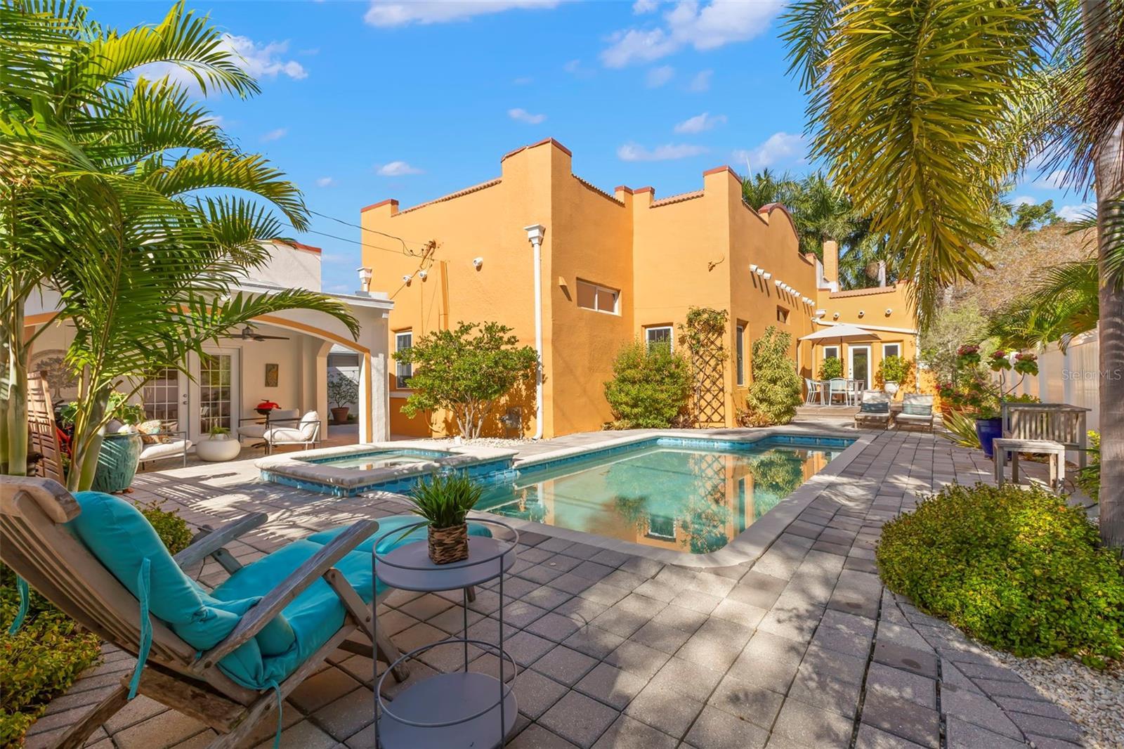 Step into the romance of Mediterranean architecture seamlessly blended with modern luxury in this stunning 1926 Spanish-style home, nestled in the heart of the sought-after Old Northeast neighborhood. Just two blocks from the waterfront and an easy stroll to downtown, this home captures the essence of St. Petersburg living—where historic charm meets vibrant city lifestyle. Inside, nearly 2,000 square feet of thoughtfully designed living space highlights the home’s original character, from the warmth of refinished hardwood floors to the inviting fireplace, and French doors opening to a Juliet balcony that beckons morning coffee or evening cocktails. The home’s floor plan feels both gracious and practical, with tall ceilings, natural light, and inviting spaces that flow effortlessly for entertaining. The kitchen was reimagined in 2023 and is now a true showpiece with custom cabinetry, designer wallpaper, a gas stove, open shelving, and statement lighting. The primary suite shines with a custom California Closet and a spa-like bathroom renovated in 2024, featuring heated floors, bespoke fixtures, and an airy layout designed for daily indulgence. Guest quarters were enhanced with a new Jack-and-Jill bath, and thoughtful touches like designer wallpaper, curated finishes make the home feel elevated and timeless. The outdoor spaces deliver an entertainer’s dream, with a sparkling pool, spa and lush tropical landscaping. The detached garage has been transformed into a stylish guest studio with loft, full bath, kitchenette, and French doors opening to a breezy covered patio with dual fans—perfect as a retreat, creative space, or guest getaway. Recent upgrades add peace of mind and efficiency, including solar panels, a new A/C system, expanded paver driveway, and redesigned tropical gardens with full irrigation. Situated in a prime X flood zone location, this home offers both historic beauty and modern convenience. With its unmatched blend of character, luxury, and location, this Old Northeast treasure is more than a home—it’s a lifestyle.